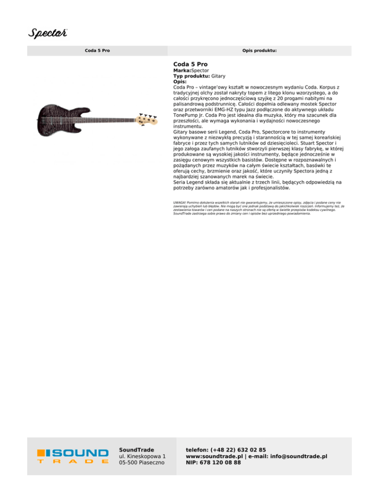 Coda 5 Pro Opis produktu: Coda 5 Pro Marka:Spector Typ produktu: Gitary Opis: Coda Pro – vintage’owy kształt w nowoczesnym wydaniu Coda. Korpus z tradycyjnej olchy został nakryty topem z litego klonu wzorzystego, a do całości przykręcono jednoczęściową szyjkę z 20 progami nabitymi na palisandrową podstrunnicę. Całości dopełnia odlewany mostek Spector oraz przetworniki EMG-HZ typu Jazz podłączone do aktywnego układu TonePump Jr. Coda Pro jest idealna dla muzyka, który ma szacunek dla przeszłości, ale wymaga wykonania i wydajności nowoczesnego instrumentu. Gitary basowe serii Legend, Coda Pro, Spectorcore to instrumenty wykonywane z niezwykłą precyzją i starannością w tej samej koreańskiej fabryce i przez tych samych lutników od dziesięcioleci. Stuart Spector i jego załoga zaufanych lutników stworzyli pierwszej klasy fabrykę, w której produkowane są wysokiej jakości instrumenty, będące jednocześnie w zasięgu cenowym wszystkich basistów. Dostępne w rozpoznawalnych i pożądanych przez muzyków na całym świecie kształtach, basówki te oferują cechy, brzmienie oraz jakość, które uczyniły Spectora jedną z najbardziej szanowanych marek na świecie. Seria Legend składa się aktualnie z trzech linii, będących odpowiedzią na potrzeby zarówno amatorów jak i profesjonalistów. UWAGA! Pomimo dołożenia wszelkich starań nie gwarantujemy, że umieszczone opisy, zdjęcia i podane ceny nie zawierają uchybień lub błędów. Nie mogą być one jednak podstawą do jakichkolwiek roszczeń. Informujemy też, że zestawienia towarów i cen podane na naszych stronach nie są ofertą w świetle przepisów kodeksu cywilnego. SoundTrade zastrzega sobie prawo do zmiany cen i opisów bez uprzedniego powiadomienia. SoundTrade ul. Kineskopowa 1 05-500 Piaseczno telefon: (+48 22) 632 02 85 www:soundtrade.pl | e-mail: [email protected] NIP: 678 120 08 88