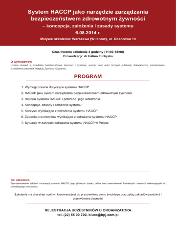 System HACCP jako narzędzie zarządzania bezpieczeństwem zdrowotnym żywności – koncepcja, założenia i zasady systemu 6.08.2014 r. Miejsce szkolenia: Warszawa (Wilanów), ul. Resorowa 10 Czas trwania szkolenia 4 godziny (11:00-15:00) Prowadzący: dr Halina Turlejska O wykładowcy: Uznany ekspert w dziedzinie bezpieczeństwa żywności i żywienia, audytor oraz autor licznych publikacji, doświadczony szkoleniowiec; b. wieloletni pracownik Instytutu Żywności i Żywienia. PROGRAM 1. Wymogi prawne dotyczące systemu HACCP 2. HACCP jako system zarządzania bezpieczeństwem zdrowotnym żywności 3. Historia systemu HACCP i potrzeba jego wdrażania 4. Koncepcja, zasady i założenia systemu 5. Korzyści wynikające z wdrożenia systemu HACCP 6. Zadania pracowników wynikające z wdrażania systemu HACCP 7. Sytuacja w zakresie wdrażania systemu HACCP w Polsce Cel szkolenia: Zaprezentowanie założeń i koncepcji systemu HACCP, jego głównych zasad, celów oraz uwarunkowań formalnych i realnych wskazujących na potrzebę jego stosowania. Szkolenie ma charakter ogólny i kierowane jest do pracowników pionu średniego oraz załóg zakładów produkcji i przetwórstwa żywności REJESTRACJA UCZESTNIKÓW U ORGANIZATORA tel. (22) 55 00 700, [email protected] ZGŁOSZENIE UDZIAŁU System HACCP jako narzędzie zarządzania bezpieczeństwem zdrowotnym żywności – koncepcja, założenia i zasady systemu 6.08.2014 r. Miejsce szkolenia: Warszawa (Wilanów), ul. Resorowa 10 I. Dane uczestnika: A/ imię i nazwisko uczestnika: ............................................................................... stanowisko: ........................................................... B/ imię i nazwisko uczestnika: ............................................................................... stanowisko: ........................................................... C/ imię i nazwisko uczestnika: ............................................................................... stanowisko: ........................................................... II. Dane nabywcy potrzebne do wystawienia faktury VAT: 1. Pełna nazwa firmy: ............................................................................................................................................................................. 2. Adres firmy: ......................................................................................................................................................................................... 3. Telefon: ................................................... Fax: ........................................................... e-mail: ............................................................ 4. NIP: ..................................................................................................................................................................................................... III. Opłata za udział w szkoleniu jednej osoby obejmuje: • prelekcję, materiały szkoleniowe, przerwy kawowe, ciastka oraz świadectwo ukończenia szkolenia. □ 350 zł x liczba osób …..................... = ….............................. zł + 23% VAT IV. Warunki uczestnictwa: 1. Podstawą do wzięcia udziału w szkoleniu jest wypełnienie i przesłanie niniejszego zgłoszenia faxem lub e-mailem na adres organizatora. 2. Przesłanie do Biura Promocji Jakości Sp. z o.o. wypełnionego i podpisanego formularza zgłoszeniowego stanowi zawarcie wiążącej umowy pomiędzy zgłaszającym a Biurem Promocji Jakości. Faktura pro forma jest standardowo wystawiana i wysyłana e-mailem lub faxem po otrzymaniu formularza zgłoszeniowego. 3. Prosimy o dokonanie wpłaty w terminie 14 dni od wysłania zgłoszenia, ale nie później niż dzień przed rozpoczęciem szkolenia. 4. Wpłaty należy dokonać na konto: Biuro Promocji Jakości Sp. z o.o. – BPJ Bank Millennium: 59 1160 2202 0000 0000 4947 8666 5. W przypadku pisemnej rezygnacji z uczestnictwa w terminie do 14 dni przed dniem szkolenia, uczestnik zobowiązany jest do uiszczenia opłaty manipulacyjnej w wysokości 20% opłaty za udział w szkoleniu + 23% VAT. 6. W przypadku pisemnej rezygnacji z uczestnictwa w terminie późniejszym niż 14 dni lub braku udziału w szkoleniu, uczestnik zobowiązany jest do uiszczenia pełnej kwoty wynikającej z przesłanego zgłoszenia. 7. Nieodwołanie zgłoszenia powoduje obciążenie pełnymi kosztami udziału w szkoleniu. 8. Niedokonanie wpłaty nie jest jednoznaczne z rezygnacją z udziału w szkoleniu. 9. Po wcześniejszym uzgodnieniu z organizatorem istnieje możliwość zmiany osoby zgłoszonej do udziału w szkoleniu. 10. Organizator zastrzega sobie prawo do zmian w programie oraz zmiany terminu lub odwołania szkolenia. 11. W przypadku wyczerpania liczby miejsc lub odwołania szkolenia z winy organizatora, uczestnikowi zwrócona zostanie cała kwota wpłaty. Zgodnie z ustawą z dnia 29 sierpnia 1997 r. o ochronie danych osobowych (Dz.U. 1997 r. Nr 133 poz. 833) Biuro Promocji Jakości Sp. z o.o. z siedzibą w Warszawie (dalej BPJ), informuje, że jest administratorem danych osobowych. Wyrażam zgodę na przetwarzanie danych osobowych w celach promocji i marketingu działalności prowadzonej przez BPJ, świadczonych usług oraz oferowanych produktów, a także w celu promocji ofert klientów BPJ. Wyrażam również zgodę na otrzymywanie drogą elektroniczną ofert oraz informacji handlowych dotyczących BPJ oraz klientów BPJ. Wyrażającemu zgodę na przetwarzanie danych osobowych przysługuje prawo kontroli przetwarzania danych, które go dotyczą, w tym także prawo ich poprawiania. Równocześnie oświadczam, że zapoznałem się z warunkami uczestnictwa oraz zobowiązuję się do zapłaty całej kwoty wynikającej z niniejszej umowy. ....................................................... miejscowość ................................................. ................................................... .............