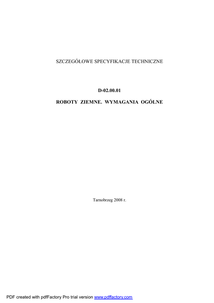 SZCZEGÓŁOWE SPECYFIKACJE TECHNICZNE D-02.00.01 ROBOTY ZIEMNE. WYMAGANIA OGÓLNE Tarnobrzeg 2008 r. PDF created with pdfFactory Pro trial version www.pdffactory.com D-02.00.01 Roboty ziemne. Wymagania ogólne 2 1. WSTĘP 1.1. Przedmiot SST Przedmiotem niniejszej szczegółowej specyfikacji technicznej (SST) są wymagania dotyczące wykonania i odbioru liniowych robót ziemnych, które zostaną wykonane w ramach: przebudowy drogi gminnej nr 100119 R (ulica Działkowców) w Gorzycach. 1.2. Zakres stosowania SST Szczegółowa specyfikacja techniczna (SST) jest stosowana jako dokument przetargowy i kontraktowy i należy ją stosować w zlecaniu i wykonaniu robót opisanych w podpunkcie 1.1. 1.3. Zakres robót objętych SST Ustalenia zawarte w niniejszej specyfikacji dotyczą zasad prowadzenia robót ziemnych w czasie budowy lub modernizacji dróg. 1.4. Określenia podstawowe 1.4.1. Budowla ziemna - budowla wykonana w gruncie lub z gruntu albo rozdrobnionych odpadów przemysłowych, spełniająca warunki stateczności i odwodnienia. 1.4.2. Korpus drogowy - nasyp lub ta część wykopu, która jest ograniczona koroną drogi i skarpami rowów. 1.4.3. Wysokość nasypu lub głębokość wykopu - różnica rzędnej terenu i rzędnej robót ziemnych, wyznaczonych w osi nasypu lub wykopu. 1.4.4. Nasyp niski - nasyp, którego wysokość jest mniejsza niż 1 m. 1.4.5. Nasyp średni - nasyp, którego wysokość jest zawarta w granicach od 1 do 3 m. 1.4.6. Nasyp wysoki - nasyp, którego wysokość przekracza 3 m. 1.4.7. Wykop płytki - wykop, którego głębokość jest mniejsza niż 1 m. 1.4.8. Wykop średni - wykop, którego głębokość jest zawarta w granicach od 1 do 3 m. 1.4.9. Wykop głęboki - wykop, którego głębokość przekracza 3 m. 1.4.10. Bagno - grunt organiczny nasycony wodą, o małej nośności, charakteryzujący się znacznym i długotrwałym osiadaniem pod obciążeniem. 1.4.11. Grunt skalisty - grunt rodzimy, lity lub spękany o nieprzesuniętych blokach, którego próbki nie wykazują zmian objętości ani nie rozpadają się pod działaniem wody destylowanej; mają wytrzymałość na ściskanie Rc ponad 0,2 MPa; wymaga użycia środków wybuchowych albo narzędzi pneumatycznych lub hydraulicznych do odspojenia. 1.4.12. Ukop - miejsce pozyskania gruntu do wykonania nasypów, położone w obrębie pasa robót drogowych. 1.4.13. Dokop - miejsce pozyskania gruntu do wykonania nasypów, położone poza pasem robót drogowych. 1.4.14. Odkład - miejsce wbudowania lub składowania (odwiezienia) gruntów pozyskanych w czasie wykonywania wykopów, a nie wykorzystanych do budowy nasypów oraz innych prac związanych z trasą drogową. 1.4.15. Wskaźnik zagęszczenia gruntu - wielkość charakteryzująca stan zagęszczenia gruntu, określona wg wzoru: Is = gdzie: ρd ρds - ρd ρ ds gęstość objętościowa szkieletu zagęszczonego gruntu, (Mg/m3), maksymalna gęstość objętościowa szkieletu gruntowego przy wilgotności optymalnej, określona w normalnej próbie Proctora, zgodnie z PN-B-04481 [2], służąca do oceny zagęszczenia gruntu w robotach ziemnych, badana zgodnie z normą BN-77/8931-12 [7], (Mg/m3). 1.4.16. Wskaźnik różnoziarnistości - wielkość charakteryzująca zagęszczalność gruntów niespoistych, określona wg wzoru: U= gdzie: d60 - d 60 d10 średnica oczek sita, przez które przechodzi 60% gruntu, (mm), PDF created with pdfFactory Pro trial version www.pdffactory.com D-02.00.01 d10 - Roboty ziemne. Wymagania ogólne 3 średnica oczek sita, przez które przechodzi 10% gruntu, (mm). 1.4.17. Pozostałe określenia podstawowe są zgodne z obowiązującymi, odpowiednimi polskimi normami i z definicjami podanymi w SST D-M-00.00.00 „Wymagania ogólne” pkt 1.4. 1.5. Ogólne wymagania dotyczące robót Ogólne wymagania dotyczące robót podano w SST D-M-00.00.00 „Wymagania ogólne” pkt 1.5. 2. MATERIAŁY (GRUNTY) 2.1. Ogólne wymagania dotyczące materiałów Ogólne wymagania dotyczące materiałów, ich pozyskiwania i składowania, podano w SST D-M-00.00.00 „Wymagania ogólne” pkt 2. 2.2. Podział gruntów Podstawę podziału gruntów i innych materiałów na kategorie pod względem trudności ich odspajania podaje tablica 1. W wymienionej tablicy określono przeciętne wartości gęstości objętościowej gruntów i materiałów w stanie naturalnym oraz współczynników spulchnienia. Podział gruntów pod względem wysadzinowości podaje tablica 2. Podział gruntów pod względem przydatności do budowy nasypów podano w SST D-02.03.01, pkt 2. 2.3. Zasady wykorzystania gruntów Grunty uzyskane przy wykonywaniu wykopów powinny być przez Wykonawcę wykorzystane w maksymalnym stopniu do budowy nasypów. Grunty przydatne do budowy nasypów mogą być wywiezione poza teren budowy tylko wówczas, gdy stanowią nadmiar objętości robót ziemnych i za zezwoleniem Inżyniera. Jeżeli grunty przydatne, uzyskane przy wykonaniu wykopów, nie będąc nadmiarem objętości robót ziemnych, zostały za zgodą Inżyniera wywiezione przez Wykonawcę poza teren budowy z przeznaczeniem innym niż budowa nasypów lub wykonanie prac objętych kontraktem, Wykonawca jest zobowiązany do dostarczenia równoważnej objętości gruntów przydatnych ze źródeł własnych, zaakceptowanych przez Inżyniera. Grunty i materiały nieprzydatne do budowy nasypów, określone w SST D-02.03.01, pkt 2.4, powinny być wywiezione przez Wykonawcę na odkład. Zapewnienie terenów na odkład należy do obowiązków Zamawiającego, o ile nie określono tego inaczej w kontrakcie. Inżynier może nakazać pozostawienie na terenie budowy gruntów, których czasowa nieprzydatność wynika jedynie z powodu zamarznięcia lub nadmiernej wilgotności. PDF created with pdfFactory Pro trial version www.pdffactory.com D-02.00.01 Roboty ziemne. Wymagania ogólne 4 Tablica 1. Podział gruntów i innych materiałów na kategorie wg [8] Kategoria 1 2 3 Rodzaj i charakterystyka gruntu lub materiału Pias