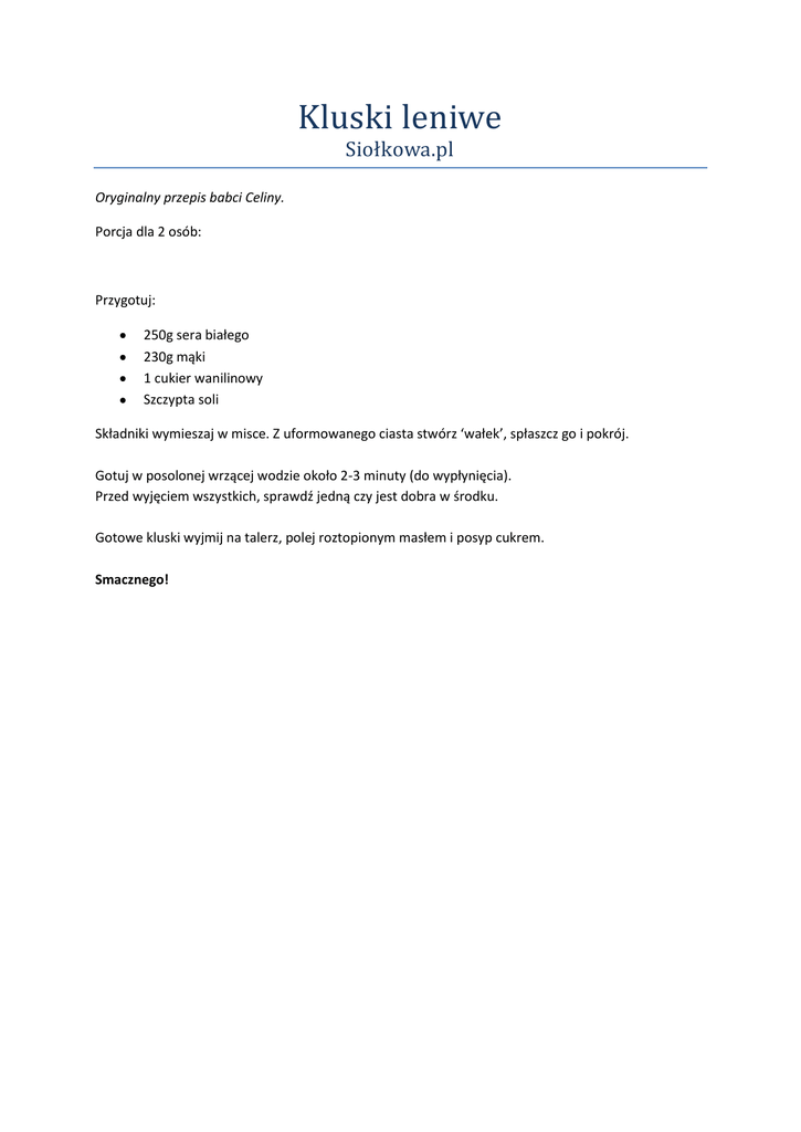 Kluski leniwe Siołkowa.pl Oryginalny przepis babci Celiny. Porcja dla 2 osób: Przygotuj: 250g sera białego 230g mąki 1 cukier wanilinowy Szczypta soli Składniki wymieszaj w misce. Z uformowanego ciasta stwórz ‘wałek’, spłaszcz go i pokrój. Gotuj w posolonej wrzącej wodzie około 2-3 minuty (do wypłynięcia). Przed wyjęciem wszystkich, sprawdź jedną czy jest dobra w środku. Gotowe kluski wyjmij na talerz, polej roztopionym masłem i posyp cukrem. Smacznego!