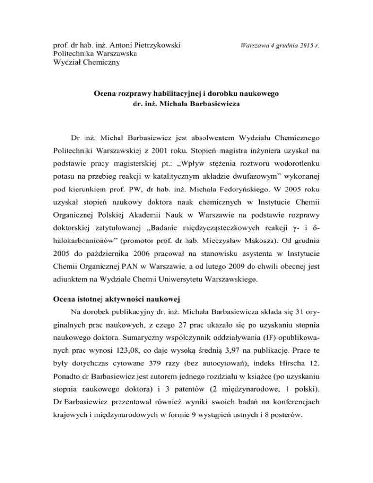 prof. dr hab. inż. Antoni Pietrzykowski Politechnika Warszawska Wydział Chemiczny Warszawa 4 grudnia 2015 r. Ocena rozprawy habilitacyjnej i dorobku naukowego dr. inż. Michała Barbasiewicza Dr inż. Michał Barbasiewicz jest absolwentem Wydziału Chemicznego Politechniki Warszawskiej z 2001 roku. Stopień magistra inżyniera uzyskał na podstawie pracy magisterskiej pt.: „Wpływ stężenia roztworu wodorotlenku potasu na przebieg reakcji w katalitycznym układzie dwufazowym” wykonanej pod kierunkiem prof. PW, dr hab. inż. Michała Fedoryńskiego. W 2005 roku uzyskał stopień naukowy doktora nauk chemicznych w Instytucie Chemii Organicznej Polskiej Akademii Nauk w Warszawie na podstawie rozprawy doktorskiej zatytułowanej „Badanie międzycząsteczkowych reakcji γ- i δhalokarboanionów” (promotor prof. dr hab. Mieczysław Mąkosza). Od grudnia 2005 do października 2006 pracował na stanowisku asystenta w Instytucie Chemii Organicznej PAN w Warszawie, a od lutego 2009 do chwili obecnej jest adiunktem na Wydziale Chemii Uniwersytetu Warszawskiego. Ocena istotnej aktywności naukowej Na dorobek publikacyjny dr. inż. Michała Barbasiewicza składa się 31 oryginalnych prac naukowych, z czego 27 prac ukazało się po uzyskaniu stopnia naukowego doktora. Sumaryczny współczynnik oddziaływania (IF) opublikowanych prac wynosi 123,08, co daje wysoką średnią 3,97 na publikację. Prace te były dotychczas cytowane 379 razy (bez autocytowań), indeks Hirscha 12. Ponadto dr Barbasiewicz jest autorem jednego rozdziału w książce (po uzyskaniu stopnia naukowego doktora) i 3 patentów (2 międzynarodowe, 1 polski). Dr Barbasiewicz prezentował również wyniki swoich badań na konferencjach krajowych i międzynarodowych w formie 9 wystąpień ustnych i 8 posterów. Dr Barbasiewicz umiejętnie zdobywa fundusze na działalność naukową. Był kierownikiem projektu badawczego Fundacji na Rzecz Nauki Polskiej w ramach programu „Powroty Homing” w latach 2008 – 2011, projektu badawczego własnego MNiSW w latach 2009 – 2012 oraz projektu badawczego dla młodych naukowców Iuventus Plus w latach 2010 – 2011. Obecnie kieruje dwoma projektami NCN w ramach programów Iuventus Plus (realizacja w latach 2013 – 2015) oraz SONATA BIS (2014 – 2019). Łączna wartość tych projektów to prawie 2 350 000 zł. Aktywność dr. Barbasiewicza w tym obszarze działalności naukowej należy ocenić jako wyróżniającą. Dr Barbasiewicz jest laureatem stypendium Uniwersytetu Warszawskiego w ramach programu "Nowoczesny Uniwersytet" dla młodych doktorów. Działalność naukową dr. inż. Michała Barbasiewicza oceniam bardzo wysoko. Spełnia on, w moim przekonaniu, w pełni kryteria dla osób ubiegających się o stopień naukowy doktora habilitowanego. Publikuje w bardzo dobrych i dobrych czasopismach, umiejętnie łączy badania podstawowe i aplikacyjne. Ważnym elementem rozwoju młodego pracownika nauki, poszerzającym jego wiedzę, umiejętności i horyzonty myślowe są staże podoktorskie w dobrych ośrodkach za granicą. Dr Barbasiewicz, w okresie od listopada 2006 do sierpnia 2008, odbył taki staż w ramach stypendium Fundacji Humboldta, w grupie badawczej znakomitego chemika, prof. Johna Gladysza na Uniwersytecie w Erlangen-Nürnberg, Niemcy. Ocena jednotematycznego cyklu publikacji „Od efektów elektronowych do modelu konformacyjnego – Nowe koncepcje w projektowaniu kompleksów typu Hoveydy-Grubbsa” Podstawą wniosku habilitacyjnego dr. inż. Michała Barbasiewicza jest jednotematyczny cykl publikacji zatytułowany „Od efektów elektronowych do modelu konformacyjnego – Nowe koncepcje w projektowaniu kompleksów typu Hoveydy-Grubbsa”. Cykl ten składa się z 9 prac opublikowanych w latach 2012 – 2015, których autorem i współautorem jest Habilitant. Pierwsza pozycja tego cyklu to monoautorski rozdział w obszernej monografii na temat metatezy olefin, wydanej w 2014 roku przez John Wiley & Sons, Inc. Rozdział ten jest świetną 2 pracą przeglądową na temat rozwoju rutenowych katalizatorów metatezy olefin typu Hoveydy i jest bardzo dobrym uzasadnieniem wyboru przez Habilitanta tematyki jego badań. Wszystkie pozostałe prace są pracami oryginalnymi i zostały opublikowane w dobrych lub bardzo dobrych, recenzowanych czasopismach o zasięgu międzynarodowym (Chemistry - A European Journal (3 prace), Organometallics (2), Dalton Transactions (1), Applied Organometallic Chemistry (1), Journal of Organometallic Chemistry (1)), a więc uzyskały już pozytywną ocenę merytoryczną. Łączny współczynnik oddziaływania (IF) tych ośmiu prac wynosi ponad 33,9, co daje znakomitą średnią ponad 4,2 na publikację. Jedna z prac będących podstawą wniosku habilitacyjnego jest monoautorska, pozostałe 8 to prace współautorskie. W czterech z nich dr Barbasiewicz jest pierwszym autorem, a we wszystkich ośmiu autorem korespondencyjnym. Załączone w dokumentacji oświadczenia współautorów publikacji nie pozostawiają wątpliwości, że autorem koncepcji badawczej i głównym jej realizatorem był dr Michał Barbasiewicz. Udziały procentowe Habilitanta w tych pracach wynoszą od 45 do 90 %. Z uznaniem stwierdzam, że dobór prac stanowiących jednotematyczny cykl publikacji został dokonany logicznie i konsekwentnie. Przegląd literatury opublikowany w formie rozdziału w książce (publikacja H1) prezentuje stan wiedzy na temat rozwoju koncepcji projektowania układów katalitycznych metatezy olefin typu Hoveydy, ze szczególnym podkreśleniem roli rozumienia zależności aktywności katalizatora od jego budowy. Oryginalne prace badawcze Habilitanta wpisują się w ten nurt badań. Publikacje H2 do H7 prezentują syntezy nowych kompleksów rutenowych typu Hoveydy-Grubbsa z różnego typu ligandami o zróżnicowanej budowie, co pozwoliło na analizę wpływu czynników elektronowych i sterycznych na aktywność katalityczną badanych związków. Na szczególne p