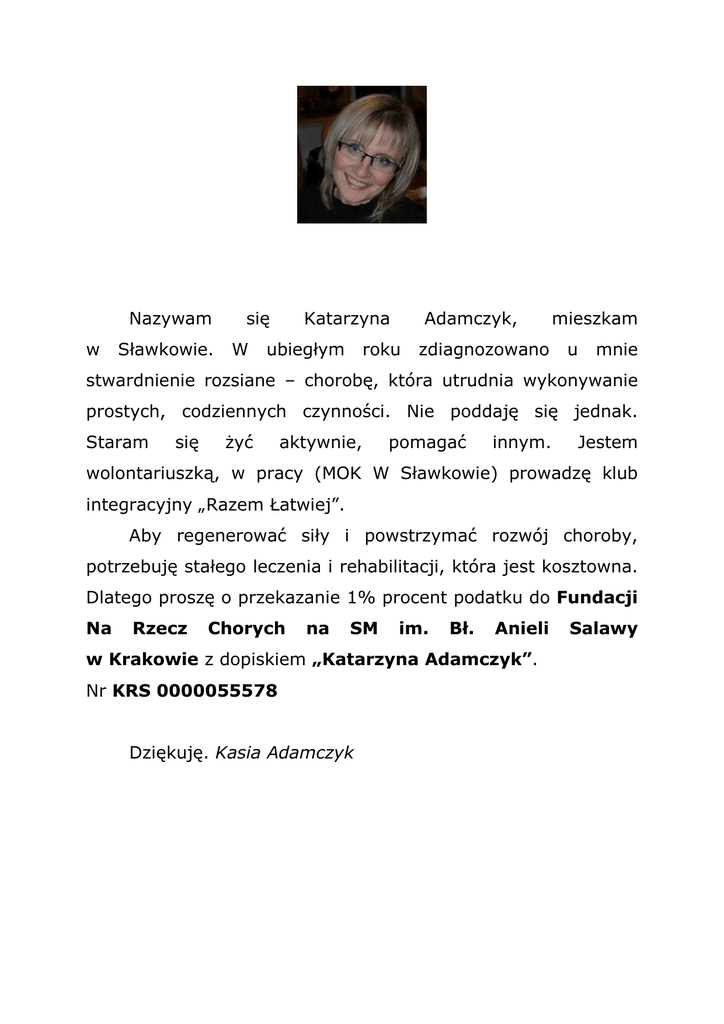 Nazywam w Sławkowie. się W Katarzyna ubiegłym Adamczyk, roku zdiagnozowano mieszkam u mnie stwardnienie rozsiane – chorobę, która utrudnia wykonywanie prostych, codziennych czynności. Nie poddaję się jednak. Staram się Ŝyć aktywnie, pomagać innym. Jestem wolontariuszką, w pracy (MOK W Sławkowie) prowadzę klub integracyjny „Razem Łatwiej”. Aby regenerować siły i powstrzymać rozwój choroby, potrzebuję stałego leczenia i rehabilitacji, która jest kosztowna. Dlatego proszę o przekazanie 1% procent podatku do Fundacji Na Rzecz Chorych na SM im. Bł. Anieli w Krakowie z dopiskiem „Katarzyna Adamczyk”. Nr KRS 0000055578 Dziękuję. Kasia Adamczyk Salawy