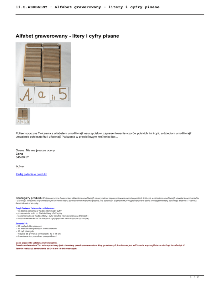 11.S.WERBALNY : Alfabet grawerowany - litery i cyfry pisane Alfabet grawerowany - litery i cyfry pisane Polisensoryczne ?wiczenia z alfabetem umo?liwiaj? nauczycielowi zaprezentowanie wzorów polskich lini i cyfr, a dzieciom umo?liwiaj? utrwalanie och kszta?tu i u?atwiaj? ?wiczenia w prawid?owym kre?leniu liter... Ocena: Nie ma jeszcze oceny Cena 345,00 z? Zadaj pytanie o produkt Szczegó?y produktu Polisensoryczne ?wiczenia z alfabetem umo?liwiaj? nauczycielowi zaprezentowanie wzorów polskich lini i cyfr, a dzieciom umo?liwiaj? utrwalanie och kszta?tu i u?atwiaj? ?wiczenia w prawid?owym kre?leniu liter z zachowaniem kierunku pisania. Na solidnych p?ytkach HDF wygrawerowane zosta?y wszystkie litery polskiego alfabetu ??cznie z dwuznakami oraz cyfry. Przyk?adowe ?wiczenia z alfabetem : - wodzenie palcem po ?ladzie litery bad? cyfry - przesuwanie kulki po ?ladzie litery b?d? cyfry - toczenie kulki po ?ladzie litery i cyfry (p?ytka równowa?ona w d?oniach) - rozpoznawanie kszta?tu litery lub cyfry poprzez sam dotyk (oczy zakryte) Zawarto??: - 39 ma?ych liter pisanych - 39 wielkich liter pisanych z dwuznakami - 10 cyfr pisanych - ??cznie 88 p?ytek o wymiarach: 13 x 11 cm - drewniana skrzyneczka z przegródkami Cena przesy?ki ustalana indywidualnie. Przed zamówieniem Ten adres pocztowy jest chroniony przed spamowaniem. Aby go zobaczy?, konieczne jest w??czenie w przegl?darce obs?ugi JavaScript. // Termin realizacji zamówienia od 24 h do 14 dni roboczych. 1 / 2 11.S.WERBALNY : Alfabet grawerowany - litery i cyfry pisane Opinie Nikt jeszcze nie ocenia? tego produktu. 2 / 2 Powered by TCPDF (www.tcpdf.org)