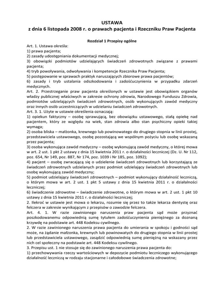 USTAWA z dnia 6 listopada 2008 r. o prawach pacjenta i Rzeczniku Praw Pacjenta Rozdział 1 Przepisy ogólne Art. 1. Ustawa określa: 1) prawa pacjenta; 2) zasady udostępniania dokumentacji medycznej; 3) obowiązki podmiotów udzielających świadczeń zdrowotnych związane z prawami pacjenta; 4) tryb powoływania, odwoływania i kompetencje Rzecznika Praw Pacjenta; 5) postępowanie w sprawach praktyk naruszających zbiorowe prawa pacjentów; 6) zasady i tryb ustalania odszkodowania i zadośćuczynienia w przypadku zdarzeń medycznych. Art. 2. Przestrzeganie praw pacjenta określonych w ustawie jest obowiązkiem organów władzy publicznej właściwych w zakresie ochrony zdrowia, Narodowego Funduszu Zdrowia, podmiotów udzielających świadczeń zdrowotnych, osób wykonujących zawód medyczny oraz innych osób uczestniczących w udzielaniu świadczeń zdrowotnych. Art. 3. 1. Użyte w ustawie określenia oznaczają: 1) opiekun faktyczny – osobę sprawującą, bez obowiązku ustawowego, stałą opiekę nad pacjentem, który ze względu na wiek, stan zdrowia albo stan psychiczny opieki takiej wymaga; 2) osoba bliska – małżonka, krewnego lub powinowatego do drugiego stopnia w linii prostej, przedstawiciela ustawowego, osobę pozostającą we wspólnym pożyciu lub osobę wskazaną przez pacjenta; 3) osoba wykonująca zawód medyczny – osobę wykonującą zawód medyczny, o której mowa w art. 2 ust. 1 pkt 2 ustawy z dnia 15 kwietnia 2011 r. o działalności leczniczej (Dz. U. Nr 112, poz. 654, Nr 149, poz. 887, Nr 174, poz. 1039 i Nr 185, poz. 1092); 4) pacjent – osobę zwracającą się o udzielenie świadczeń zdrowotnych lub korzystającą ze świadczeń zdrowotnych udzielanych przez podmiot udzielający świadczeń zdrowotnych lub osobę wykonującą zawód medyczny; 5) podmiot udzielający świadczeń zdrowotnych – podmiot wykonujący działalność leczniczą, o którym mowa w art. 2 ust. 1 pkt 5 ustawy z dnia 15 kwietnia 2011 r. o działalności leczniczej; 6) świadczenie zdrowotne – świadczenie zdrowotne, o którym mowa w art. 2 ust. 1 pkt 10 ustawy z dnia 15 kwietnia 2011 r. o działalności leczniczej; 2. Ilekroć w ustawie jest mowa o lekarzu, rozumie się przez to także lekarza dentystę oraz felczera w zakresie wynikającym z przepisów o zawodzie felczera. Art. 4. 1. W razie zawinionego naruszenia praw pacjenta sąd może przyznać poszkodowanemu odpowiednią sumę tytułem zadośćuczynienia pieniężnego za doznaną krzywdę na podstawie art. 448 Kodeksu cywilnego. 2. W razie zawinionego naruszenia prawa pacjenta do umierania w spokoju i godności sąd może, na żądanie małżonka, krewnych lub powinowatych do drugiego stopnia w linii prostej lub przedstawiciela ustawowego, zasądzić odpowiednią sumę pieniężną na wskazany przez nich cel społeczny na podstawie art. 448 Kodeksu cywilnego. 3. Przepisu ust. 1 nie stosuje się do zawinionego naruszenia prawa pacjenta do: 1) przechowywania rzeczy wartościowych w depozycie podmiotu leczniczego wykonującego działalność leczniczą w rodzaju stacjonarne i całodobowe świadczenia zdrowotne; 2) informacji o rodzaju i zakresie świadczeń zdrowotnych udzielanych przez podmioty udzielające świadczeń zdrowotnych; 3) dostępu do dokumentacji medycznej dotyczącej jego stanu zdrowia; 4) zgłaszania działań niepożądanych produktów leczniczych. Art. 5. Kierownik podmiotu udzielającego świadczeń zdrowotnych lub upoważniony przez niego lekarz może ograniczyć korzystanie z praw pacjenta w przypadku wystąpienia zagrożenia epidemicznego lub ze względu na bezpieczeństwo zdrowotne pacjentów, a w przypadku praw, o których mowa w art. 33 ust. 1, także ze względu na możliwości organizacyjne podmiotu. Rozdział 2 Prawo pacjenta do świadczeń zdrowotnych Art. 6. 1. Pacjent ma prawo do świadczeń zdrowotnych odpowiadających wymaganiom aktualnej wiedzy medycznej. 2. Pacjent ma prawo, w sytuacji ograniczonych możliwości udzielenia odpowiednich świadczeń zdrowotnych, do przejrzystej, obiektywnej, opartej na kryteriach medycznych, procedury ustalającej kolejność dostępu do tych świadczeń. 3. Pacjent ma prawo żądać, aby udzielający mu świadczeń zdrowotnych: 1) lekarz zasięgnął opinii innego lekarza lub zwołał konsylium lekarskie; 2) pielęgniarka (położna) zasięgnęła opinii innej pielęgniarki (położnej). 4. Lekarz może odmówić zwołania konsylium lekarskiego lub zasięgnięcia opinii innego lekarza, jeżeli uzna, że żądanie, o którym mowa w ust. 3, jest bezzasadne. 5. Żądanie, o którym mowa w ust. 3, oraz odmowę, o której mowa w ust. 4, odnotowuje się w dokumentacji medycznej. 6. Przepisy ust. 4 i 5 stosuje się do pielęgniarki (położnej) w zakresie zasięgania opinii innej pielęgniarki (położnej). Art. 7. 1. Pacjent ma prawo do natychmiastowego udzielenia świadczeń zdrowotnych ze względu na zagrożenie zdrowia lub życia. 2. W przypadku porodu pacjentka ma prawo do uzyskania świadczeń zdrowotnych związanych z porodem. Art. 8. Pacjent ma prawo do świadczeń zdrowotnych udzielanych z należytą starannością przez podmioty udzielające świadczeń zdrowotnych w warunkach odpowiadających określonym w odrębnych przepisach wymaganiom fachowym i sanitarnym. Przy udzielaniu świadczeń zdrowotnych osoby wykonujące zawód medyczny kierują się zasadami etyki zawodowej określonymi przez właściwe samorządy zawodów medycznych. Rozdział 3 Prawo pacjenta do informacji Art. 9. 1. Pacjent ma prawo do informacji o swoim stanie zdrowia. 2. Pacjent, w tym małoletni, który ukończył 16 lat, lub jego ustawowy przedstawiciel mają prawo do uzyskania od lekarza przystępnej informacji o stanie zdrowia pacjenta, rozpoznaniu, proponowanych oraz możliwych metodach diagnostycznych i leczniczych, dających się przewidzieć następstwach ich zastosowania albo zaniechania, wynikach leczenia oraz rokowaniu. 3. Pacjent lub jego ustawowy przedstawiciel mają praw