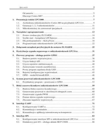 Spis treści 3 Od autorów ...................................................................................................................................... 5 Dlaczego Cortex-M0? ................................................................................................................. 6 1. Prezentacja rodzin LPC1000 .............................................................................................................. 7 1.1. 1.2. 1.3. Architektura mikrokontrolerów Cortex-M0 na przykładzie LPC1114 ..................... 9 Generacje 1, 2, 3 mikrokontrolerów .................................................................................... 11 Mikrokontrolery do zastosowań specjalnych ................................................................... 12 2. Narzędzia i oprogramowanie ............................................................................................................ 13 2.1. 2.2. 2.3. 2.4. Zestaw ewaluacyjny ZL32ARM ........................................................................................... 14 Szybki start – kompilator LPCXpresso .............................................................................. 16 Dla profesjonalistów – Keil µVison ..................................................................................... 18 Programowanie mikrokontrolerów LPC1000 .................................................................. 22 3. Dołączanie urządzeń peryferyjnych do zestawu ZL32ARM............................................. 25 4. Dystrybucja sygnału zegarowego w mikrokontrolerach LPC11xx ................................ 31 5. Pierwszy program – obsługa portów GPIO ............................................................................... 37 5.1. 5.2. 5.3. 5.4. 5.5. 5.6. 5.7. Budowa portów wejścia/wyjścia ........................................................................................... 38 Użycie funkcji API ..................................................................................................................... 39 Użycie rejestrów zdefiniowanych......................................................................................... 40 Zastosowanie wstawki asemblerowej ................................................................................. 41 Prosty program zapalania diody LED ................................................................................. 42 Rejestry konfiguracyjne wyprowadzeń .............................................................................. 45 GPIO – moduł KAmodLED8 ................................................................................................. 46 6. System przerwań mikrokontrolerów LPC1100 ....................................................................... 51 6.1. Przykładowy program – przerwania w GPIO .................................................................. 53 7. Bloki czasowo-licznikowe mikrokontrolerów LPC1100 ...................................................... 59 7.1. 7.2. 7.3. 7.4. 7.5. Budowa bloku czasowo-licznikowego ............................................................................... 60 Generowanie przerwań w określonych odstępach czasu ............................................. 60 Generowanie sygnału PWM .................................................................................................. 63 Pomiar okresu sygnału wejściowego................................................................................... 65 Zliczanie impulsów wejściowych ......................................................................................... 67 8. Interfejs UART ........................................................................................................................................ 71 8.1. 8.2. 8.3. Konfigurowanie UART-u ........................................................................................................ 72 Komunikacja z terminalem ..................................................................................................... 75 Komunikacja z aplikacją zainstalowaną na komputerze .............................................. 81 9. Interfejs SPI............................................................................................................................................... 83 9.1. 9.2. Konfigurowanie interfejsu SPI w mikrokontrolerach LPC11xx ............................... 84 Dodatkowy port I/O – obsługa układu MCP 23S08 ...................................................... 86 4 Spis treści 9.3. 9.4. Obsługa trójosiowego akcelerometru LIS35DE.............................................................. 90 Graficzny, monochromatyczny wyświetlacz LCD ......................................................... 94 10. Interfejs I2C ............................................................................................................................................ 101 10.1. 10.2. 10.3. 10.4. 10.5. Konfigurowanie interfejsu I2C w mikrokontrolerach LPC11xx ............................ 103 Dodatkowy port I/O – obsługa układu MCP23008 .................................................... 104 Lampka RGB – obsługa układu PCA9633 .................................................................... 107 Zegar RTC – obsługa układu M41T56C64 ..................................................................... 111 Pomiar temperatury – obsługa układu MCP9801 .........................................................116 11. Obsługa interfejsu 1-Wire ............................................................................................................... 121 11.1. Wymiana danych zgodnie z protokołem 1-Wire .......................................................... 122 11.2. Identyfikacja wielu układów na wspólnej szynie interfejsu 1-Wire ..................... 125 11.3. Pomiar temperatury po raz kolejny – obsługa układów DS18b20 ........................ 127 12. Komuni