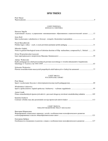 SPIS TREŚCI Piotr Mazur Wprowadzenie .....................................................................................................................................................9 CZĘŚĆ PIERWSZA EDUKACJA I HISTORIA Haтaлъa Зapyбa Адаптивный подход в управлении инновационным образованием: социологический аспект ........... 13 Jerzy Król Idea wychowania i szkolnictwa w Szwecji - związek z Kościołem Luterańskim ............................................. 21 Paweł Skrzydlewski Polskie logos i ethos – czyli, o czym powinien pamiętać polski pedagog ........................................................ 31 Miroslav Gejdoš Notes to general theological terms of christian doctrine of filip melanchton, composed by L. Stöckel .......... 53 Elvira Wojciechowska-Laszczyk Ідея територіального патріотизму Вацлава Липинського ........................................................................... 59 Adrian Watkowski Kadra pedagogiczna szkół powszechnych powiatu tczewskiego w świetle dokumentów Inspektoratu Szkolnego w Tczewie z lat 1935-1939 ............................................................................................................. 63 Sylwester Wojtowicz Prawne uwarunkowania nauczycieli pospolitych szkół ludowych w Galicji lat autonomii .............................. 77 CZĘŚĆ DRUGA WYCHOWANIE I SPORT Piotr Mazur Sport i wychowanie fizyczne w dziewiętnastowiecznej myśli pedagogicznej .................................................. 89 Włodzimierz Lukiewicz Sport a społeczeństwo: kapitał społeczny i kulturowy – wybrane zagadnienia ................................................ 95 Anton Lisnik Prínos mimoškolských športových aktivít v prevencii drogovej závislosti stredoškolskej mládeže .............. 105 Katarína Greňová Centrum voľného času ako prostriedok rozvoja športových aktivít žiakov .................................................... 113 CZĘŚĆ TRZECIA WIELOWYMIAROWOŚĆ PRACY SOCJALNEJ Виктория Шарандина Формирование социальных навыков y детей с особенностями психофизического развития в интегрированных классах общеобразовательных школ ......................................................................... 121 Екатерина Цебрук Oсобенности отношения студентов к лицам с особенностями психофизического развития ................ 127 Надежда Леонюк, Oльга Доропей Cоциально-психологическое сопровождение студентов с опфр в системе высшего образования ....... 131 Taтъянa Cоколова Формирование профессиональной направленности студентов в условиях волонтерской деятельности ......................................................................................................................................................................... 137 Halina Bejger Zmiany w polskim systemie opieki nad dzieckiem po roku 2000. .................................................................. 143 Aneta Paszkiewicz Pozycja ucznia w grupie rówieśniczej ............................................................................................................ 157 Renata Kartaszyńska Kompetencje – wymagania europejskiego rynku pracy ................................................................................. 167 CZĘŚĆ CZWARTA SYLWETKI CHEŁMSKICH PEDAGOGÓW Andrzej Rybak Stanisław Karczmarzyk (1905-1993) .............................................................................................................. 183 Paweł Kiernikowski Konstanty Ożóg (1922-2013) ......................................................................................................................... 185 CZĘŚĆ PIĄTA DOBRE PAKTYKI EDUKACYJNE Teresa Błaszczuk Przedszkole Miejskie nr 8 w Chełmie ............................................................................................................. 189 Halina Kiełb Przedszkole XXI wieku – przedszkole twórcze .............................................................................................. 195 Barbara Nizio, Augustyn Okoński Chełmskie wakacje teatralne ........................................................................................................................... 201 Małgorzata Marciniak, Wiesław Podgórski, Augustyn Okoński Edukacja dla tożsamości. Analiza działań wspierających edukację dzieci romskich w polskiej szkole – na przykładzie Zespołu Szkół Ogólnokształcących nr 7 w Chełmie ........................................................... 205 CZĘŚĆ SZÓSTA RECENZJE I SPRAWOZDANIA Beáta Akimjaková Recenzja książki Ľudmily Krajčírikovej “Didaktika výchovných činností v školských výchovno-vzdelávacích zariadeniach”, Wyd. Verbum, Ružomberok 2012 .......................................................................................... 213 Ľudmila Krajčíriková Recenzja książki Ivany Rochovskej i Boženy Švábovej “Ľudové remeslá a zvykoslovné tradície a možnosti ich využitia v primárnom vzdelávaní”, Wyd. Verbum, Ružomberok 2012 .................................................... 215 Marta Oravcová Recenzja książki Dagmary Krupovej i Ivany Rochovskej “Využívanie metód zážitkového učenia v materskej škole”, Metodicko-Pedagogické Centrum, Bratislava 2012 ........................................................................... 217 Marta Oravcová Recenzja książki Zdenki Hlaváčovej “Kompetenčný profil edukannta a edukátora 