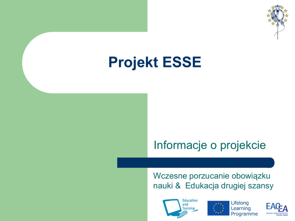 Projekt ESSE Informacje o projekcie Wczesne porzucanie obowiązku nauki & Edukacja drugiej szansy Informacje wstępne o projekcie Projekt ESSE został zainicjowany celem zbadania zagadnienia przedwczesnego porzucania obowiązku nauki oraz identyfikacji i promocji przykładów dobrych praktyk w zakresie przeciwdziałania zjawisku porzucania obowiązku nauki oraz inicjatyw umożliwiających osobom, które przerwały naukę ponowne włączenie się do procesu kształcenia na wszystkich poziomach. Projekt odpowiada na cele stawiane wszystkim państwom członkowskim UE, aby do roku 2020 wskaźnik przedwczesnego porzucania obowiązku nauki był niższy niż 10%. Obecnie waha się on od 4,9% (Słowacja) do 36,8% (Malta). Średnia w krajach UE – 14,4%. Konsorcjum projektowe składa się z 8 krajów partnerskich. Partner 1 County Meath VEC Irlandia Partner 2 AcrossLimits Malta Partner 3 Association for Education and Sustainable Development Rumunia AESD Partner 4 PROFISOUSA – Association of Vocational Education Sousa Valley Portugalia Partner 5 Uniwersytet Łódzki Polska Partner 6 Instituto de Formación ntegral, S.L.U. Hiszpania Partner 7 Juanimo Karjeros Centras Litwa Partner 8 Irlandia Podstawowe informacje Ograniczenie liczby uczniów przedwcześnie porzucających obowiązek nauki stanowi kluczową inwestycję nie tylko w ich przyszłość, ale także ogólnie w przyszłe powodzenie i spójność społeczną UE. Poprawa osiągnięć edukacyjnych młodych ludzi obejmuje cele dotyczące: – „inteligentnego rozwoju" poprzez rozwój umiejętności, – „wzrostu sprzyjającego włączeniu społecznemu” poprzez stawienie czoła jednemu z głównych czynników ryzyka bezrobocia i ubóstwa. Podstawowe informacje Pomimo znaczących działań w zakresie problematyki wczesnego porzucania obowiązku nauki i edukacji drugiej szansy, uzyskana do tej pory wiedza i osiągnięte postępy są często ignorowane w realizowanych obecnie projektach rozwojowych. Analiza i rewizja wypracowanych już narzędzi, odniesienie się do zasobów i istniejących strategii oraz identyfikacja najlepszych praktyk są konieczne dla dalszego rozwoju. Główny cel projektu • Wspieranie inteligentnego, zrównoważonego rozwoju sprzyjającego integracji i społecznej spójności poprzez zmniejszenie skali zjawiska przedwczesnego porzucania obowiązku nauki. • Partnerzy ESSE zidentyfikują i wykorzystają przykłady dobrych praktyk, które koncentrują się na zapobieganiu, interwencji i kompensacji potrzeb uczniów zagrożonych przedwczesnym porzuceniem obowiązku nauki, jak i tych, którzy taki obowiązek już zaniechali. Podstawowe informacje Kompleksowe polityki w zakresie zwalczania zjawiska przedwczesnego kończenia nauki powinny koncentrować się na zapobieganiu, interwencji i kompensacji. W projekcie dąży się do rozpoznania najlepszych praktyk w tych 3 obszarach. W ramach projektu będą prowadzone działania sprzyjające rozpoznaniu potrzeb w zakresie ciągłego wsparcia zawodowego nauczycieli w celu ułatwienia integracji modeli zapobiegania, interwencji i kompensacji. Podstawowe informacje W ramach projektu zostanie stworzone tzw. Obserwatorium, w którym udostępni się, przedstawi i omówi różne materiały dla pracowników szkół. Projekt pozwoli na promowanie najlepszych praktyk. Projekt zakłada coroczne przyznawanie nagrody tym rozwiązaniom, które zostaną uznane za najlepsze w zakresie zwalczania zjawiska przedwczesnego porzucania obowiązku nauki. Struktura Projektu Badanie Szkolenie Nauczycieli Obserwatorium online Doroczne Nagrody ESSE Trwałość efektów projektu Upowszechnianie Ocena Trwałość efektów projektu ESSE Powołana zostanie międzynarodowa grupa robocza w celu określenia możliwych mechanizmów finansowania w przyszłości Obserwatorium ESSE oraz corocznych nagród ESSE. Grupa ta oceni możliwości pozyskania wsparcia dla dorocznych nagród i sprawdzi możliwości pozyskania funduszy UE dla utrzymania konsorcjum w formie sieci ESSE. Biorąc pod uwagę doświadczenie i wiedzę partnerów ESSE, grupa ta rozpozna także możliwości uzyskania potencjalnych grantów badawczych w celu rozszerzenia prac konsorcjum. Zespół projektu ESSE w Polsce Zespół ds. badań dr hab. Joanna Madalińska-Michalak, prof. UŁ dr Aneta Rogalska-Marasińska mgr Monika Chmielecka mgr Joanna Leek Kierownik naukowy projektu mgr Marcin Rojek Joanna Madalińska-Michalak Kierownik projektu ds. administracyjno-finansowych Marcin Podogrocki