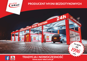 PRODUCENT MYJNI BEZDOTYKOWYCH na ry nku od 1996 roku TRADYCJA i NOWOCZESNOŚĆ www.euro-ekol.com.pl Spis treści O firmie............................................................................................ Produkcja......................................................................................... Myjnie kontenerowe..................................................................... Myjnie modułowe......................................................................... Myjnie stelażowe........................................................................... Technika myjąca............................................................................. Mobilny system zarządzania myjnią.......................................... Programy mycia.............................................................................. Systemy płatności.......................................................................... Multimedialny system startowy "Prometeusz"....................... Rozmieniarka banknotów............................................................ Wyposażenie dodatkowe............................................................ Serwis............................................................................................... Środki chemiczne do myjni.......................................................... Targi.................................................................................................. Wiaty myjni..................................................................................... Myjnie pod klucz............................................................................ Konfiguracje myjni bezdotykowych.......................................... 3 5 7 9 11 13 15 17 19 21 23 25 27 29 31 33 35 37 O firmie Firma EURO-EKOL powstała w 1996 roku i mieści się w Łodzi przy al. Piłsudskiego. Początkowo skoncentrowaliśmy się na sprzedaży myjni portalowych szczotkowych. Od 2000 roku obserwując na rynku wzrost zainteresowania bezdotykowymi myjniami samoobsługowymi postanowiliśmy zapisać nowy rozdział w funkcjonowaniu naszej firmy. Rozpoczęliśmy własną produkcję, dystrybucję, a w efekcie finalnym kompleksowe wyposażanie tych obiektów łącznie z pracami budowlano-ziemnymi. Wysokie kwalifikacje starannie dobranej załogi w połączeniu z jej wieloletnim doświadczeniem, zaowocowały powstaniem zgranego i kompetentnego zespołu produkcyjno-serwisowego wspieranego przez zespół inżynierów z działu projektowego. Gwarantujemy, że wyprodukowana i zamontowana przez nas myjnia spełni wszystkie oczekiwania stawiane przez naszych klientów, dając im pełną satysfakcję z zakupionego produktu, a nam kolejny powód do dumy z dobrze wykonanej pracy. 3 Produkcja Montaż i wyposażenie urządzeń myjących w niezbędny osprzęt odbywa się w naszym zakładzie produkcyjnym. Jest on wyposażony w nowoczesny park maszynowy, który sukcesywnie modernizujemy korzystając z programów wsparcia finansowego realizowanych przez UE. Myjnie produkowane w naszym zakładzie wyposażamy w osprzęt i podzespoły od renomowanych dostawców z całej Europy, dzięki czemu spełniają one najwyższe standardy dla tego typu urządzeń oraz odpowiadają najnowszym trendom. Wszystkie podejmowane przez nas działania wraz z wykorzystywaniem systemów informatycznych służących wspomaganiu i kontroli pracy począwszy od stadium projektu do montażu końcowego są gwarancją uzyskania wysokiej jakości wyprodukowanej przez nas myjni. 5 Myjnie kontenerowe Kontener techniczny wykonany jest w technologii ramy stalowej opartej na cynkowanej ogniowo podstawie, ściany boczne i dach wykonany jest z płyty warstwowej. Zamontowana jest w nim kompletna technika myjąca, system uzdatniania wody oraz dwufunkcyjny piec grzewczy wyposażony w system kominowy wykonany ze stali nierdzewnej oraz wydajny system wentylacji. W kontenerze zainstalowana jest kompletna rozdzielnia elektryczna oraz instalacja oświetleniowa. Kontener idealnie sprawdza się jako zaplecze myjni, może on pomieścić duży zapas środków chemicznych i akcesoriów niezbędnych na każdym obiekcie. Istnieje również możliwość wyposażenia myjni w większy kontener posiadający zaplecze socjalne. Wszystkie kontenery wykonywane są w naszym zakładzie produkcyjnym. Realizujemy zamówienia w dowolnej kolorystyce i kubaturze. 7 Myjnie modułowe Moduł techniczny myjni wykonany jest w technologii stalowej, w całości ze stali nierdzewnej AISI 304. Znajduje się w nim kompletna technika myjąca, oraz osprzęt jak w kontenerze. Wszystkie moduły wykonywane są w naszym zakładzie produkcyjnym. Również w tym przypadku realizujemy zamówienia w dowolnej kolorystyce. 9 Myjnie stelażowe Jeśli klient dysponuje pomieszczeniem, które chciałby przeznaczyć pod maszynownię, technika myjni może być umieszczona na prefabrykowanym stelażu, który jest montowany w ww. pomieszczeniu i połączony z odpowiednimi systemami i mediami. 11 Technika myjąca W naszych urządzeniach do wszystkich programów myjących używana jest woda zmiękczona. Urządzenie służące do zmiękczania wody zbudowane jest w oparciu o dwukolumnowy system sterowany cyfrowo wraz ze zbiornikami na solankę. System grzewczy myjni oparty jest o dwufunkcyjne piece gazowe lub olejowe zintegrowane z zasobnikiem gorącej wody. Piece odpowiadają zarówno za podgrzewanie wody do mycia jak i podgrzanie czynnika grzewczego systemu ogrzewania posadzki. Istnieje możliwość wzbogacenia tego systemu o instalację solarną. Wodne pompy ciśnieniowe instalowane w naszych myjniach posiadają bardzo dobre parametry pracy. Ciśnienie robocze pompy wynosi do 200 bar. Do mycia wykorzystujemy wodę podawaną z ciśnieniem około 120 bar, co stanowi 60% maksymalnego ciśnienia pracy pompy. Gwarantuje to jej długą i bezawaryjną pracę. Dozowanie chemii myjącej oraz wosku umożliwiają mieszacze ciśnieniowe Dosatron. Tworzą one niezawodny i pr