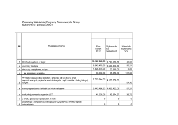 Parametry Wieloletniej Prognozy Finansowej dla Gminy Dubeninki w I półroczu 2012 r Wyszczególnienie Lp 1 Dochody ogółem, z tego: a dochody bieżące b dochody majątkowe, w tym: c ze sprzedaży majątku Plan na rok 2012 Wskażnik Wykonania %% Wykonanie na 30.06.2012 10.167.049,55 4.744.286,58 46,66 8.340.479,55 4.688.476,58 1.826.570,00 55.810,00 56,21 50.000,00 55.810,00 7.705.244,55 4.168.558,03 2 Wydatki bieżące (bez odsetek i prowizji od kredytów oraz wyemitowanych papierów wartościowych, czyli kosztów obsługi długu), w tym: a na wynagrodzenia i składki od nich naliczane 3.443.486,93 1.969.432,09 b na funkcjonowanie organów JST c z tytułu gwarancji i poręczeń, w tym: gwarancje i poręczenia podlegające wyłączeniu z limitów spłaty zobowiązań d 3,06 111,62 54,10 57,21 41.000,00 15.874,57 38,72 0 0 0 0 0 0 e wydatki bieżące objęte limitem na przedsięwzięcia 3 Wynik budżetu po zaplanowaniu wydatków bieżących (bez obsługi długu) poz.1– poz. 2 4 0 0 0 2.461.805,00 575.728,55 23,39 Nadwyżka budżetowa z lat ubiegłych + wolne środki, w tym: 0 0 0 a nadwyżka budżetowa z lat ubiegłych + wolne środki angażowane na pokrycie deficytu budżetu roku bieżącego 0 0 0 5 Inne przychody niezwiązane z zaciągnięciem długu 0 0 0 6 Środki do dyspozycji (suma poz. 3 +poz. 4+ poz. 5) 2.461.805,00 575.728,55 23,39 7 Spłata i obsługa długu, z tego: 592.474,00 88.509,68 14,94 a rozchody z tytułu spłaty rat kapitałowych oraz wykupu papierów wartościowych 522.474,00 60.549,60 11,59 b wydatki bieżące na obsługę długu: 70.000,00 27.960,08 39,94 8 Inne rozchody (bez spłaty długu) 0 0 0 9 Środki do dyspozycji na wydatki majątkowe (poz. 6–poz. 7–poz. 8) 487.218,87 26,06 4.297.381,00 25.445,00 0,59 0 0 0 2.428.050,00 0 0 0 461.773,87 - 1 326 765,48 42,03 0 0 0 0 0 0 10 Wydatki majątkowe, w tym: a wydatki majątkowe objęte limitem 11 Przychody z kredytów, pożyczek i emisji obligacji 12 Wynik finansowy budżetu (poz. 9 – poz.10 + poz. 11) 13 Kwota długu na koniec roku, w tym: łączna kwota wyłączeń z art. 243 ust. 3 pkt 1 ufp oraz art. 170 ust. 3 a sufp b kwota wyłączeń z art. 243 ust. 3 pkt 1 ufp oraz art. 170 ust. 3 sufp przypadająca na dany rok budżetowy 1.869.331,00 3. 156 .841,62 Kwota zobowiązań związku współtworzonego przez jst przypadających do spłaty w danym roku budżetowym podlegających do doliczenia z art. 14 244 ufp 20.041,00 0 0 15 Planowana łączna kwota spłaty zobowiązań 20.041,00 0 0 0 0 0 a Maksymalny dopuszczalny wskażnik spłaty z art.. 243 16 Spełnienie wskaźnika spłaty z art. 243 po uwzględnieniu art.. 244 Planowana łaczna kwota spłaty zobowiązań/dochody ogółem /max 15% 17 art.. 169 sufp/ Zadłuzenie/dochody ogółem (poz. 13-poz. 13a):poz. 1 /max. 60% art.. 170 sufp/ 18 Zgodny Zgodny Zgodny 5,12% 1,28 0 19,42% 27,97 0 7.775.244,55 4.196.518,11 53,97 20 Wydatki ogółem (poz. 10+ poz. 19) 12.072.625,55 4.221.963,11 34,97 21 Wynik budżetu (poz. 1 – poz. 20) -1.905.576,00 522.323,47 19 Wydatki bieżące razem (poz. 2 + poz. 7b) 22 Przychody budżetu 23 Rozchody budżetu (poz. 7a + poz. 8) 0 2.428.050,00 0 0 522.474,00 60.549,60 11,59