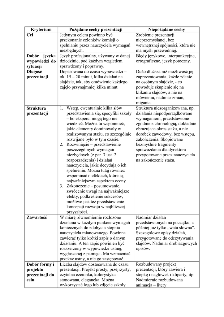 Kryterium Cel PoŜądane cechy prezentacji Jedynym celem powinno być przekonanie członków komisji o spełnianiu przez nauczyciela wymagań niezbędnych. Dobór języka Język profesjonalny, uŜywany w danej wypowiedzi do dziedzinie, pod kaŜdym względem sprawdzony i poprawny. sytuacji Dopasowana do czasu wypowiedzi – Długość ok. 15 – 20 minut, kilka działań na prezentacji slajdzie, tak, aby omówienie kaŜdego zajęło przynajmniej kilka minut. Struktura prezentacji Zawartość Dobór formy i projektu prezentacji do celu. NiepoŜądane cechy Zrobienie prezentacji nieprzemyślanej, bez wewnętrznej spójności, która nie ma myśli przewodniej. Błędy językowe, interpunkcyjne, ortograficzne, język potoczny. DuŜo dłuŜsza niŜ moŜliwość jej zaprezentowania, kaŜde zdanie na osobnym slajdzie, - co powoduje skupienie się na klikaniu slajdów, a nie na mówieniu, nadmiar zmian, migania. 1. Wstęp, ewentualnie kilka słów Struktura niezorganizowana, np. przedstawienia się, specyfiki szkoły działania niepodporządkowane – bo eksperci mogą tego nie wymaganiom, przedstawione wiedzieć. MoŜna tu wspomnieć, zgodnie z chronologią, dokładnie jakie elementy dominowały w obrazujące okres staŜu, a nie realizowanym staŜu, co szczególnie dorobek zawodowy, bez wstępu, rozwijane było w tym czasie. zakończenia. Skopiowane 2. Rozwinięcie – przedstawienie bezmyślnie fragmenty poszczególnych wymagań sprawozdania dla dyrektora niezbędnych (z par. 7 ust. 2 przygotowane przez nauczyciela roaporządzenia) i działań na zakończenie staŜu. nauczyciela, jakie decydują o ich spełnieniu. MoŜna tutaj równieŜ wspominać o efektach, które są najwaŜniejszym aspektem oceny. 3. Zakończenie – posumowanie, zwrócenie uwagi na najwaŜniejsze efekty, podkreślenie sukcesów, moŜliwe jest teŜ przedstawienie koncepcji rozwoju w najbliŜszej przyszłości. W miarę równomiernie rozłoŜone Nadmiar działań działania w kaŜdym punkcie wymagań przedstawionych na początku, a koniecznych do zdobycia stopnia później juŜ tylko „wata słowna”. nauczyciela mianowanego. Powinna Szczegółowe opisy działań, zawierać tylko krótki zapis o danym przygotowane do odczytywania działaniu. A ten zapis powinien być slajdów. Nadmiar drobiazgowych rozszerzony w wypowiedzi ustnej, opisów. wygłaszanej z pamięci. Ma wzmacniać przekaz ustny, a nie go zastępować. Rozbudowany projekt Liczba slajdów dostosowana do czasu prezentacji. Projekt prosty, przejrzysty, prezentacji, który zawiera i stopkę i nagłówek i kliparty, itp. czytelna czcionka, kolorystyka stonowana, elegancka. MoŜna Nadmiernie rozbudowana wykorzystać logo lub zdjęcie szkoły. animacja – litery MoŜna tworzyć hiperłącza do zdjęć, dokumentów, ale trzeba pamiętać, Ŝeby się szybko otwierały i Ŝeby nie było ich za duŜo. Prezentacja nie moŜe „mówić” za nas, ma tylko wspierać naszą wypowiedź. Oszczędna animacja, ewentualne kliparty czy obrazy dostosowane do treści wypowiedzi. Dyrektor, który obserwował staŜ w szkole, moŜe przedstawione przez nauczyciela działania potwierdzić, nie ma więc potrzeby dołączać potwierdzeń do wszystkiego. Jeśli chcemy pokazać jakiś dokument, niech to będzie coś ciekawego, a nie np. standardowe zaświadczenia z kursu. Wykorzystanie Nauczyciel wykorzystuje poszczególne slajdy do rozpoczęcia kolejnych prezentacji wątków wypowiedzi, widać zgodność między tym, co mówi i tym, co pokazuje w prezentacji multimedialnej. Korzysta z hiperłączy, aby wzbogacić przekaz ustny, dokonać wizualizacji. Nauczyciel nie skupia się tylko na klikaniu, ale integruje przekaz wizualny i wypowiedź. Widać, Ŝe najwaŜniejsza jest wypowiedź, a prezentacja ma charakter wspomagający. „wyjeŜdŜają”, migają, fruwają. Kliparty ruszają się, znikają i pojawiają się znów. Nadmiar hiperłączy, zdjęć, fragmentów filmów, skanów artykułów, zaświadczeń, podziękowań, obszernych dokumentów. Do tego wszystkiego muzyka w tle i bardzo ozdobne litery, zupełnie nieczytelne dla odbiorców. Prezentacja jest niespójna z wypowiedzią. Nauczyciel szuka właściwego slajdu, urywa mówienie o działaniu, poniewaŜ na slajdzie znajduje się inna informacja, przesuwa slajdy, aby znaleźć właściwą informację, otwiera dokument, ale to przerywa, bo długo trwa, zawiesza się komputer, otwiera prezentacje ponownie, zaczyna wszystko od początku. Prezentacja jest waŜniejsza niŜ wypowiedź, nauczyciel nie umie sobie poradzić bez prezentacji.