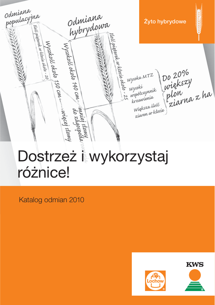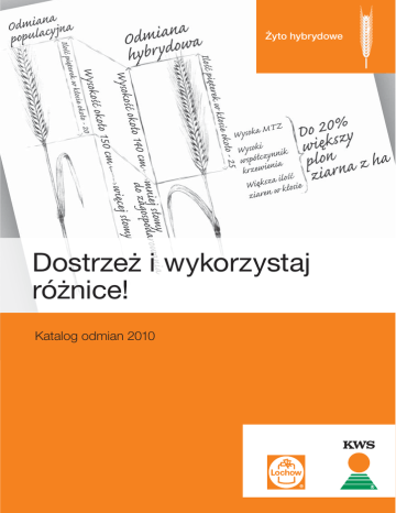 Żyto hybrydowe Dostrzeż i wykorzystaj różnice! Katalog odmian 2010 Szanowni Państwo, Odmiany żyta hybrydowego KWS LOCHOW od kilkunastu lat są wysoko oceniane przez rolników i niezależne instytucje badawcze za całość swoich cech agronomicznych, które bezpośrednio przekładają się na poziom uzyskiwanych plonów z jednostki powierzchni. Wybór odpowiedniej odmiany do uprawy to bardzo poważana decyzja i podstawa sukcesu w produkcji roślinnej. Właściwie dobrana do warunków agrotechnicznych gospodarstwa przyniesie wymierne korzyści w bilansie ekonomicznym uprawy. Wzorem lat ubiegłych przygotowaliśmy broszurę, która przedstawi Państwu odmiany żyta hybrydowego KWS LOCHOW na podstawie urzędowych badań i z pewnością pomoże dokonać optymalnego wyboru. Oprócz charakterystyk odmianowych, prezentujemy wyniki doświadczeń już zrealizowanych w ramach międzynarodowego projektu Rye Belt wspierającego producentów żyta - „Żywienie trzody chlewnej żytem hybrydowym” oraz „Żyto hybrydowe w badaniach wypiekowych”. Ponadto, w celu zapewnienia sprawnego i efektywnego systemu finansowania produkcji żyta hybrydowego KWS LOCHOW na sezon 2010 podpisaliśmy partnerską umowę o współpracy z Bankiem Gospodarki Żywnościowej (BGŻ). Dzięki temu otrzymujecie Państwo do dyspozycji możliwość wykorzystania alternatywnych środków finansowych w postaci kredytu obrotowego na zakup nasion i uprawę żyta hybrydowego odmian KWS LOCHOW. Szczegółowe informacje o wspomnianym kredycie dostępne są w oddziałach regionalnych BGŻ lub pod numerem infolinii 0801 123 456. Zapraszamy do współpracy i życzymy sukcesów w uprawie odmian żyta hybrydowego KWS LOCHOW. Agnieszka Sąsiadek i Thomas Blumtritt Zarząd KWS LOCHOW POLSKA 2 | Katalog odmian 2010 Od chwastu do hybrydy - kariera żyta jako gatunku Żyto rozpoczęło swoją karierę jako chwast w uprawach pszenicy i jęczmienia w rejonie Azji Mniejszej. Do dzisiaj zachowało niektóre cechy właściwe chwastom. Żyto jest bardziej odporne niż pszenica na mrozy, choroby, suszę i niedobór składników pokarmowych. Dlatego mogło się rozprzestrzenić w surowym klimacie środkowej i północnej Europy i stać się niemal jedynym zbożem chlebowym ludów słowiańskich, celtyckich i germańskich. Niestety w rejonach o lepszej glebie i łagodniejszym klimacie nie mogło konkurować z pszenicą, dlatego przez długi czas uważane było za pokarm dla biednych. Jeszcze przed 40 laty żyto było najczęściej uprawianym gatunkiem w naszej części Europy. W następnych dziesięcioleciach, w dużej mierze za przyczyną szybkiego postępu hodowlanego w takich gatunkach jak pszenica, jęczmień czy kukurydza, żyto zostało zepchnięte na stanowiska najsłabsze, w których dzięki swej tolerancji na suszę i małym wymaganiom pokarmowym radzi sobie lepiej niż inne gatunki. Obecnie jednak jest szansa na odwrócenie tej tendencji. Poprzez nowoczesne metody hodowli roślin, a przede wszystkim przez hodowlę mieszańcową żyto może znów konkurować plennością na wielu stanowiskach z pszenicą. Na poniższym rysunku przedstawiono analizę wyników doświadczeń porejestrowych przeprowadzonych w Niemczech w latach 2000-2003. Rysunek 1. Źródło: KWS LOCHOW GMBH 2004, Analiza 140 doświadczeń LSV 2000-2003. Z przedstawionego diagramu wynika, że na stanowiskach, na których pszenica plonuje słabiej niż 92 dt/ha średni plon żyta mieszańcowego jest wyższy. Przy tym, im słabsze stanowisko, tym różnica w plonowaniu na korzyść żyta hybrydowego jest większa. Dopiero na naj- Katalog odmian 2010 | 3 lepszych glebach, gdzie pszenica plonuje powyżej 100 dt/ha jej potencjał plonotwórczy może być w pełni wykorzystany. W ostatnich 3 latach KWS LOCHOW POLSKA zarejestrowała w Polsce 5 nowych odmian żyta hybrydowego, które charakteryzują się jeszcze wyższym potencjałem plonowania niż dotychczasowe czołowe odmiany, takie jak Fernando czy Picasso. Ich zwyżka plonu w porównaniu do odmian populacyjnych i syntetycznych przekracza często 20%. Poprawiona została również konkurencyjność w stosunku do innych gatunków zbóż, co potwierdzone zostało w doświadczeniu ścisłym prowadzonym w sezonach 2006/07, 2007/08 i 2008/09 we współpracy z Uniwersytetem Przyrodniczym we Wrocławiu. Obiektami badań były odmiany wzorcowe COBORU: pszenicy ozimej - Tonacja, pszenżyta ozimego - Moderato oraz żyta populacyjnego - Dańkowskie Diament i mieszańcowego - Balistic. Doświadczenie przeprowadzono na glebach średnich (klasa 4a-4b) w trzech punktach doświadczalnych w różnych rejonach Polski. Dla wszystkich badanych odmian zastosowano jednakowy poziom agrotechniki: nawożenie azotowe 100-140 kg/ha, dwukrotna ochrona fungicydowa, skracanie źdźbła, herbicydy. Na kolejnych czterech rysunkach przedstawiono graficznie średnie wartości plonu ziarna badanych gatunków w poszczególnych latach i miejscowościach. Rysunek 2. Plonowanie gatunków w 2007 roku. Źródło danych: Doświadczenie KWS LOCHOW POLSKA i Uniwersytetu Przyrodniczego we Wrocławiu 2009-2007. Najwyższy plon w roku 2007 (rys. 2) osiągnęła odmiana żyta mieszańcowego Balistic przewyższając inne gatunki w dwóch miejscowościach (Walewice i Prusim) i ustępując nieznacznie pszenżytu Moderato w miejscowości Swojec. Średni plon pszenżyta Moderato w 2007 roku był tylko o około 4 dt/ha niższy od żyta mieszańcowego, ale znacznie przewyższał plony odmian żyta populacyjnego i pszenicy. Gatunki te plonowały przeciętnie o około 30 dt/ha gorzej niż żyto mieszańcowe. 4 | Katalog odmian 2010 Rysunek 3. Plonowanie gatunków w 2008 roku. Źródło danych: Doświadczenie KWS LOCHOW POLSKA i Uniwersytetu Przyrodniczego we Wrocławiu 2009-2007. W roku 2008 (rys. 3) odmiana żyta mieszańcowego Balistic charakteryzowała się najwyższym średnim plonem ziarna, jednak jej plonowanie w poszczególnych miejscowościach było dużo bardziej zróżnic