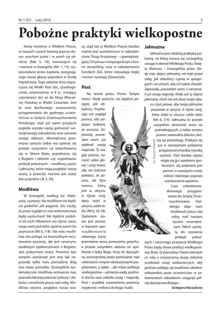 Nr 1 (31) - Luty 2010 3 Pobożne praktyki wielkopostne Modlitwa W Ewangelii, według św. Mateusza, czytamy: Na modlitwie nie bądźcie gadatliwi jak poganie. Oni myślą, że przez wzgląd na swe wielomówstwo będą wysłuchani! Nie bądźcie podobni do nich! Albowiem wie Ojciec wasz, czego wam potrzeba, wpierw zanim Go poprosicie (Mt 6, 7-8). Tak więc modlitwa nie polega na bezmyślnym recytowaniu pacierzy, ale jest szczerym, osobistym zjednoczeniem z Bogiem. Jest pokarmem wiary. Powinna być zwięzła, ponieważ jest ona tak naprawdę tylko nam potrzebna. Bóg zna nasze potrzeby. Szczególnie systematyczna modlitwa wzmacnia nas, pozwala łatwiej pokonać pokusy i słabości, umożliwia pracę nad sobą. Modlitwa ożywia, pogłębia naszą wia- rę, stąd też w Wielkim Poście bardzo ważne jest uczestnictwo w nabożeństwie Drogi Krzyżowej – upamiętniającej Chrystusa niosącego krzyż ulicami Jerozolimy, oraz w nabożeństwie Gorzkich Żali, które rozważają mękę i śmierć naszego Zbawiciela. Post Na temat postu Pismo Święte mówi: Kiedy pościcie, nie bądźcie posępni, jak obłudnicy. Przybierają oni wygląd ponury, aby pokazać ludziom, że poszczą. Zaprawdę, powiadam wam: już odebrali swoją nagrodę. Ty zaś, gdy pościsz, namaść sobie głowę i umyj twarz, aby nie ludziom pokazać, że pościsz, ale Ojcu twemu, który jest w ukryciu. A Ojciec twój, który widzi w ukryciu, odda tobie (Mt 6, 16-18). Zadaniem postu jest pomoc w lepszym uporządkowaniu własnego życia, przemianie serca, porzuceniu grzechu, a przede wszystkim ułatwia on spotkanie z łaską Boga. Uczy on dyscypliny wewnętrznej przez panowanie nad cielesnymi i innymi niestosownymi pragnieniami, a także – jak mówi prefacja wielkopostna – uśmierza wady, podnosi ducha oraz udziela cnoty i nagrody. Post i wszelkie umartwienia powinny wypływać z miłości do Boga i ludzi. Jałmużna Jałmużna jest ostatnią praktyką pokutną, na którą zwraca się szczególną uwagę w okresie Wielkiego Postu. Święty Mateusz – Ewangelista pisze: Kiedy więc dajesz jałmużnę, nie trąb przed sobą, jak obłudnicy czynią w synagogach i na ulicach, aby ich ludzie chwalili. Zaprawdę, powiadam wam: ci otrzymali już swoją nagrodę. Kiedy zaś ty dajesz jałmużnę, niech nie wie lewa twoja ręka, co czyni prawa, aby twoja jałmużna pozostała w ukryciu. A Ojciec twój, który widzi w ukryciu, odda tobie (Mt 6, 2-4). Jałmużna to przede wszystkim otwartość serca na potrzebujących, a także szczera pomoc materialna bliźnim, którzy jej potrzebują. Praktyce tej już w starożytnym judaizmie przypisywano bardzo wysoką wartość. Dziś bardzo często wiąże się ją z aspektem społecznym. Jej zadaniem jest pomoc w rozwijaniu cnoty miłości bliźniego poprzez wyniszczenie egoizmu. Czas czterdziestodniowego przygotowania do święta Zmartwychwstania Pańskiego daje nam możliwość pracy nad sobą, nad naszym życiem wewnętrznym. Niech zachętą do czynienia praktyk pokutnych i owocnego przeżycia Wielkiego Postu będą słowa prefacji wielkopostnej: Boże, Ty pozwalasz Twoim wiernym co roku z oczyszczoną duszą radośnie oczekiwać świąt wielkanocnych, aby gorliwie oddając się modlitwie i dziełom miłosierdzia przez uczestnictwo w sakramentach odrodzenia osiągnęli pełnię dziecięctwa Bożego… Grzegorz Kaczybura rys. Krystian Głośnicki Kiedy mówimy o Wielkim Poście, w naszych uszach brzmią jeszcze słowa: prochem jesteś i w proch się obrócisz (Rdz 3, 19), nawracajcie się i wierzcie w Ewangelię (Mt 1, 15), wypowiadane przez kapłana, posypującego nasze głowy popiołem w Środę Popielcową. Tego właśnie dnia rozpoczyna się Wielki Post (łac. Quadragesima), ustanowiony w II w., trwający czterdzieści dni aż do Mszy Wieczerzy Pańskiej w Wielki Czwartek. Jest to czas duchowego oczyszczenia, przygotowania do godnego uczestnictwa w święcie Zmartwychwstania Pańskiego, stąd już samo przyjęcie popiołu wyraża naszą gotowość wewnętrznego odrodzenia oraz uznanie swojej słabości. Wewnętrzna przemiana samych siebie ma opierać się przede wszystkim na wsłuchiwaniu się w Słowo Boże, pojednaniu się z Bogiem i bliźnim czy wypełnianiu praktyk pokutnych – modlitwy, postu i jałmużny, które mają pogłębić naszą wiarę, a przecież martwa jest wiara bez uczynków (Jk 2, 26).