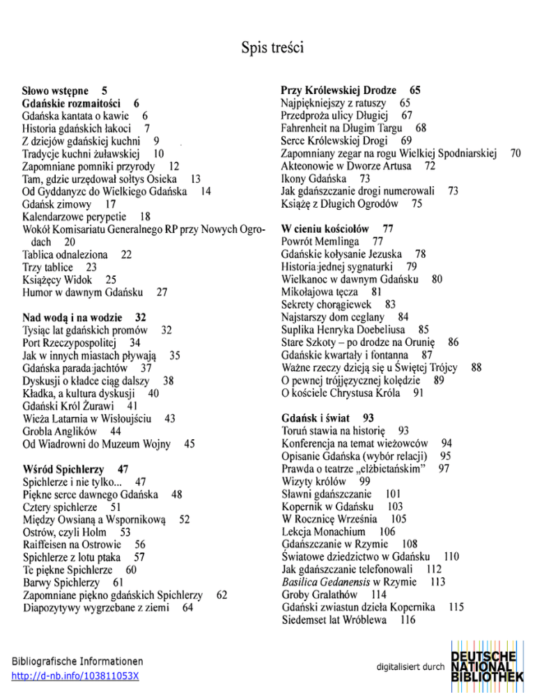 Spis treści Słowo wstępne 5 Gdańskie rozmaitości 6 Gdańska kantata o kawie 6 Historia gdańskich łakoci 7 Z dziejów gdańskiej kuchni 9 Tradycje kuchni żuławskiej 10 Zapomniane pomniki przyrody 12 Tam, gdzie urzędował sołtys Osieka 13 Od Gyddanyzc do Wielkiego Gdańska 14 Gdańsk zimowy 17 Kalendarzowe perypetie 18 Wokół Komisariatu Generalnego RP przy Nowych Ogro dach 20 Tablica odnaleziona 22 Trzy tablice 23 Książęcy Widok 25 Humor w dawnym Gdańsku 27 Nad wodą i na wodzie 32 Tysiąc lat gdańskich promów 32 Port Rzeczypospolitej 34 Jak w innych miastach pływają 35 Gdańska parada jachtów 37 Dyskusji o kładce ciąg dalszy 38 Kładka, a kultura dyskusji 40 Gdański Król Żurawi 41 Wieża Latarnia w Wisłoujściu 43 Grobla Anglików 44 Od Wiadrowni do Muzeum Wojny 45 Wśród Spichlerzy 47 Spichlerze i nie tylko... 47 Piękne serce dawnego Gdańska 48 Cztery spichlerze 51 Między Owsianą a Wspornikową 52 Ostrów, czyli Holm 53 Raiffeisen na Ostrowie 56 Spichlerze z lotu ptaka 57 Te piękne Spichlerze 60 Barwy Spichlerzy 61 Zapomniane piękno gdańskich Spichlerzy Diapozytywy wygrzebane z ziemi 64 http://d-nb.info/103811053X 62 Przy Królewskiej Drodze 65 Najpiękniejszy z ratuszy 65 Przedproża ulicy Długiej 67 Fahrenheit na Długim Targu 68 Serce Królewskiej Drogi 69 Zapomniany zegar na rogu Wielkiej Spodniarskiej Akteonowie w Dworze Artusa 72 Ikony Gdańska 73 Jak gdańszczanie drogi numerowali 73 Książę z Długich Ogrodów 75 W cieniu kościołów 77 Powrót Memlinga 77 Gdańskie kołysanie Jezuska 78 Historia jednej sygnaturki 79 Wielkanoc w dawnym Gdańsku 80 Mikołajowa tęcza 81 Sekrety chorągiewek 83 Najstarszy dom ceglany 84 Suplika Henryka Doebeliusa 85 Stare Szkoty - po drodze na Orunię 86 Gdańskie kwartały i fontanna 87 Ważne rzeczy dzieją się u Świętej Trójcy O pewnej trójjęzycznej kolędzie 89 O kościele Chrystusa Króla 91 Gdańsk i świat 93 Toruń stawia na historię 93 Konferencja na temat wieżowców 94 Opisanie Gdańska (wybór relacji) 95 Prawda o teatrze „elżbietańskim" 97 Wizyty królów 99 Sławni gdańszczanie 101 Kopernik w Gdańsku 103 W Rocznicę Września 105 Lekcja Monachium 106 Gdańszczanie w Rzymie 108 Światowe dziedzictwo w Gdańsku 110 Jak gdańszczanie telefonowali 112 Basilica Gedanensis w Rzymie 113 Groby Gralathów 114 Gdański zwiastun dzieła Kopernika 115 Siedemset lat Wróblewa 116 88