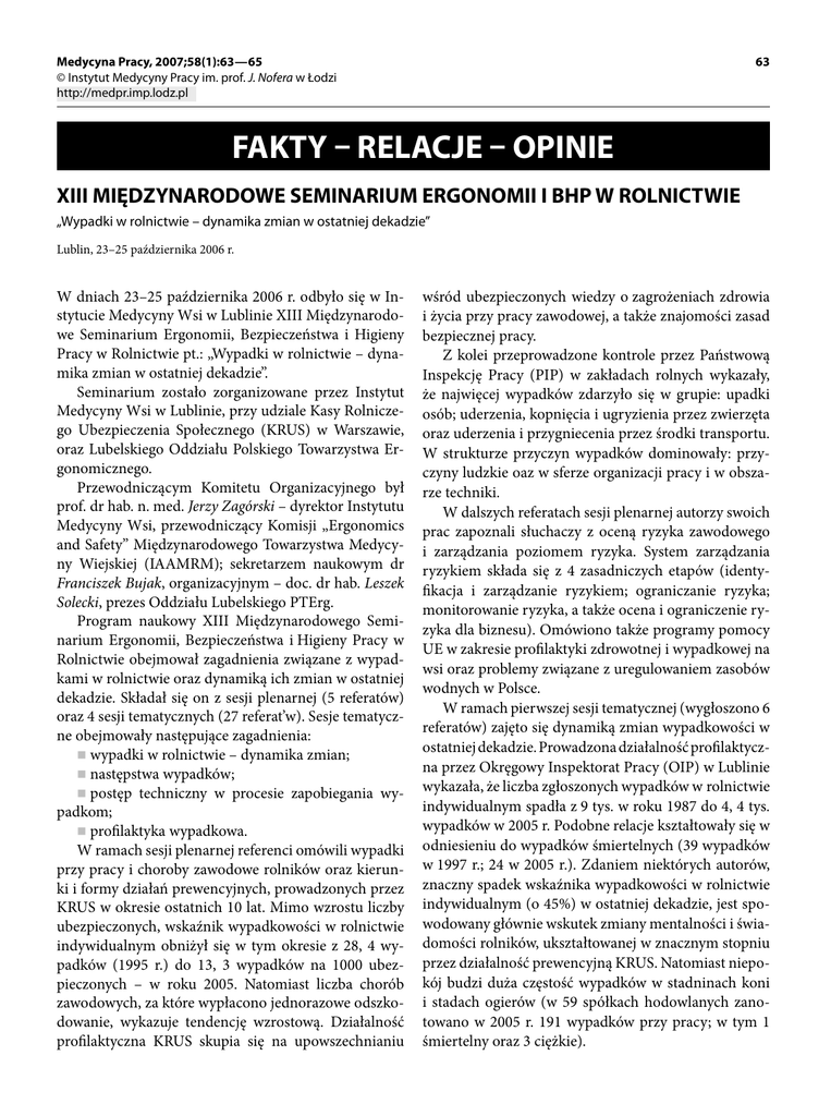 Medycyna Pracy, 2007;58(1):63 — 65 © Instytut Medycyny Pracy im. prof. J. Nofera w Łodzi http://medpr.imp.lodz.pl 63 FAKTY – RELACJE – OPINIE XIII MIĘDZYNARODOWE SEMINARIUM ERGONOMII I BHP W ROLNICTWIE „Wypadki w rolnictwie – dynamika zmian w ostatniej dekadzie” Lublin, 23–25 października 2006 r. W dniach 23–25 października 2006 r. odbyło się w Instytucie Medycyny Wsi w Lublinie XIII Międzynarodowe Seminarium Ergonomii, Bezpieczeństwa i Higieny Pracy w Rolnictwie pt.: „Wypadki w rolnictwie – dynamika zmian w ostatniej dekadzie”. Seminarium zostało zorganizowane przez Instytut Medycyny Wsi w Lublinie, przy udziale Kasy Rolniczego Ubezpieczenia Społecznego (KRUS) w Warszawie, oraz Lubelskiego Oddziału Polskiego Towarzystwa Ergonomicznego. Przewodniczącym Komitetu Organizacyjnego był prof. dr hab. n. med. Jerzy Zagórski – dyrektor Instytutu Medycyny Wsi, przewodniczący Komisji „Ergonomics and Safety” Międzynarodowego Towarzystwa Medycyny Wiejskiej (IAAMRM); sekretarzem naukowym dr Franciszek Bujak, organizacyjnym – doc. dr hab. Leszek Solecki, prezes Oddziału Lubelskiego PTErg. Program naukowy XIII Międzynarodowego Seminarium Ergonomii, Bezpieczeństwa i Higieny Pracy w Rolnictwie obejmował zagadnienia związane z wypadkami w rolnictwie oraz dynamiką ich zmian w ostatniej dekadzie. Składał się on z sesji plenarnej (5 referatów) oraz 4 sesji tematycznych (27 referat’w). Sesje tematyczne obejmowały następujące zagadnienia: wypadki w rolnictwie – dynamika zmian; następstwa wypadków; postęp techniczny w procesie zapobiegania wypadkom; profilaktyka wypadkowa. W ramach sesji plenarnej referenci omówili wypadki przy pracy i choroby zawodowe rolników oraz kierunki i formy działań prewencyjnych, prowadzonych przez KRUS w okresie ostatnich 10 lat. Mimo wzrostu liczby ubezpieczonych, wskaźnik wypadkowości w rolnictwie indywidualnym obniżył się w tym okresie z 28, 4 wypadków (1995 r.) do 13, 3 wypadków na 1000 ubezpieczonych – w roku 2005. Natomiast liczba chorób zawodowych, za które wypłacono jednorazowe odszkodowanie, wykazuje tendencję wzrostową. Działalność profilaktyczna KRUS skupia się na upowszechnianiu wśród ubezpieczonych wiedzy o zagrożeniach zdrowia i życia przy pracy zawodowej, a także znajomości zasad bezpiecznej pracy. Z kolei przeprowadzone kontrole przez Państwową Inspekcję Pracy (PIP) w zakładach rolnych wykazały, że najwięcej wypadków zdarzyło się w grupie: upadki osób; uderzenia, kopnięcia i ugryzienia przez zwierzęta oraz uderzenia i przygniecenia przez środki transportu. W strukturze przyczyn wypadków dominowały: przyczyny ludzkie oaz w sferze organizacji pracy i w obszarze techniki. W dalszych referatach sesji plenarnej autorzy swoich prac zapoznali słuchaczy z oceną ryzyka zawodowego i zarządzania poziomem ryzyka. System zarządzania ryzykiem składa się z 4 zasadniczych etapów (identyfikacja i zarządzanie ryzykiem; ograniczanie ryzyka; monitorowanie ryzyka, a także ocena i ograniczenie ryzyka dla biznesu). Omówiono także programy pomocy UE w zakresie profilaktyki zdrowotnej i wypadkowej na wsi oraz problemy związane z uregulowaniem zasobów wodnych w Polsce. W ramach pierwszej sesji tematycznej (wygłoszono 6 referatów) zajęto się dynamiką zmian wypadkowości w ostatniej dekadzie. Prowadzona działalność profilaktyczna przez Okręgowy Inspektorat Pracy (OIP) w Lublinie wykazała, że liczba zgłoszonych wypadków w rolnictwie indywidualnym spadła z 9 tys. w roku 1987 do 4, 4 tys. wypadków w 2005 r. Podobne relacje kształtowały się w odniesieniu do wypadków śmiertelnych (39 wypadków w 1997 r.; 24 w 2005 r.). Zdaniem niektórych autorów, znaczny spadek wskaźnika wypadkowości w rolnictwie indywidualnym (o 45%) w ostatniej dekadzie, jest spowodowany głównie wskutek zmiany mentalności i świadomości rolników, ukształtowanej w znacznym stopniu przez działalność prewencyjną KRUS. Natomiast niepokój budzi duża częstość wypadków w stadninach koni i stadach ogierów (w 59 spółkach hodowlanych zanotowano w 2005 r. 191 wypadków przy pracy; w tym 1 śmiertelny oraz 3 ciężkie). 64 Autor Z kolei analiza wypadków wśród dzieci do lat 15, w gospodarstwach rolnych na terenie województwa lubelskiego wykazała, że najczęściej do wypadków dochodzi na skutek upadku dzieci obciążonych przenoszonymi ładunkami, upadku z wysokości, przy pracy z maszynami, ze zwierzętami, przy pracy z ostrymi narzędziami oraz z tnącymi urządzeniami mechanicznymi. Wskutek zaistniałych wypadków dzieci doznały urazów kończyn, tułowia i głowy. Nieco inaczej przedstawiała się dynamika zmian wypadkowości w USA w okresie ostatniej dekady. Według danych dr D. Murphy (USA) wskaźnik wypadków śmiertelnych związanych z pracą zawodową w przemyśle rolnym wynosił 26,0 w roku 1993 na 100 000 pracowników; spadł do 20,1 w roku 2000, po czym wzrósł do 29,2 w roku 2004. Najpowszechniejszym źródłem urazów w rolnictwie amerykańskim są ciągniki i maszyny rolnicze oraz inwentarz żywy. Zdaniem prof. P. Lundqvista (Szwecja), główną przyczyną wypadków w rolnictwie szwedzkim są zwierzęta (kopnięcia) oraz urazy i wypadki z udziałem pojazdów (zmiażdżenia, zwichnięcia, zranienia i uraz kręgosłupa). Drugim istotnym zagadnieniem (sesja tematyczna druga – 5 referatów), jakim zajmowano się na Seminarium, były następstwa wypadków. Szczególnie ciężkie następstwa wypadków mają miejsce wśród dzieci wiejskich, prowadzące do trwałego i ciężkiego kalectwa lub śmierci (w Polsce ogółem z powodu urazów ginie około 1500 dzieci, zaś około 30 tysięcy zostaje kalekami). Główną przyczyną kalectwa dzieci rolników lub ich śmierci są maszyny i narzędzia używane w gospodarstwach wiejskich. Z kolei analiza ostrych zatruć ksenobiotykami mieszkańców wsi lubelskiej, w latach 1999–2004 dowiodła, że najczęstszą motywacją 