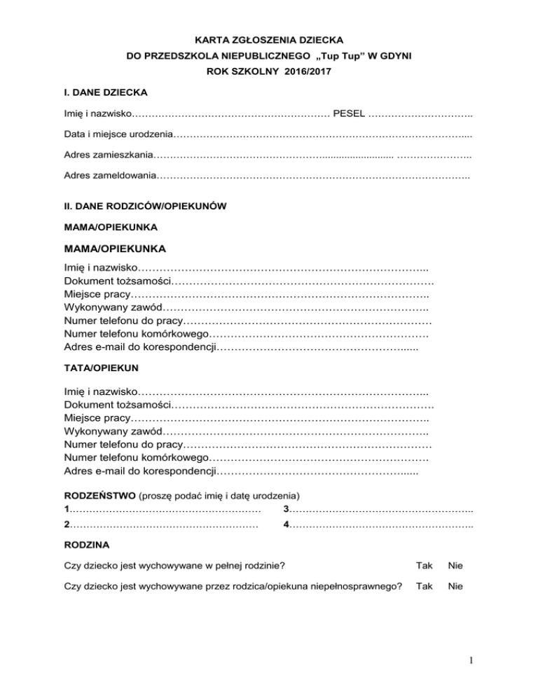 KARTA ZGŁOSZENIA DZIECKA DO PRZEDSZKOLA NIEPUBLICZNEGO „Tup Tup” W GDYNI ROK SZKOLNY 2016/2017 I. DANE DZIECKA Imię i nazwisko…………………………………………………… PESEL ………………………….. Data i miejsce urodzenia…………………………………………………………………………….... Adres zamieszkania…………………………………………….......................... ………………….. Adres zameldowania………………………………………………………………………………….. II. DANE RODZICÓW/OPIEKUNÓW MAMA/OPIEKUNKA MAMA/OPIEKUNKA Imię i nazwisko……………………………………………………………………... Dokument tożsamości………………………………………………………………. Miejsce pracy……………………………………………………………………….. Wykonywany zawód……………………………………………………………….. Numer telefonu do pracy…………………………………………………………… Numer telefonu komórkowego……………………………………………………. Adres e-mail do korespondencji……………………………………………...... TATA/OPIEKUN Imię i nazwisko……………………………………………………………………... Dokument tożsamości………………………………………………………………. Miejsce pracy……………………………………………………………………….. Wykonywany zawód……………………………………………………………….. Numer telefonu do pracy…………………………………………………………… Numer telefonu komórkowego……………………………………………………. Adres e-mail do korespondencji……………………………………………...... RODZEŃSTWO (proszę podać imię i datę urodzenia) 1.………………………………………………… 3……………………………………………….. 2………………………………………………… 4……………………………………………….. RODZINA Czy dziecko jest wychowywane w pełnej rodzinie? Tak Nie Czy dziecko jest wychowywane przez rodzica/opiekuna niepełnosprawnego? Tak Nie 1 III. INFORMACJE O STANIE ZDROWIA DZIECKA 1. Alergie i uczulenia (w tym na artykuły spożywcze):……………………………………………... ……………….............................................................................................................................. 2. Zalecenia dotyczące diety:…………………………………………………………………………. 3. Przebyte choroby zakaźne:………………………………………………………………………… …………………………………………………………………………………………………………… 4. Czy dziecko pozostaje pod opieką specjalisty?…………………………………………………. 5. Zalecenia lekarzy:…………………………………………………………………………………… IV. DODATKOWE INFORMACJE O DZIECKU 1. Czy dziecko uczęszczało wcześniej do przedszkola lub żłobka? Tak Nie 2. Czy dziecko śpi w ciągu dnia? Tak Nie 3. Czy dziecko sygnalizuje potrzeby fizjologiczne ? Tak Nie 4. Czy jest samodzielne przy spożywaniu posiłków ? Tak Nie 5. Czym dziecko się interesuje, jakie są jego uzdolnienia, co lubi robić najbardziej? …………………………………………………………………………………………………………… …………………………………………………………………………………………………………… 6. Czego dziecko nie lubi jeść?………………………………………………………………………. 7. Inne ważne informacje………………………………................................................................ …………………………………………………………………………………………………………… V. DEKLARACJA RODZICA/OPIEKUNA 1. Dziecko będzie przebywało w Przedszkolu „Tup-Tup” w godzinach ………… ……………... i korzystało z ……….. posiłków dziennie. 2. Zobowiązuje się do przestrzegania postanowień statutu przedszkola oraz regulaminu. 3. Zostałem poinformowany, iż podczas pobytu dziecka w przedszkolu personel nie może podawać żadnych leków jednocześnie zobowiązuję się do przyprowadzania do przedszkola tylko zdrowego dziecka. 4. Wyrażam zgodę na dokonywanie czynności pielęgnacyjnych przy moim dziecku oraz wyrażanie czułości poprzez przytulanie, głaskanie, tulenie do snu. 5. Zobowiązuję się do poinformowania przedszkola o jakichkolwiek zmianach w podanych wyżej informacjach. 6. Zobowiązuję się do terminowego uiszczania opłat za przedszkole i posiłki. 2 7. Następujące osoby pełnoletnie upoważniam do odbioru mojego dziecka z Przedszkola „Tup-Tup” : Imię i nazwisko Pokrewieństwo Nr dowodu osobistego Telefon 1………………………………………………………………………………………………………….. 2………………………………………………………………………………………………………….. 3…………………………………………………………………………………………. ……………… INFORMACJE DOTYCZĄCE DANYCH OSOBOWYCH DZIECKA I JEGO RODZINY Oświadczam, ze przedłożone przeze mnie dane są zgodne ze stanem faktycznym i wyrażam zgodę na ich zbieranie przetwarzanie i wykorzystanie przez dyrektora przedszkola dla potrzeb związanych z przyjęciem i pobytem naszego dziecka w przedszkolu, zgodnie z Ustawą z 29 sierpnia 1997r. o ochronie danych osobowych ( tekst 