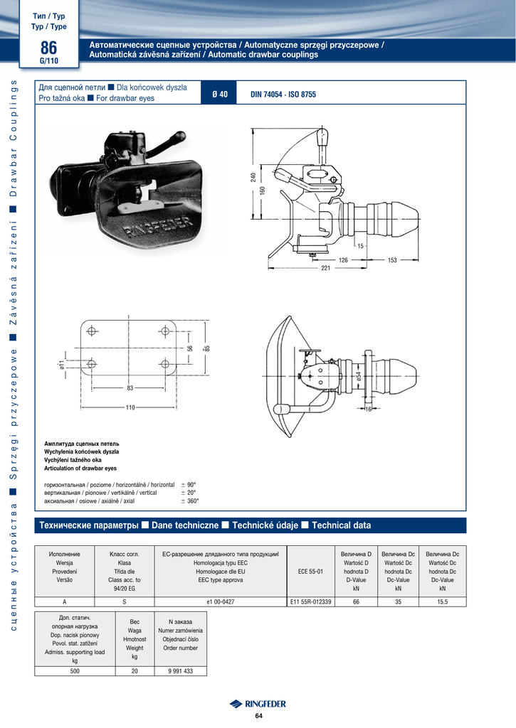 Tип / Typ Typ / Type 86 Автоматические сцепные устройствa / Automatyczne sprzęgi przyczepowe / Automatická závěsná zařízení / Automatic drawbar couplings DIN 74054 · ISO 8755 160 240 Для сцепной петли M Dla końcowek dyszla Ø 40 Pro tažná oka M For drawbar eyes 15 126 153 85 56 221 ø54 ø11 сцепные устройства M Sprzęgi przyczepowe M Závěsná zařízení M Drawbar Couplings G/110 83 110 16 Амплитуда сцепных петель Wychylenia końcówek dyszla Vychýlení tažného oka Articulation of drawbar eyes горизонтальная / poziome / horizontálně / horizontal 6 90° вертикальная / pionowe / vertikálně / vertical 6 20° аксиальная / osiowe / axiálně / axial 6 360° Технические параметры M Dane techniczne M Technické údaje M Technical data Исполнение Wersja Provedení Versão Класс согл. Klasa Třída dle Class acc. to 94/20 EG EC-разрешение дляданного типа продукцииl Homologacja typu EEC Homologace dle EU EEC type approva A S e1 00-0427 Доп. статич. опорная нагрузка Dop. nacisk pionowy Povol. stat. zatížení Admiss. supporting load kg Вес Waga Hmotnost Weight kg N заказа Numer zamówienia Objednací číslo Order number 500 20 9 991 433 64 ECE 55-01 Величина D Wartość D hodnota D D-Value kN Величина Dc Wartość Dc hodnota Dc Dc-Value kN Величина Dc Wartość Dc hodnota Dc Dc-Value kN E11 55R-012339 66 35 15,5 15 17 Запасные части M Części zamienne M Náhradní díly M Spare parts Tип / Typ / Typ / Type 86 G/110 Pos. No. 2 6 997 899 3 2 991 187 4 13 998 035 6 6 997 880 7 6 998 771 11 7 995 563 12 7 995 571 15 6 997 872 17 10 991 390 18 7 998 341 23 6 997 910 24 12 991 452 25 7 998 171 26 6 998 755 36 7 998 295 37 7 995 547 38 990 523 39 10 995 302 40 7 995 512 41 10 995 299 42 6 997 759 43 10 998 433 44 10 996 678 2 991 179 Наименование M Oznaczenie M Označení M Designation Bерхняя направляющая втулка M Górna tuleja prowadząca M Horní vodící pouzdro M Top guide bush Сцепная муфта M Korpus sprzęgu M Telo tazného zarízení M Coupling body Предохранитель M Urządzenie zabezpieczające M Pojistka M Safety device Нижняя направляющая втулка M Dolna tuleja prowadząca M Dolní vodící pouzdro M Bottom guide bush Пластмассовая пластина M Plastikowa płytka ślizgowa M Speciální plastová deska M Special plastic plate Bозвратная пружина M Sprężyna powrotna M Vratná pružina M Return spring Cтопорная шайба M Pokrywa dolna M Polohovací podložka M Tab washer Ручной / стопорный рычаг, исполн. E/A M Dźwignia ręcznej blokady, wersja E/A M Ruční pojistná páka, prov. E/A M Hand/Locking lever, design E/A Болты для серьги пружины M Sworzeń ramienia dźwigni M Čep pružinové páky M Bolt for spring arm Серьга пружины M Ramię resoru M Pružinová páka M Spring arm Шкворень тягово-сцепного устройства M Sworzeń M Spojovací čep M Coupling bolt Штифт стопорного рычага M Sworzeń dźwigni blokady M Kolík pojistné páky M Locking lever pin Замыкающая пружина M Sprężyna zamykająca M Závěrná pružina M Locking spring Торцевая заглушка M Pokrywa górna M Koncová krytka M End cap Pезиновый упругий элемент M Podkładka gumowa M Gumová pružina M Rubber spring Упорная шайба M Podkładka przednia M Přítlačná podložka M Thrust washer Hаправляющая тяги M Mocowanie sprzęgu M Vedení tyce M Bar guide Oпорная втулка M Tuleja łożyskująca M Pouzdro ulození M Bearing bush Oпорная шайба M Podkładka tylna M Tažná podložka M Tension washer Пружинная шайба M Podkładka sprężynująca M Pružinová podložka M Spring washer Прорезная гайка M Nakrętka koronowa M Korunková matka M Castellated nut Шплинт M Zawleczka zabezpieczająca M Závlačka M Cotter pin Защитный колпачок M Pokrywa ochronna M Ochranná krytka M Protecting cap Ремкомплект M Zestaw naprawczy M Souprava pro opravy M Repair kit (Pos. 2 + 6 + 7 + 23 + 43) 65