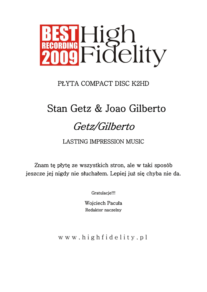 PŁYTA COMPACT DISC K2HD Stan Getz & Joao Gilberto Getz/Gilberto LASTING IMPRESSION MUSIC Znam tę płytę ze wszystkich stron, ale w taki sposób jeszcze jej nigdy nie słuchałem. Lepiej już się chyba nie da. Gratulacje!!! Wojciech Pacuła Redaktor naczelny www.highfidelity.pl