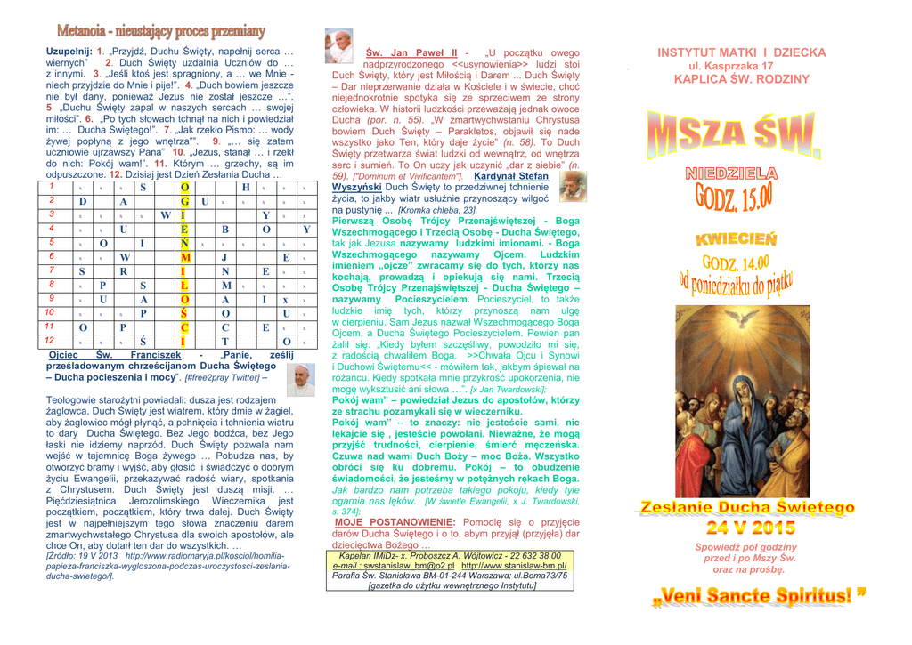 Uzupełnij: 1. „Przyjdź, Duchu Święty, napełnij serca … wiernych” 2. Duch Święty uzdalnia Uczniów do … z innymi. 3. „Jeśli ktoś jest spragniony, a … we Mnie niech przyjdzie do Mnie i pije!”. 4. „Duch bowiem jeszcze nie był dany, ponieważ Jezus nie został jeszcze …”. 5. „Duchu Święty zapal w naszych sercach … swojej miłości”. 6. „Po tych słowach tchnął na nich i powiedział im: … Ducha Świętego!”. 7. „Jak rzekło Pismo: … wody żywej popłyną z jego wnętrza””. 9. „… się zatem uczniowie ujrzawszy Pana” 10. „Jezus, stanął … i rzekł do nich: Pokój wam!”. 11. Którym … grzechy, są im odpuszczone. 12. Dzisiaj jest Dzień Zesłania Ducha … 1 x 2 D 3 x x x 4 x x U 5 x O 6 x x 7 S 8 x 9 x P U 10 x x 11 O 12 x x x S A x I W R x S A P P x x Ś O G U W I E Ń x M I Ł O Ś C I x H x x x x x x x Y O x x x x x B x J N M A O C T x x Y E x E x x x x x I x U x E x x O x Ojciec Św. Franciszek „Panie, ześlij prześladowanym chrześcijanom Ducha Świętego – Ducha pocieszenia i mocy”. [#free2pray Twitter] – Teologowie starożytni powiadali: dusza jest rodzajem żaglowca, Duch Święty jest wiatrem, który dmie w żagiel, aby żaglowiec mógł płynąć, a pchnięcia i tchnienia wiatru to dary Ducha Świętego. Bez Jego bodźca, bez Jego łaski nie idziemy naprzód. Duch Święty pozwala nam wejść w tajemnicę Boga żywego … Pobudza nas, by otworzyć bramy i wyjść, aby głosić i świadczyć o dobrym życiu Ewangelii, przekazywać radość wiary, spotkania z Chrystusem. Duch Święty jest duszą misji. … Pięćdziesiątnica Jerozolimskiego Wieczernika jest początkiem, początkiem, który trwa dalej. Duch Święty jest w najpełniejszym tego słowa znaczeniu darem zmartwychwstałego Chrystusa dla swoich apostołów, ale chce On, aby dotarł ten dar do wszystkich. … [Źródło: 19 V 2013 http://www.radiomaryja.pl/kosciol/homiliapapieza-franciszka-wygloszona-podczas-uroczystosci-zeslaniaducha-swietego/]. x Św. Jan Paweł II „U początku owego nadprzyrodzonego <<usynowienia>> ludzi stoi Duch Święty, który jest Miłością i Darem ... Duch Święty – Dar nieprzerwanie działa w Kościele i w świecie, choć niejednokrotnie spotyka się ze sprzeciwem ze strony człowieka. W historii ludzkości przeważają jednak owoce Ducha (por. n. 55). „W zmartwychwstaniu Chrystusa bowiem Duch Święty – Parakletos, objawił się nade wszystko jako Ten, który daje życie” (n. 58). To Duch Święty przetwarza świat ludzki od wewnątrz, od wnętrza serc i sumień. To On uczy jak uczynić „dar z siebie” (n. 59). ["Dominum et Vivificantem"]. Kardynał Stefan Wyszyński Duch Święty to przedziwnej tchnienie życia, to jakby wiatr usłużnie przynoszący wilgoć na pustynię ... [Kromka chleba, 23]. Pierwszą Osobę Trójcy Przenajświętszej - Boga Wszechmogącego i Trzecią Osobę - Ducha Świętego, tak jak Jezusa nazywamy ludzkimi imionami. - Boga Wszechmogącego nazywamy Ojcem. Ludzkim imieniem „ojcze” zwracamy się do tych, którzy nas kochają, prowadzą i opiekują się nami. Trzecią Osobę Trójcy Przenajświętszej - Ducha Świętego – nazywamy Pocieszycielem. Pocieszyciel, to także ludzkie imię tych, którzy przynoszą nam ulgę w cierpieniu. Sam Jezus nazwał Wszechmogącego Boga Ojcem, a Ducha Świętego Pocieszycielem. Pewien pan żalił się: „Kiedy byłem szczęśliwy, powodziło mi się, z radością chwaliłem Boga. >>Chwała Ojcu i Synowi i Duchowi Świętemu<< - mówiłem tak, jakbym śpiewał na różańcu. Kiedy spotkała mnie przykrość upokorzenia, nie mogę wyksztusić ani słowa …”. [x Jan Twardowski]; Pokój wam” – powiedział Jezus do apostołów, którzy ze strachu pozamykali się w wieczerniku. Pokój wam” – to znaczy: nie jesteście sami, nie lękajcie się , jesteście powołani. Nieważne, że mogą przyjść trudności, cierpienie, śmierć męczeńska. Czuwa nad wami Duch Boży – moc Boża. Wszystko obróci się ku dobremu. Pokój – to obudzenie świadomości, że jesteśmy w potężnych rękach Boga. Jak bardzo nam potrzeba takiego pokoju, kiedy tyle ogarnia nas lęków. [W świetle Ewangelii, x J. Twardowski, INSTYTUT MATKI I DZIECKA . ul. Kasprzaka 17 KAPLICA ŚW. RODZINY s. 374]; MOJE POSTANOWIENIE: Pomodlę się o przyjęcie darów Ducha Świętego i o to, abym przyjął (przyjęła) dar dziecięctwa Bożego … Kapelan IMiDz- x. Proboszcz A. Wójtowicz - 22 632 38 00 e-mail : [email protected] http://www.stanislaw-bm.pl/ Parafia Św. Stanisława BM-01-244 Warszawa; ul.Bema73/75 [gazetka do użytku wewnętrznego Instytutu] Spowiedź pół godziny przed i po Mszy Św. oraz na prośbę. Przyjdź, Duchu Święty, napełnij serca swoich wiernych i zapal w nich ogień swojej miłości. J 7,37-39 (Msza wigilii) W ostatnim zaś, najbardziej uroczystym dniu Święta Namiotów, Jezus stojąc zawołał donośnym głosem: Jeśli ktoś jest spragniony, a wierzy we Mnie - niech przyjdzie do Mnie i pije! Jak rzekło Pismo: Strumienie wody żywej popłyną z jego wnętrza. A powiedział to o Duchu, którego mieli otrzymać wierzący w Niego; Duch bowiem jeszcze nie był dany, ponieważ Jezus nie został jeszcze uwielbiony. Tylko spragnieni otrzymują Ducha Świętego, tylko ci, którzy zbliżają się do Jezusa i o ten dar proszą. Całą swoją istotą „wzdychając i oczekując przybrania za synów”. W ramionach Boga odnajdują swoje miejsce. A to pozwala im mówić w języku, który staje się zrozumiały nawet dla wrogów. Ustaje zgorszenie podziału; to, co umarłe, ożywa. Duch Święty to powiew życia z samego jego Źródła, to Sprawca nowego stworzenia. Na Niego czekamy, by dokonał przemiany nas samych i świata, w którym żyjemy. [T. Zamorski OP, „Oremus” Okres Wielkanocny 2009, s. 198]. J 20,19-23 (Msza w dzień) Wieczorem w dniu Zmartwychwstania, tam gdzie przebywali uczniowie, gdy drzwi były zamknięte z obawy przed Żydami, przyszed