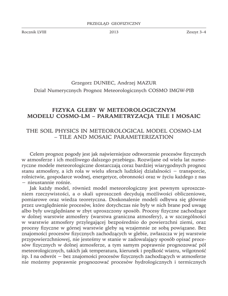 PRZEGLĄD GEOFIZYCZNY Rocznik LVIII 2013 Zeszyt 3–4 Grzegorz DUNIEC, Andrzej MAZUR Dział Numerycznych Prognoz Meteorologicznych COSMO IMGW-PIB FIZYKA GLEBY W METEOROLOGICZNYM MODELU COSMO-LM – PARAMETRYZACJA TILE I MOSAIC THE SOIL PHYSICS IN METEOROLOGICAL MODEL COSMO-LM – TILE AND MOSAIC PARAMETERIZATION Celem prognoz pogody jest jak najwierniejsze odtworzenie procesów fizycznych w atmosferze i ich możliwego dalszego przebiegu. Rozwijane od wielu lat numeryczne modele meteorologiczne dostarczają coraz bardziej wiarygodnych prognoz stanu atmosfery, a ich rola w wielu sferach ludzkiej działalności − transporcie, rolnictwie, gospodarce wodnej, energetyce, obronności oraz w życiu każdego z nas − nieustannie rośnie. Jak każdy model, również model meteorologiczny jest pewnym uproszczeniem rzeczywistości, a o skali uproszczeń decydują możliwości obliczeniowe, pomiarowe oraz wiedza teoretyczna. Doskonalenie modeli odbywa się głównie przez uwzględnienie procesów, które dotychczas nie były w nich brane pod uwagę albo były uwzględniane w zbyt uproszczony sposób. Procesy fizyczne zachodzące w dolnej warstwie atmosfery (warstwa graniczna atmosfery), a w szczególności w warstwie atmosfery przylegającej bezpośrednio do powierzchni ziemi, oraz procesy fizyczne w górnej warstwie gleby są wzajemnie ze sobą powiązane. Bez znajomości procesów fizycznych zachodzących w glebie, zwłaszcza w jej warstwie przypowierzchniowej, nie jesteśmy w stanie w zadowalający sposób opisać procesów fizycznych w dolnej atmosferze, a tym samym poprawnie prognozować pól meteorologicznych, takich jak temperatura, kierunek i prędkość wiatru, wilgotność itp. I na odwrót − bez znajomości procesów fizycznych zachodzących w atmosferze nie możemy poprawnie prognozować procesów hydrologicznych i termicznych 164 G. Duniec, A. Mazur zachodzących w glebie. A przecież prognoza stanu gleby, a w szczególności prognoza jej wilgotności i temperatury, jest niezwykle istotna dla rolników, ogrodników, leśników i wszystkich zajmujących się uprawą roślin. Modelem meteorologicznym wykorzystywanym w numerycznym systemie prognozy pogody w Instytucie Meteorologii i Gospodarki Wodnej (IMGW) od 2001 r. jest model COSMO-LM (Consortium for Small-Scale Modelling). Jest to w pełni ściśliwy, niehydrostatyczny model oparty na prawach zachowania masy, pędu i energii. Dla obszaru Polski model jest liczony w domenie 2695 km × 2247 km. Dane wyjściowe z modelu są otrzymywane w przestrzennej siatce regularnej (385x321x40 oczek siatki). Rozdzielczość horyzontalna jest zatem równa 7 km, rozdzielczość w pionie – 40 poziomów, a krok czasowy to 40 s. Horyzont czasowy prognozy wynosi 78 godzin. Model jest zaimplementowany w Instytucie Meteorologii i Gospodarki Wodnej (IMGW-PIB) na klastrze linuksowym, opartym na procesorach IntelXeon X5570. W cyklu dobowym realizowane są dwa przebiegi modelu wykonywane o godzinie 0 i 12 UTC. Warunki brzegowe i początkowe otrzymywane są z modelu globalnego o nazwie GME, który jest zaimplementowany w DWD (Deutscher Wetterdienst) w Niemczech (Majewski i in., 2002). Na styku gleby i atmosfery zachodzi szereg złożonych procesów hydrologicznych i termicznych (Warner, 2011), które wzajemnie na siebie oddziałują. Przebieg procesów zachodzących w glebie zależy od wielu czynników, głównie zaś od jej typu, który odzwierciedla właściwości fizyczne gleby, pokrycia gleby, położenia i otoczenia kompleksu glebowego, wilgotności gleby i warunków atmosferycznych. W związku ze znacznym zróżnicowaniem typów gleb i pokrycia terenowego skala procesów zachodzących w glebie jest znacznie mniejsza niż rozdzielczość siatki obliczeniowej we współczesnych modelach meteorologicznych, także w modelu COSMO-LM. Zatem procesy zachodzące w glebie są dla modelu procesami podskalowymi. Aby właściwie je odwzorować, należy uwzględnić średni wpływ tych procesów na procesy zachodzące w większej skali, co nazywa się parametryzacją. Właściwa parametryzacja procesów zachodzących w glebie jest konieczna do uzyskania wiarygodnych prognoz warunków atmosferycznych i agrofizycznych. Którą parametryzację należy jednak uznać za właściwą? W artykule częściowo dana jest odpowiedź na to pytanie. Odwzorowanie procesów fizycznych zachodzących w glebie w numerycznym modelu meteorologicznym COSMO – LM Opis matematyczny procesów fizycznych w glebie nie jest sprawą prostą. Jak to zostało stwierdzone powyżej, skala procesów zachodzących w glebie jest na ogół znacznie mniejsza niż rozdzielczość siatki numerycznej modelu. Procesy podskalowe można albo pominąć, w nadziei, że ich wpływ na prognozowane Fizyka gleby w meteorologicznym ... 165 pola meteorologiczne będzie niewielki, albo uwzględnić, stosując parametryzację. Schematów parametryzacyjnych jest bardzo wiele. Zainteresowanym plecamy ksiażkę Davida J. S t e n s r u d a (2007) Parameterization Schemes. Key to Understanding Numerical Weather Prediction Models. W modelu COSMO-LM rutynowo są stosowane dwa schematy parametryzacji procesów fizycznych zachodzących w glebie, TERRA i TERRA_ML (Doms i in., 2011). W obu schematach zakłada się, że warunki glebowe i pokrycie terenu w całym oczku siatki modelu meteorologicznego są jednorodne. W schemacie TERRA obszar pomiędzy powierzchnią ziemi a warstwą klimatologiczną, tj. obszarem, gdzie zmiany warunków meteorologicznych nie mają już wpływu na procesy fizyczne zachodzące w glebie, jest podzielony na dwie warstwy (Doms i in., 2011). W parametryzacji TERRA_ML obszar pomiędzy powierzchnią ziemi a warstwą klimatologiczną dzieli się na 6 warstw dla opisu procesów hydrologicznych (do 2,43 m p.p.z.) i 7 warstw dla opisu procesów termicznych (do 21,87 m. p.p.z.), o różnej grubości, zwiększającej się wraz z głębokością. Ze szczegółowym opisem matematycznym zjawisk zachodzących w gleb