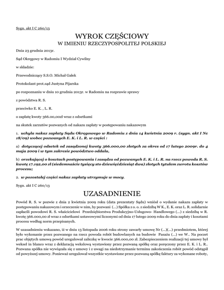 Sygn. akt I C 260/13 WYROK CZĘŚCIOWY W IMIENIU RZECZYPOSPOLITEJ POLSKIEJ Dnia 23 grudnia 2013r. Sąd Okręgowy w Radomiu I Wydział Cywilny w składzie: Przewodniczący S.S.O. Michał Gałek Protokolant prot.sąd Justyna Pijarska po rozpoznaniu w dniu 10 grudnia 2013r. w Radomiu na rozprawie sprawy z powództwa R. S. przeciwko E. K. , L. R. o zapłatę kwoty 366.00,00zł wraz z odsetkami na skutek zarzutów pozwanych od nakazu zapłaty w postępowaniu nakazowym 1. uchyla nakaz zapłaty Sądu Okręgowego w Radomiu z dnia 14 kwietnia 2009 r. (sygn. akt I Nc 18/09) wobec pozwanych E. K. i L. R. w części : a) dotyczącej odsetek od zasądzonej kwoty 366.000,00 złotych za okres od 17 lutego 2009r. do 4 maja 2009 i w tym zakresie powództwo oddala, b) orzekającej o kosztach postępowania i zasądza od pozwanych E. K. i L. R. na rzecz powoda R. S. kwotę 17.192,00 zł (siedemnaście tysięcy sto dziewięćdziesiąt dwa) złotych tytułem zwrotu kosztów procesu; 2. w pozostałej części nakaz zapłaty utrzymuje w mocy. Sygn. akt I C 260/13 UZASADNIENIE Powód R. S. w pozwie z dnia 2 kwietnia 2009 roku (data prezentaty Sądu) wniósł o wydanie nakazu zapłaty w postępowaniu nakazowym i orzeczenie w nim, by pozwani (...) Spółka z o. o. z siedzibą W K., E. K. oraz L. R. solidarnie zapłacili powodowi R. S. właścicielowi Przedsiębiorstwa Produkcyjno-Usługowo- Handlowego (...) z siedzibą w R. kwotę 366.000,00 zł wraz z odsetkami ustawowymi liczonymi od dnia 17 lutego 2009 roku do dnia zapłaty i kosztami procesu według norm przepisanych. W uzasadnieniu wskazano, iż w dniu 13 listopada 2006 roku strony zawarły umowę Nr (...)(...) przedmiotem, której było wykonanie przez pozwanego na rzecz powoda robót budowlanych na budowie Pasażu (...) we W.. Na poczet prac objętych umową powód uregulował zaliczkę w kwocie 366.000,00 zł. Zabezpieczeniem realizacji tej umowy był weksel in blanco wraz z deklaracją wekslową wystawiony przez pozwaną spółkę oraz poręczony przez E. K. i L. R.. Pozwana spółka nie wywiązała się z umowy i z uwagi na niedotrzymanie terminu zakończenia robót powód odstąpił od powyższej umowy. Ponieważ uregulował wszystkie wystawione przez pozwaną spółkę faktury za wykonane roboty, doszło do nadpłaty kwoty 366.000,00 zł. Pozwany nie zwrócił tej kwoty, w związku z tym powód zgodnie z deklaracją wekslową wypełnił weksel i wystąpił do wystawcy oraz poręczycieli o zapłatę tej kwoty (pozew - k. 3-4). W dniu 14 kwietnia 2009 roku w sprawie l Nc 18/09 Sąd Okręgowy w Radomiu wydał nakaz zapłaty w postępowaniu nakazowym, w którym orzeczono zgodnie z żądaniem pozwu (nakaz zapłaty - k. 73). W zarzutach od nakazu zapłaty z dnia 6 maja 2009 roku pozwani wnieśli o uchylenie nakazu zapłaty, oddalenie powództwa w całości oraz zasądzenie kosztów procesu. Podnieśli, że weksel nie jest ważny, gdyż nie zawiera prawidłowego podpisu wystawcy. Ponadto wskazali, że został on wystawiony jako zabezpieczenie zaliczki, które to zobowiązanie zostało już przez pozwaną uregulowane i nie istnieje zobowiązanie zabezpieczone wekslem. Wskazali również, że warunkiem dochodzenia roszczeń jest prawidłowe zawiadomienie o uzupełnieniu weksla, a pozwani o tym fakcie nie zostali powiadomieni i wezwani do wykupu weksla. Powód nie wykazał także, że pozwana spółka nie wywiązywała się z postanowień umownych i nie przedstawił dowodów na to, że nie dotrzymała terminu realizacji robót budowlanych (zarzuty pozwanych od nakazu zapłaty - k. 78-80). W odpowiedzi na zarzuty pozwanych, w piśmie procesowym z dnia 25 listopada 2009 roku powód wniósł o oddalenie zarzutów pozwanych utrzymanie nakazu zapłaty w mocy. Wskazał, że weksel jest wypełniony w sposób prawidłowy, gdyż z deklaracji wekslowej wynika, że osoby podpisujące weksel działały jako organ spółki. Nie ma również przepisu wymagającego od strony wysłania dłużnikowi kopii wypełnionego weksla. Podkreślił, że w jego ocenie zaistniały przesłanki wymienione w deklaracji wekslowej do wypełnienia weksla, gdyż pozwana spółka nie wywiązywała się z postanowień umownych, (pismo procesowe - k. 144 - 145) Po przeprowadzeniu rozprawy Sąd Okręgowy wyrokiem wydanym w dniu 10 sierpnia 2011r. utrzymał w mocy w całości wydany nakaz zapłaty . Na skutek apelacji pozwanych Sąd Apelacyjny w Lublinie uchylił zaskarżony wyrok w całości i przekazał sprawę Sądowi Okręgowemu w Radomiu do ponownego rozpoznania, pozostawiając temu Sądowi rozstrzygnięcie o kosztach instancji odwoławczej ( wyrok z dnia 20.11.2012r. sygn. akt l ACa 323/12 k.622 ) . W uzasadnieniu swojego rozstrzygnięcia Sąd Apelacyjny nakazał Sądowi Okręgowemu przy ponownym rozpoznaniu sprawy, aby wezwał powoda do sprecyzowania żądania, przez wskazanie podstawy faktycznej żądania, a następnie przeprowadził postępowanie dowodowe, mając na uwadze treść art. 495 § 3 k.p.c. (obowiązującego w dacie wszczęcia postępowania). Następnie kierując się przy ocenie dowodów zasadami wyrażonymi w art. 233 § 1 k.p.c., Sąd Okręgowy powinien rozważyć zasadność żądania opartego na wekslu uwzględniając poczynione uwagi dotyczące charakteru podpisów A. K. i G. R., ustosunkować się do zarzutów braku przedstawienia weksla do zapłaty, mając na uwadze treść art. 38 prawa wekslowego. Sąd Okręgowy powinien mieć na uwadze, że żądanie pozwu powód opierał również na stosunku podstawowym i twierdzeniach o nienależytym wykonaniu zobowiązania przez pozwaną spółkę dlatego szczegółowo należy ustosunkować się do wszystkich zarzutów pozwanych podniesionych w zarzutach od nakazu zapłaty. Wykonując zobowiązanie Sądu pełnomocnik powoda w piśmie procesowym z dnia 28.03.2013r. sprecyzował żądanie pozwu w ten sposób, że żądana kwota 366.000,00 zł stanowi zwrot zaliczki wypłaconej pozwanej spółce zgodnie z fakturą VAT nr (...). W stosun