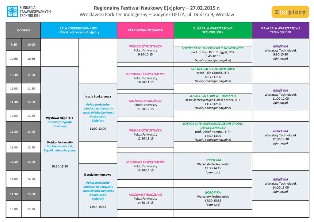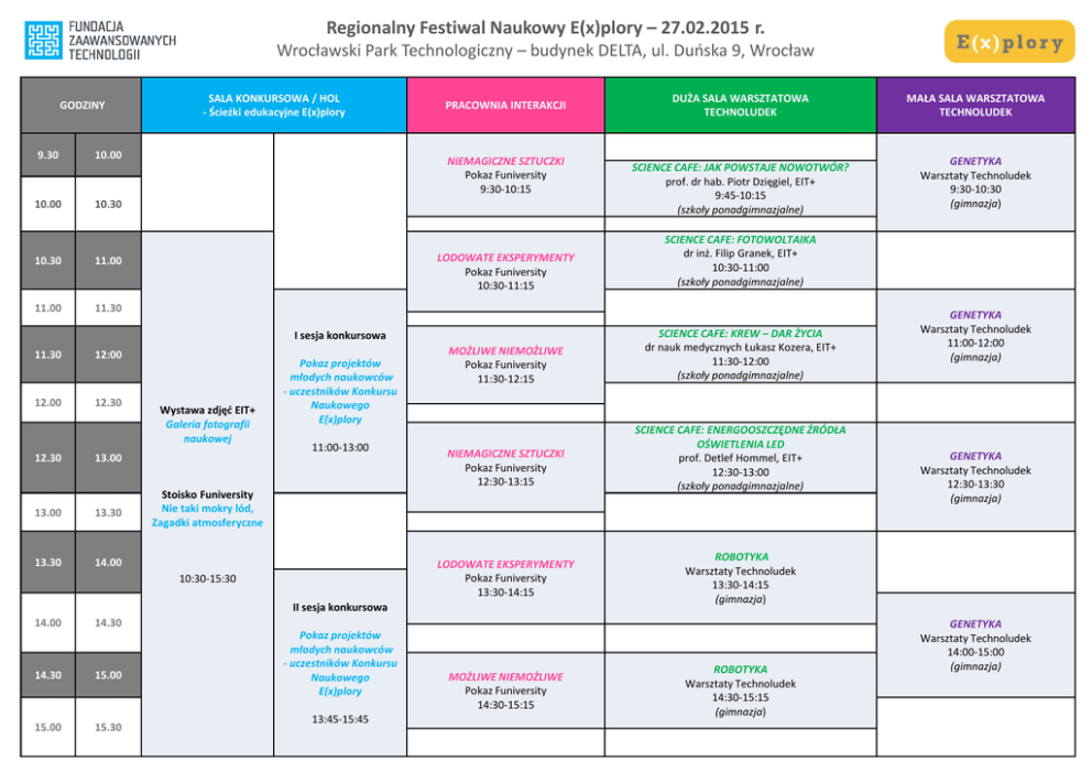 Regionalny Festiwal Naukowy E(x)plory – 27.02.2015 r. Wrocławski Park Technologiczny – budynek DELTA, ul. Duńska 9, Wrocław GODZINY 9.30 10.00 SALA KONKURSOWA / HOL - Ścieżki edukacyjne E(x)plory 10.00 PRACOWNIA INTERAKCJI NIEMAGICZNE SZTUCZKI Pokaz Funiversity 9:30-10:15 10.30 10.30 11.00 11.00 11.30 LODOWATE EKSPERYMENTY Pokaz Funiversity 10:30-11:15 12:00 12.00 12.30 12.30 13.00 13.00 13.30 13.30 14.00 Wystawa zdjęć EIT+ Galeria fotografii naukowej Pokaz projektów młodych naukowców - uczestników Konkursu Naukowego E(x)plory 11:00-13:00 NIEMAGICZNE SZTUCZKI Pokaz Funiversity 12:30-13:15 SCIENCE CAFE: ENERGOOSZCZĘDNE ŹRÓDŁA OŚWIETLENIA LED prof. Detlef Hommel, EIT+ 12:30-13:00 (szkoły ponadgimnazjalne) LODOWATE EKSPERYMENTY Pokaz Funiversity 13:30-14:15 II sesja konkursowa 14.00 14.30 15.00 15.00 15.30 13:45-15:45 MOŻLIWE NIEMOŻLIWE Pokaz Funiversity 14:30-15:15 GENETYKA Warsztaty Technoludek 9:30-10:30 (gimnazja) GENETYKA Warsztaty Technoludek 11:00-12:00 (gimnazja) GENETYKA Warsztaty Technoludek 12:30-13:30 (gimnazja) ROBOTYKA Warsztaty Technoludek 13:30-14:15 (gimnazja) 14.30 Pokaz projektów młodych naukowców - uczestników Konkursu Naukowego E(x)plory MAŁA SALA WARSZTATOWA TECHNOLUDEK SCIENCE CAFE: FOTOWOLTAIKA dr inż. Filip Granek, EIT+ 10:30-11:00 (szkoły ponadgimnazjalne) SCIENCE CAFE: KREW – DAR ŻYCIA dr nauk medycznych Łukasz Kozera, EIT+ 11:30-12:00 (szkoły ponadgimnazjalne) Stoisko Funiversity Nie taki mokry lód, Zagadki atmosferyczne 10:30-15:30 SCIENCE CAFE: JAK POWSTAJE NOWOTWÓR? prof. dr hab. Piotr Dzięgiel, EIT+ 9:45-10:15 (szkoły ponadgimnazjalne) MOŻLIWE NIEMOŻLIWE Pokaz Funiversity 11:30-12:15 I sesja konkursowa 11.30 DUŻA SALA WARSZTATOWA TECHNOLUDEK ROBOTYKA Warsztaty Technoludek 14:30-15:15 (gimnazja) GENETYKA Warsztaty Technoludek 14:00-15:00 (gimnazja) Warsztaty i pokazy naukowe E(x)plory - opis atrakcji LODOWATE EKSPERYMENTY Pokaz Funiversity 10:30-11:15; 13:30-14:15 MOŻLIWE NIEMOŻLIWE Pokaz Funiversity 11:30-12:15; 14:30-15:15 NIEMAGICZNE SZTUCZKI Pokaz Funiversity 9:30-10:15; 12:30-13:15 Przez moment powieje chłodem, bowiem będziemy wykonywać mnóstwo eksperymentów z substancją o temperaturze –200 °C i nie tylko. Ciekły azot i suchy lód mają naprawdę niesamowite właściwości o czym będziecie mieli okazję się przekonać. Sprawimy, że żywy kwiat pokruszy się na drobne kawałki jak porcelanowy wazonik, cukrowe pianki staną się chrupiące, a metalowa łyżeczka zacznie piszczeć z zimna. Na tym pokazie niemożliwe stanie się możliwe dzięki wykorzystaniu praw fizyki i chemii. Zgłębiając tajniki nauki sprawimy, że wlana do szklanki woda zniknie, pokażemy jak zdobyć względy dziewczyny poprzez zmianę koloru kwiatka na jej ulubiony, pomożemy naszemu zaokrąglonemu przyjacielowi przecisnąć się przez cienką szyjkę kolby, a na koniec stworzymy bardzo wydajną pastę do zębów dla słonia. Oj będzie się działo!!! Zaprezentujemy sztuczki godne najlepszych iluzjonistów! Podczas występu wywołamy dżina z butelki, spróbujemy odgadnąć o czym myśli zaproszony przez nas na scenę ochotnik, po czym z niewielkiej ilości proszku wyczarujemy mnóstwo śniegu, który nie rozpuści się w czerwcowej aurze. A na dodatek objaśnimy jak powstały te wszystkie nieprawdopodobne zjawiska. Pokaz dla 50 osób (szkoły gimnazjalne i ponadgimnazjalne) Pokaz dla 50 osób (szkoły gimnazjalne i ponadgimnazjalne) Pokaz dla 50 osób (szkoły gimnazjalne i ponadgimnazjalne) Warsztaty i pokazy naukowe E(x)plory - opis atrakcji SCIENCE CAFE. ROZMOWY O NAUCE EIT+ JAK POWSTAJE NOWOTWÓR? Prelegent: prof. dr hab. Piotr Dzięgiel 9:45-10:15 W drugiej połowie XIX wieku, Rudolph Virchow dzięki badaniom mikroskopowym stwierdził, że guz nowotworowy to nic innego, tylko zmutowane komórki organizmu człowieka, które uległy zmianom genetycznym powstałym w wyniku pewnych osobniczych predyspozycji oraz długotrwałej ekspozycji na czynniki uszkadzające DNA. Hipoteza ta stała się podstawą do dalszych badań, które miały na celu m. in. wykazać, że komórki nowotworowe mogą być źródłem wydzielanych do krwi oraz płynów ustrojowych specyficznych substancji. Dzięki możliwości ich detekcji udałoby się wykryć wczesne stadium choroby nowotworowej, a co za tym idzie skutecznie ją zwalczać. Pomimo ponad stu lat badań takich substancji (markerów), nie udało się zidentyfikować w zdecydowanej większości typów nowotworów człowieka. Jednak paradoksalnie, pomimo licznych niepowodzeń w tej dziedzinie badań naukowych, przyniosły one także wymierne sukcesy, o których opowie prof. Piotr Dzięgiel z Wrocławskiego Centrum Badań EIT+. Prelekcja dla 30 osób (szkoły ponadgimnazjalne) FOTOWOLTAIKA: JAK NAUKOWIEC MOŻE PRZYCZYNIĆ SIĘ DO ROZPOWSZECHNIENIA WYKORZYSTANIA ENERGII SŁONECZNEJ NA ZIEMI? Prelegent: dr inż. Filip Granek 10:30-11:00 W dzisiejszym świecie trudno sobie wyobrazić codzienne życie bez dostępu do paliw kopalnych, ale wciąż wzrastające ceny ropy i energii, wyczerpywanie złóż surowców energetycznych oraz coraz wyższa świadomość ekologiczna mieszkańców naszego globu spowodowały, że zaczęto szukać innych źródeł energii. Największym i do tej pory niedocenionym źródłem nieograniczonej i czystej energii jest Słońce. Promieniowanie słoneczne docierające do powierzchni ziemi występuje powszechnie, a jego wartość w ciągu 14 dni wynosi tyle, co całoroczne zapotrzebowanie energetyczne naszej planety. Czym jest zatem fotowoltaika, jakie znajduje obecnie zastosowanie i czy możliwy jest świat bez ropy? Na te pytania odpowie dr inż. Filip Granek z Wrocławskiego Centrum Badań EIT+, który pracuje m.in. nad drukowanymi ogniwami słonecznymi. Prelekcja dla 30 osób (szkoły ponadgimnazjalne) Warsztaty i pokazy naukowe E(x)plory - opis atrakcji SCIENCE CAFE. ROZMOWY O NAUCE EIT+ KREW – DAR ŻYCIA Prelegent: dr nauk medycznych Łukasz Kozera - kierownik Bio