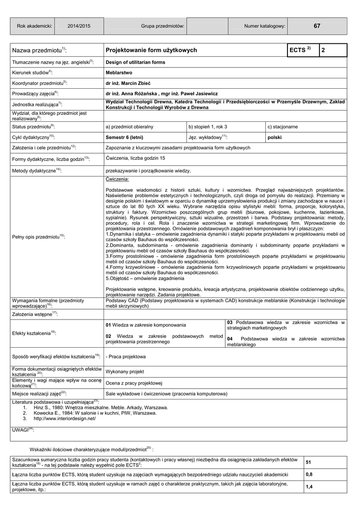 Projektowanie form użytkowych ECTS 2) 2