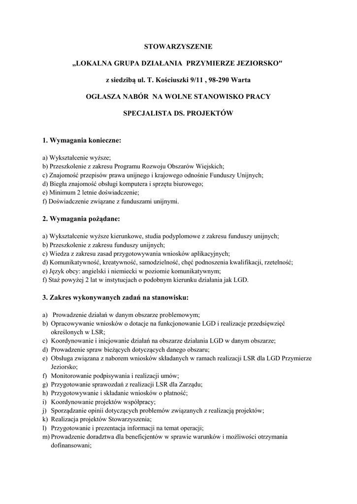 STOWARZYSZENIE „LOKALNA GRUPA DZIAŁANIA PRZYMIERZE JEZIORSKO" z siedzibą ul. T. Kościuszki 9/11 , 98-290 Warta OGŁASZA NABÓR NA WOLNE STANOWISKO PRACY SPECJALISTA DS. PROJEKTÓW 1. Wymagania konieczne: a) Wykształcenie wyższe; b) Przeszkolenie z zakresu Programu Rozwoju Obszarów Wiejskich; c) Znajomość przepisów prawa unijnego i krajowego odnośnie Funduszy Unijnych; d) Biegła znajomość obsługi komputera i sprzętu biurowego; e) Minimum 2 letnie doświadczenie; f) Doświadczenie związane z funduszami unijnymi. 2. Wymagania pożądane: a) Wykształcenie wyższe kierunkowe, studia podyplomowe z zakresu funduszy unijnych; b) Przeszkolenie z zakresu funduszy unijnych; c) Wiedza z zakresu zasad przygotowywania wniosków aplikacyjnych; d) Komunikatywność, kreatywność, samodzielność, chęć podnoszenia kwalifikacji, rzetelność; e) Język obcy: angielski i niemiecki w poziomie komunikatywnym; f) Staż powyżej 2 lat w instytucjach o podobnym kierunku działania jak LGD. 3. Zakres wykonywanych zadań na stanowisku: a) Prowadzenie działań w danym obszarze problemowym; b) Opracowywanie wniosków o dotacje na funkcjonowanie LGD i realizacje przedsięwzięć określonych w LSR; c) Koordynowanie i inicjowanie działań na obszarze działania LGD w danym obszarze; d) Prowadzenie spraw bieżących dotyczących danego obszaru; e) Obsługa związana z naborem wniosków składanych w ramach realizacji LSR dla LGD Przymierze Jeziorsko; f) Monitorowanie podpisywania i realizacji umów; g) Przygotowanie sprawozdań z realizacji LSR dla Zarządu; h) Przygotowywanie i składanie wniosków o płatność; i) Koordynowanie projektów współpracy; j) Sporządzanie opinii dotyczących problemów związanych z realizacją projektów; k) Realizacja projektów Stowarzyszenia; l) Przygotowanie i prezentacja informacji na temat operacji; m) Prowadzenie doradztwa dla beneficjentów w sprawie warunków i możliwości otrzymania dofinansowani; n) Wykonywanie innych praz wynikających z bieżących działań biura LGD , w tym prowadzenie sekretariatu.. 4. Wymagane dokumenty: a) życiorys (CV); b) list motywacyjny; c) dokument poświadczający wykształcenie (dyplom lub zaświadczenie o stanie odbytych studiów); d) kwestionariusz osobowy (dostępny na stronie: www.przymierzejeziorsko.pl) e) inne dodatkowe dokumenty o posiadanych kwalifikacjach i umiejętnościach. Wymagane dokumenty należy składać osobiście w siedzibie Biura LGD lub pocztą na adres: Stowarzyszenie „LGD - Przymierze Jeziorsko” ul. T. Kościuszki 9/11, 98-290 Warta z dopiskiem: Dotyczy naboru na wolne stanowisko: Specjalista ds. projektów. Termin składania dokumentów od 13.06.2013r. do 28.06.2013r. Dokumenty, które wpłyną po wyżej określonym terminie nie będą rozpatrywane. Informacja o wyniku naboru będzie umieszczana na tablicy ogłoszeń w siedzibie Biura LGD oraz na stronie internetowej LGD . Wymagane dokumenty: list motywacyjny, szczegółowe CV (z uwzględnieniem dokładnego przebiegu kariery zawodowej), powinny być opatrzone klauzulą: „Wyrażam zgodę na przetwarzanie moich danych osobowych zawartych w ofercie pracy dla potrzeb niezbędnych do realizacji procesu rekrutacji zgodnie z ustawa z dnia 29 sierpnia 1997r. o ochronie danych osobowych (DzU. z 2002r. Nr 101, poz. 926 z pózn. zm.)”. Kwestionariusz osobowy dostępny jest na naszej stronie: www.przymierzejeziorsko.pl