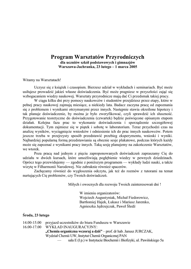 Program Warsztatów Przyrodniczych dla uczniów szkół podstawowych i gimnazjów Warszawa-Jachranka, 23 lutego – 1 marca 2005 Witamy na Warsztatach! Uczysz się z książek i czasopism. Bierzesz udział w wykładach i seminariach. Być może usiłujesz prowadzić jakieś własne doświadczenia. Być może pragniesz w przyszłości zająć się wzbogacaniem wiedzy naukowej. Warsztaty przyrodnicze mają dać Ci przedsmak takiej pracy. W ciągu kilku dni przy pomocy naukowców i studentów przejdziesz przez etapy, które w pełnej pracy naukowej zajmują miesiące, a niekiedy lata. Badacz zaczyna pracę od zapoznania się z problemem i wynikami otrzymanymi przez innych. Następnie stawia określone hipotezy i tak planuje doświadczenie, by można je było zweryfikować, czyli sprawdzić ich słuszność. Przygotowanie teoretyczne do doświadczenia (czwartek) będzie poświęcone opisanym etapom działań. Kolejna faza prac to wykonanie doświadczenia i sporządzenie szczegółowej dokumentacji. Tym zajmiesz się w piątek i sobotę w laboratorium. Teraz przychodzi czas na analizę wyników, wyciągnięcie wniosków i odniesienie ich do prac innych naukowców. Potem jeszcze trzeba w przejrzysty sposób przedstawić przebieg eksperymentu, wnioski i wyniki. Najbardziej popularną formą przedstawiania są obecnie sesje plakatowe, podczas których każdy może się zapoznać z wynikami pracy innych. Taką sesję planujemy na zakończenie Warsztatów, we wtorek. Poza pracą nad jednym z pięciu zaproponowanych doświadczeń zapraszamy Cię do udziału w dwóch kursach, które umożliwiają pogłębienie wiedzy w pewnych dziedzinach. Oprócz tego przewidujemy — zgodnie z poniższym programem — wykłady ludzi nauki, a także wizytę w Filharmonii Narodowej. Nie zabraknie również spacerów. Zachęcamy również do wygłoszenia odczytu, jak też do rozmów z tutorami na temat nurtujących Cię problemów, czy Twoich doświadczeń. Miłych i owocnych dla rozwoju Twoich zainteresowań dni ! W imieniu organizatorów: Wojciech Augustyniak, Michał Fiedorowicz, Bartłomiej Hajek, Łukasz i Mariusz Jaremko, Agnieszka Jędrzejczak, Paweł Śledź Środa, 23 lutego 14.00-15.00 16.00-17.00 przyjazd uczestników do biura Funduszu w Warszawie WYKŁAD INAUGURACYJNY: „Chemia organiczna wczoraj a dziś” – prof. dr hab. Janusz JURCZAK, Wydział Chemii UW, Instytut Chemii Organicznej PAN — sala E (I p.) w Instytucie Biochemii i Biofizyki, ul. Pawińskiego 5a 2 przyjazd do Jachranki, rozlokowanie się w pokojach kolacja zebranie organizacyjne cisza nocna 18.15 19.00 20.00 22.00 Czwartek, 24 lutego 7.30 8.00 9.30-11.15 — — — 11.30-13.15 — — — — — 13.30 14.30-15.30 16.00-18.15 18.15 22.00 budzimy się śniadanie KRÓTKI KURS I - część 1; do wyboru jedna z trzech pozycji: „Pospolite mszaki polskich lasów” – Bartłomiej Hajek, Wydział Biologii, Geografii i Oceanologii Uniwersytetu Gdańskiego „Wstęp do podstaw termodynamiki: o prawie Hessa” – Paweł Śledź, MISMaP UW „Szczególna teoria względności” – Bartłomiej Szczygieł, Wydział Fizyki UW PRZYGOTOWANIE TEORETYCZNE DO DOŚWIADCZENIA: „Wprowadzenie do syntezy organicznej na przykładzie chemii Nhydroksysukcynoimidu” – Łukasz i Mariusz Jaremko, Wydział Chemii i Wydział Nauk Przyrodniczych Uniwersytetu Wrocławskiego „O procesach możemy powiedzieć nie tylko czy zachodzą, ale też jak szybko, czyli o kinetyce chemicznej” – Paweł Śledź, MISMaP UW „Jak dobrze strzelać z armaty?” – Marcin Suszczewicz, MISMaP UW „Jak rośliny fotosyntetyzują” – Marta Świerczyńska, MISMaP UW, Karolina Czarnecka, Wydział Biologii UW i Sylwia Szczepaniak, MISMaP UW „Jak wykorzystać porosty do oceny zanieczyszczenia powietrza?” – Michał Fiedorowicz, Wydział Biologii UW, IMDiK PAN, Bartłomiej Hajek, Wydział Biologii, Geografii i Oceanologii Uniwersytetu Gdańskiego obiad spacer po okolicy, zajęcia rekreacyjne KRÓTKI KURS I – część 2 kolacja cisza nocna Piątek, 25 lutego budzimy się śniadanie wyjazd do Warszawy WSZYSTKICH GRUP BADAWCZYCH OPRÓCZ „POROSTOWEJ”: 10.00-14.00 PRACA W LABORATORIACH : na Wydziale Chemii UW, ul. Pasteura 1 — „Wprowadzenie do syntezy organicznej na przykładzie chemii Nhydroksysukcynoimidu” – Łukasz i Mariusz Jaremko, Wydział Chemii i Wydział Nauk Przyrodniczych Uniwersytetu Wrocławskiego — „O procesach możemy powiedzieć nie tylko czy zachodzą, ale też jak szybko, czyli o kinetyce chemicznej” – Paweł Śledź, MISMaP UW na Wydziale Matematyki, Informatyki i Mechaniki UW, ul. Banacha 2 (wejście od ul. Pasteura) — „Jak dobrze strzelać z armaty?” – Marcin Suszczewicz, MISMaP UW w Instytucie Biochemii i Biofizyki PAN, ul. Pawińskiego 5a — „Jak rośliny fotosyntetyzują” – Marta Świerczyńska, MISMaP UW, Karolina Czarnecka, Wydział Biologii UW i Sylwia Szczepaniak, MISMaP UW 14.15 obiad (stołówka Instytutu Biochemii i Biofizyki, ul. Pawińskiego 5a) 7.30 8.15 9.00 3 ZAJĘCIA „JAK WYKORZYSTAĆ POROSTY DO OCENY ZANIECZYSZCZENIA POWIETRZA” w Jachrance: 8.30-12.30 zajęcia w terenie 13.00 obiad 13.30 wyjazd do Warszawy grupy „porostowej” 14.45-15.45 16.30-18.45 19.45 20.15 22.00 WYKŁAD: „Czarne dziury” – prof. Jerzy LEWANDOWSKI, Instytut Fizyki Teoretycznej UW — sala E (I p.) w Instytucie Biochemii i Biofizyki, ul. Pawińskiego 5a zwiedzanie wystawy „Mózg. Eksperyment i zabawa” w Pałacu Kultury i Nauki, (główne wejście od ul. Marszałkowskiej), parter i XXX piętro powrót do Jachranki kolacja cisza nocna Sobota, 26 lutego 7.30 budzimy się 8.00 śniadanie 8.30 wyjazd do Warszawy 10.00-14.00 PRACA W LABORATORIACH: na Wydziale Chemii UW, ul. Pasteura 1 — „Wprowadzenie do syntezy organicznej na przykładzie chemii Nhydroksysukcynoimidu” – Łukasz i Mariusz Jaremko, Wydział Chemii i Wydział Nauk Przyrodniczych Uniwersytetu Wrocławskiego — „O procesach możemy powiedzieć nie t