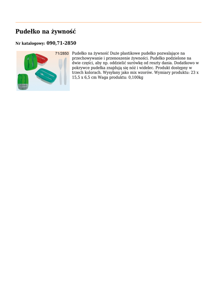 Pudełko na żywność Nr katalogowy: 090,71-2850 Pudełko na żywność Duże plastikowe pudełko pozwalające na przechowywanie i przenoszenie żywności. Pudełko podzielone na dwie części, aby np. oddzielić surówkę od reszty dania. Dodatkowo w pokrywce pudełka znajdują się nóż i widelec. Produkt dostępny w trzech kolorach. Wysyłany jako mix wzorów. Wymiary produktu: 23 x 15,5 x 6,5 cm Waga produktu: 0,100kg