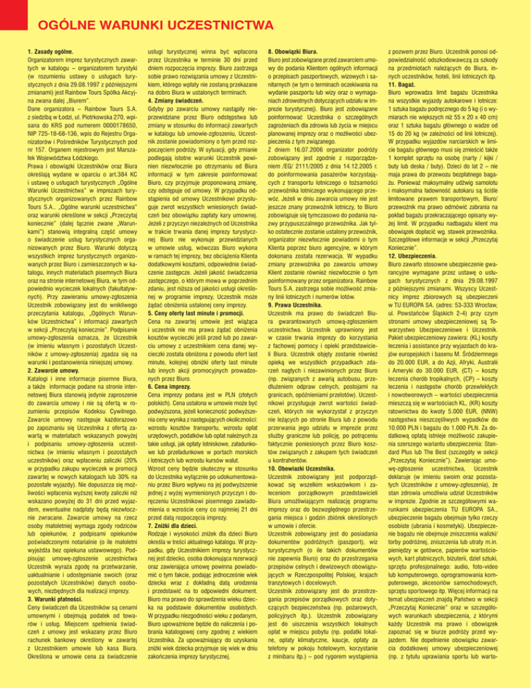 OGÓLNE WARUNKI UCZESTNICTWA 1. Zasady ogólne. Organizatorem imprez turystycznych zawartych w katalogu – organizatorem turystyki (w rozumieniu ustawy o usługach turystycznych z dnia 29.08.1997 z późniejszymi zmianami) jest Rainbow Tours Spółka Akcyjna zwana dalej „Biurem”. Dane organizatora – Rainbow Tours S.A. z siedzibą w Łodzi, ul. Piotrkowska 270, wpisana do KRS pod numerem 0000178650, NIP 725-18-68-136, wpis do Rejestru Organizatorów i Pośredników Turystycznych pod nr 157. Organem rejestrowym jest Marszałek Województwa Łódzkiego. Prawa i obowiązki Uczestników oraz Biura określają wydane w oparciu o art.384 KC i ustawę o usługach turystycznych „Ogólne Warunki Uczestnictwa” w imprezach turystycznych organizowanych przez Rainbow Tours S.A.. „Ogólne warunki uczestnictwa” oraz warunki określone w sekcji „Przeczytaj koniecznie” (dalej łącznie zwane „Warunkami”) stanowią integralną część umowy o świadczenie usług turystycznych organizowanych przez Biuro. Warunki dotyczą wszystkich imprez turystycznych organizowanych przez Biuro i zamieszczonych w katalogu, innych materiałach pisemnych Biura oraz na stronie internetowej Biura, w tym odpowiednio wycieczek lokalnych (fakultatywnych). Przy zawieraniu umowy-zgłoszenia Uczestnik zobowiązany jest do wnikliwego przeczytania katalogu, „Ogólnych Warunków Uczestnictwa” i informacji zawartych w sekcji „Przeczytaj koniecznie”. Podpisanie umowy-zgłoszenia oznacza, że Uczestnik (w imieniu własnym i pozostałych Uczestników z umowy-zgłoszenia) zgadza się na warunki i postanowienia niniejszej umowy. 2. Zawarcie umowy. Katalogi i inne informacje pisemne Biura, a także informacje podane na stronie internetowej Biura stanowią jedynie zaproszenie do zawarcia umowy i nie są ofertą w rozumieniu przepisów Kodeksu Cywilnego. Zawarcie umowy następuje każdorazowo po zapoznaniu się Uczestnika z ofertą zawartą w materiałach wskazanych powyżej i podpisaniu umowy-zgłoszenia uczestnictwa (w imieniu własnym i pozostałych uczestników) oraz wpłaceniu zaliczki (20% w przypadku zakupu wycieczek w promocji zawartej w nowych katalogach lub 30% na pozostałe wyjazdy). Nie dopuszcza się możliwości wpłacenia wyższej kwoty zaliczki niż wskazano powyżej do 31 dni przed wyjazdem, ewentualne nadpłaty będą niezwłocznie zwracane. Zawarcie umowy na rzecz osoby małoletniej wymaga zgody rodziców lub opiekunów, z podpisami opiekunów poświadczonymi notarialnie (o ile małoletni wyjeżdża bez opiekuna ustawowego). Podpisując umowę-zgłoszenie uczestnictwa Uczestnik wyraża zgodę na przetwarzanie, uaktualnianie i udostępnianie swoich (oraz pozostałych Uczestników) danych osobowych, niezbędnych dla realizacji imprezy. 3. Warunki płatności. Ceny świadczeń dla Uczestników są cenami umownymi i obejmują podatek od towarów i usług. Miejscem spełnienia świadczeń z umowy jest wskazany przez Biuro rachunek bankowy określony w zawartej z Uczestnikiem umowie lub kasa Biura. Określona w umowie cena za świadczenie usługi turystycznej winna być wpłacona przez Uczestnika w terminie 30 dni przed dniem rozpoczęcia imprezy. Biuro zastrzega sobie prawo rozwiązania umowy z Uczestnikiem, którego wpłaty nie zostaną przekazane na dobro Biura w ustalonych terminach. 4. Zmiany świadczeń. Gdyby po zawarciu umowy nastąpiły nieprzewidziane przez Biuro odstępstwa lub zmiany w stosunku do informacji zawartych w katalogu lub umowie-zgłoszeniu, Uczestnik zostanie powiadomiony o tym przed rozpoczęciem podróży. W sytuacji, gdy zmianie podlegają istotne warunki Uczestnik powinien niezwłocznie po otrzymaniu od Biura informacji w tym zakresie poinformować Biuro, czy przyjmuje proponowaną zmianę, czy odstępuje od umowy. W przypadku odstąpienia od umowy Uczestnikowi przysługuje zwrot wszystkich wniesionych świadczeń bez obowiązku zapłaty kary umownej. Jeżeli z przyczyn niezależnych od Uczestnika w trakcie trwania danej imprezy turystycznej Biuro nie wykonuje przewidzianych w umowie usług, wówczas Biuro wykona w ramach tej imprezy, bez obciążenia Klienta dodatkowymi kosztami, odpowiednie świadczenie zastępcze. Jeżeli jakość świadczenia zastępczego, o którym mowa w poprzednim zdaniu, jest niższa od jakości usługi określonej w programie imprezy, Uczestnik może żądać obniżenia ustalonej ceny imprezy. 5. Ceny oferty last minute i promocji. Cena na zawartej umowie jest wiążąca i uczestnik nie ma prawa żądać obniżenia kosztów wycieczki jeśli przed lub po zawarciu umowy z uczestnikiem cena danej wycieczki została obniżona z powodu ofert last minute, kolejnej obniżki oferty last minute lub innych akcji promocyjnych prowadzonych przez Biuro. 6. Cena imprezy. Cena imprezy podana jest w PLN (złotych polskich). Cena ustalona w umowie może być podwyższona, jeżeli konieczność podwyższenia ceny wynika z następujących okoliczności: wzrostu kosztów transportu, wzrostu opłat urzędowych, podatków lub opłat należnych za takie usługi, jak opłaty lotniskowe, załadunkowe lub przeładunkowe w portach morskich i lotniczych lub wzrostu kursów walut. Wzrost ceny będzie skuteczny w stosunku do Uczestnika wyłącznie po udokumentowaniu przez Biuro wpływu na jej podwyższenie jednej z wyżej wymienionych przyczyn i doręczeniu Uczestnikowi pisemnego zawiadomienia o wzroście ceny co najmniej 21 dni przed datą rozpoczęcia imprezy. 7. Zniżki dla dzieci. Rodzaje i wysokości zniżek dla dzieci Biuro określa w treści aktualnego katalogu. W przypadku, gdy Uczestnikiem imprezy turystycznej jest dziecko, osoba dokonująca rezerwacji oraz zawierająca umowę powinna powiadomić o tym fakcie, podając jednocześnie wiek dziecka wraz z dokładną datą urodzenia i przedstawić na to odpowiedni dokument. Biuro ma prawo do sprawdzenia wieku dziecka na podstawie dokumentów osobistych. W przypadku niezgodności wieku z podanym, Biuro upoważnione będzie
