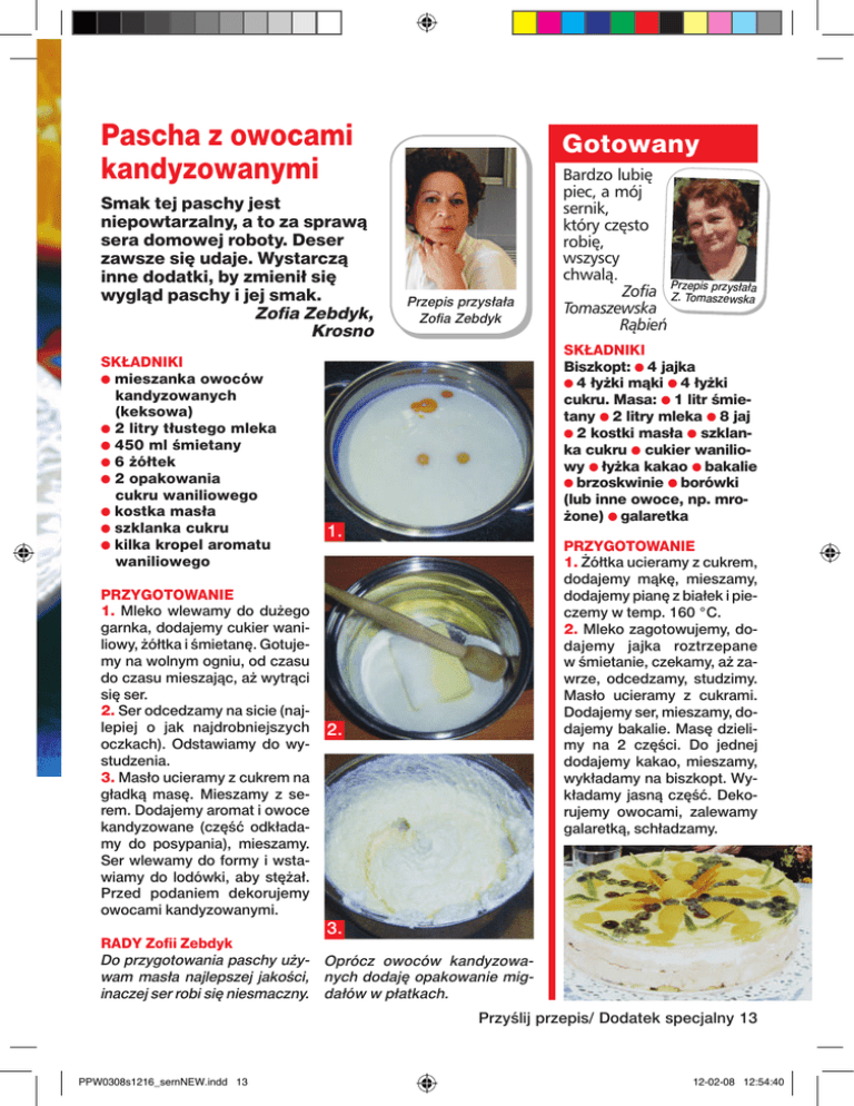 Pascha z owocami kandyzowanymi Smak tej paschy jest niepowtarzalny, a to za sprawą sera domowej roboty. Deser zawsze się udaje. Wystarczą inne dodatki, by zmienił się wygląd paschy i jej smak. Zofia Zebdyk, Krosno SKŁADNIKI ● mieszanka owoców kandyzowanych (keksowa) ● 2 litry tłustego mleka ● 450 ml śmietany ● 6 żółtek ● 2 opakowania cukru waniliowego ● kostka masła ● szklanka cukru ● kilka kropel aromatu waniliowego PRZYGOTOWANIE 1. Mleko wlewamy do dużego garnka, dodajemy cukier waniliowy, żółtka i śmietanę. Gotujemy na wolnym ogniu, od czasu do czasu mieszając, aż wytrąci się ser. 2. Ser odcedzamy na sicie (najlepiej o jak najdrobniejszych oczkach). Odstawiamy do wystudzenia. 3. Masło ucieramy z cukrem na gładką masę. Mieszamy z serem. Dodajemy aromat i owoce kandyzowane (część odkładamy do posypania), mieszamy. Ser wlewamy do formy i wstawiamy do lodówki, aby stężał. Przed podaniem dekorujemy owocami kandyzowanymi. Gotowany Przepis przysłała Zofia Zebdyk Bardzo lubię piec, a mój sernik, który często robię, wszyscy chwalą. is przysłała Zofia Przep Z. Tomaszewska Tomaszewska Rąbień SKŁADNIKI Biszkopt: ● 4 jajka ● 4 łyżki mąki ● 4 łyżki cukru. Masa: ● 1 litr śmietany ● 2 litry mleka ● 8 jaj ● 2 kostki masła ● szklanka cukru ● cukier waniliowy ● łyżka kakao ● bakalie ● brzoskwinie ● borówki (lub inne owoce, np. mrożone) ● galaretka 1. PRZYGOTOWANIE 1. Żółtka ucieramy z cukrem, dodajemy mąkę, mieszamy, dodajemy pianę z białek i pieczemy w temp. 160 °C. 2. Mleko zagotowujemy, dodajemy jajka roztrzepane w śmietanie, czekamy, aż zawrze, odcedzamy, studzimy. Masło ucieramy z cukrami. Dodajemy ser, mieszamy, dodajemy bakalie. Masę dzielimy na 2 części. Do jednej dodajemy kakao, mieszamy, wykładamy na biszkopt. Wykładamy jasną część. Dekorujemy owocami, zalewamy galaretką, schładzamy. 2. 3. RADY Zofii Zebdyk Do przygotowania paschy uży- Oprócz owoców kandyzowawam masła najlepszej jakości, nych dodaję opakowanie miginaczej ser robi się niesmaczny. dałów w płatkach. Przyślij przepis/ Dodatek specjalny 13 PPW0308s1216_sernNEW.indd 13 12-02-08 12:54:40