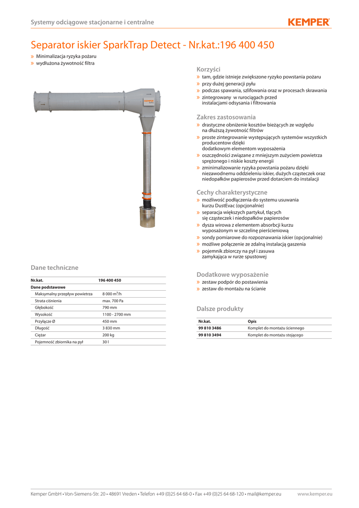Systemy odciągowe stacjonarne i centralne Separator iskier SparkTrap Detect - Nr.kat.:196 400 450 » » Minimalizacja ryzyka pożaru wydłużona żywotność filtra Korzyści » » » » tam, gdzie istnieje zwiększone ryzyko powstania pożaru przy dużej generacji pyłu podczas spawania, szlifowania oraz w procesach skrawania zintegrowany w rurociągach przed instalacjami odsysania i filtrowania Zakres zastosowania » » » » drastyczne obniżenie kosztów bieżących ze względu na dłuższą żywotność filtrów proste zintegrowanie występujących systemów wszystkich producentow dzięki dodatkowym elementom wyposażenia oszczędności związane z mniejszym zużyciem powietrza sprężonego i niskie koszty energii zminimalizowanie ryzyka powstania pożaru dzięki niezawodnemu oddzieleniu iskier, dużych cząsteczek oraz niedopałków papierosów przed dotarciem do instalacji Cechy charakterystyczne » » » » » » możliwość podłączenia do systemu usuwania kurzu DustEvac (opcjonalnie) separacja większych partykuł, tlących się cząsteczek i niedopałków papierosów dysza wirowa z elementem absorbcji kurzu wyposażonym w szczelinę pierścieniową sondy pomiarowe do rozpoznawania iskier (opcjonalnie) możliwe połączenie ze zdalną instalacją gaszenia pojemnik zbiorczy na pył i zasuwa zamykająca w rurze spustowej Dane techniczne Dodatkowe wyposażenie Nr.kat. 196 400 450 Dane podstawowe » » zestaw podpór do postawienia zestaw do montażu na ścianie Maksymalny przepływ powietrza 8 000 m³/h Strata ciśnienia max. 700 Pa Głębokość 790 mm Wysokość 1100 - 2700 mm Przyłącze Ø 450 mm Nr.kat. Opis Długość 3 830 mm 99 810 3486 Komplet do montażu ściennego Ciężar 200 kg 99 810 3494 Komplet do montażu stojącego Pojemność zbiornika na pył 30 l Dalsze produkty Kemper GmbH • Von-Siemens-Str. 20 • 48691 Vreden • Telefon +49 (0)25 64 68-0 • Fax +49 (0)25 64 68-120 • [email protected] www.kemper.eu Systemy odciągowe stacjonarne i centralne TZ_VA_196400450 TZ_SA_196400450 C C Protection mark acc. to DIN ISO 16016 Name Date Terentiew 09.07.2012 gausebec 23.07.2015 Work in progress Designed by: Drawn by: Status: Dane techniczne General tol. EN ISO 2768 - mK Replaces: Replacement date: Model: 196300450.iam Unfold: Item name: SparkTrap Detect NW450 Kemper GmbH Von-Siemens-Str. 20 D-48691 Vreden Tel. +49(0)2564/68-0 Fax +49(0)2564/68-120 www.kemper.eu [email protected] Material : Projection: ISO E Drawing no: Wymiary A 3 830 mm B 450 mm C 790 mm D 1350 - 2840 mm 196300450 D D B A B A Protection mark acc. Tol. to withDINISOISO8015 16016 Yes Name Date Terentiew 09.07.2012 gausebec Weight: Scale: 23.07.2015 Work1:20 in progress352,878 kg Designed by: Drawn by: Status: List/Sheet General tol. EN ISO 2768 - mK Replaces: Replacement date: Model: 196300450.iam Unfold: Item name: Tol. with ISO 8015 Scale: 1:20 Weight: 352,878 kg List/Sheet SparkTrap Detect NW450 1 /1 Kemper GmbH Von-Siemens-Str. 20 D-48691 Vreden Format Tel. +49(0)2564/68-0 Fax +49(0)2564/68-120 www.kemper.eu [email protected] Material : Projection: ISO E Document type: Drawing no: Yes 1 /1 Format A3 196300450 Document type: Strata ciśnienia zalecany zakres użycia Kemper GmbH • Von-Siemens-Str. 20 • 48691 Vreden • Telefon +49 (0)25 64 68-0 • Fax +49 (0)25 64 68-120 • [email protected] www.kemper.eu
