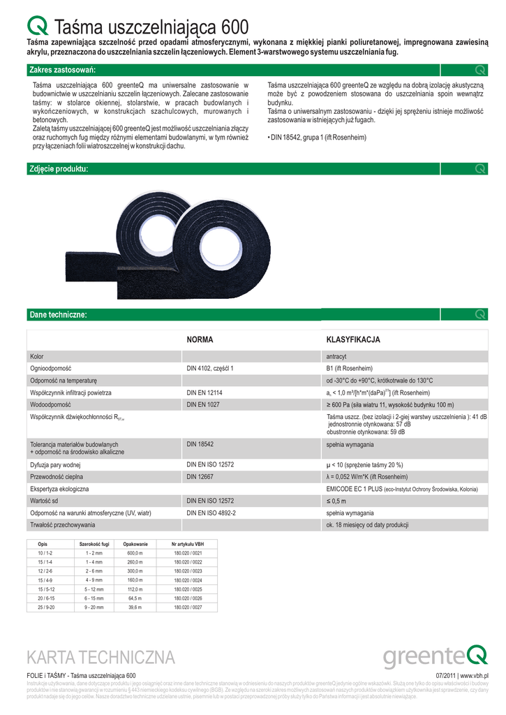 Taœma uszczelniaj¹ca 600 Taœma zapewniaj¹ca szczelnoœæ przed opadami atmosferycznymi, wykonana z miêkkiej pianki poliuretanowej, impregnowana zawiesin¹ akrylu, przeznaczona do uszczelniania szczelin ³¹czeniowych. Element 3-warstwowego systemu uszczelniania fug. Zakres zastosowañ: Taœma uszczelniaj¹ca 600 greenteQ ma uniwersalne zastosowanie w budownictwie w uszczelnianiu szczelin ³¹czeniowych. Zalecane zastosowanie taœmy: w stolarce okiennej, stolarstwie, w pracach budowlanych i wykoñczeniowych, w konstrukcjach szachulcowych, murowanych i betonowych. Zalet¹ taœmy uszczelniaj¹cej 600 greenteQ jest mo¿liwoœæ uszczelniania z³¹czy oraz ruchomych fug miêdzy ró¿nymi elementami budowlanymi, w tym równie¿ przy ³¹czeniach folii wiatroszczelnej w konstrukcji dachu. Taœma uszczelniaj¹ca 600 greenteQ ze wzglêdu na dobr¹ izolacjê akustyczn¹ mo¿e byæ z powodzeniem stosowana do uszczelniania spoin wewn¹trz budynku. Taœma o uniwersalnym zastosowaniu - dziêki jej sprê¿eniu istnieje mo¿liwoœæ zastosowania w istniej¹cych ju¿ fugach. • DIN 18542, grupa 1 (ift Rosenheim) Zdjêcie produktu: Dane techniczne: NORMA Kolor KLASYFIKACJA antracyt Ognioodpornoœæ DIN 4102, czêœæl 1 Odpornoœæ na temperaturê B1 (ift Rosenheim) od -30°C do +90°C, krótkotrwale do 130°C Wspó³czynnik infiltracji powietrza DIN EN 12114 Wodoodpornoœæ DIN EN 1027 Wspó³czynnik dŸwiêkoch³onnoœci RST,ù an < 1,0 m³/[h*m*(daPa)2/3] (ift Rosenheim) Taœma uszcz. (bez izolacji i 2-giej warstwy uszczelnienia ): 41 dB jednostronnie otynkowana: 57 dB obustronnie otynkowana: 59 dB Tolerancja materia³ów budowlanych + odpornoœæ na œrodowisko alkaliczne DIN 18542 spe³nia wymagania Dyfuzja pary wodnej DIN EN ISO 12572 µ < 10 (sprê¿enie taœmy 20 %) Przewodnoœæ cieplna DIN 12667 ë = 0,052 W/m*K (ift Rosenheim) Ekspertyza ekologiczna EMICODE EC 1 PLUS (eco-Instytut Ochrony Œrodowiska, Kolonia) Wartoœæ sd DIN EN ISO 12572 Odpornoœæ na warunki atmosferyczne (UV, wiatr) DIN EN ISO 4892-2 Trwa³oœæ przechowywania ok. 18 miesiêcy od daty produkcji Szerokoœæ fugi Opakowanie Nr artyku³u VBH 10 / 1-2 1 - 2 mm 600,0 m 180.020 / 0021 15 / 1-4 1 - 4 mm 260,0 m 180.020 / 0022 12 / 2-6 2 - 6 mm 300,0 m 180.020 / 0023 15 / 4-9 4 - 9 mm 160,0 m 180.020 / 0024 15 / 5-12 5 - 12 mm 112,0 m 180.020 / 0025 20 / 6-15 6 - 15 mm 64,5 m 180.020 / 0026 25 / 9-20 9 - 20 mm 39,6 m 180.020 / 0027 Opis spe³nia wymagania KARTA TECHNICZNA FOLIE i TAŒMY - Taœma uszczelniaj¹ca 600 07/2011 | www.vbh.pl Instrukcje u¿ytkowania, dane dotycz¹ce produktu i jego osi¹gniêæ oraz inne dane techniczne stanowi¹ w odniesieniu do naszych produktów greenteQ jedynie ogólne wskazówki. S³u¿¹ one tylko do opisu w³aœciwoœci i budowy produktów i nie stanowi¹ gwarancji w rozumieniu § 443 niemieckiego kodeksu cywilnego (BGB). Ze wzglêdu na szeroki zakres mo¿liwych zastosowañ naszych produktów obowi¹zkiem u¿ytkownika jest sprawdzenie, czy dany produkt nadaje siê do jego celów. Nasze doradztwo techniczne udzielane ustnie, pisemnie lub w postaci przeprowadzonej próby s³u¿y tylko do Pañstwa informacji i jest absolutnie niewi¹¿¹ce. Taœma uszczelniaj¹ca 600 Taœma zapewniaj¹ca szczelnoœæ przed opadami atmosferycznymi, wykonana z miêkkiej pianki poliuretanowej, impregnowana zawiesin¹ akrylu, przeznaczona do uszczelniania szczelin ³¹czeniowych. Element 3-warstwowego systemu uszczelniania fug. Przygotowanie: Nale¿y postêpowaæ zgodnie z instrukcj¹ monta¿u do³¹czon¹ do ka¿dego kartonu. Czyszczenie: Skórê umyæ wod¹ z myd³em. Wskazówki dotycz¹ce bezpieczeñstwa: Wed³ug dostêpnych danych i doœwiadczeñ produkt nie jest materia³em niebezpiecznym w rozumieniu ustawy o substancjach chemicznych (niem. Chemikaliengesetz) lub odpowiednich dyrektyw UE. Dodatkowe uwagi: Karty techniczne oraz charakterystyki zgodne z najnowszymi przepisami DIN 18542:2009-07. Forma dostawy: Taœma sprê¿ona: w rolce, jednostronnie klej¹ca, d³ugoœæ rolki: 2 - 12 m, zale¿na od gruboœci materia³u. Dostêpna w szerokoœci od 10 mm. Usuwanie odpadów: Pozosta³oœci taœmy mo¿na utylizowaæ z odpadami domowymi, zgodnie z lokalnymi przepisami. Ogólne wskazówki: Wszystkie wczeœniejsze wydania niniejszego arkusza danych trac¹ niniejszym wa¿noœæ. FOLIE i TAŒMY - Taœma uszczelniaj¹ca 600 | 07/2011 | www.vbh.pl Instrukcje u¿ytkowania, dane dotycz¹ce produktu i jego osi¹gniêæ oraz inne dane techniczne stanowi¹ w odniesieniu do naszych produktów greenteQ jedynie ogólne wskazówki. S³u¿¹ one tylko do opisu w³aœciwoœci i budowy produktów i nie stanowi¹ gwarancji w rozumieniu § 443 niemieckiego kodeksu cywilnego (BGB). Ze wzglêdu na szeroki zakres mo¿liwych zastosowañ naszych produktów obowi¹zkiem u¿ytkownika jest sprawdzenie, czy dany produkt nadaje siê do jego celów. Nasze doradztwo techniczne udzielane ustnie, pisemnie lub w postaci przeprowadzonej próby s³u¿y tylko do Pañstwa informacji i jest absolutnie niewi¹¿¹ce.