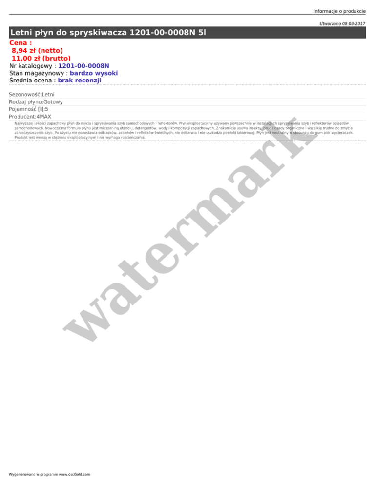 Informacje o produkcie Utworzono 08-03-2017 Letni płyn do spryskiwacza 1201-00-0008N 5l Cena : 8,94 zł (netto) 11,00 zł (brutto) Nr katalogowy : 1201-00-0008N Stan magazynowy : bardzo wysoki Średnia ocena : brak recenzji Sezonowość:Letni Rodzaj płynu:Gotowy Pojemność [l]:5 Producent:4MAX w at er m ar k Najwyższej jakości zapachowy płyn do mycia i spryskiwania szyb samochodowych i reflektorów. Płyn eksploatacyjny używany powszechnie w instalacjach spryskiwania szyb i reflektorów pojazdów samochodowych. Nowoczesna formuła płynu jest mieszaniną etanolu, detergentów, wody i kompozycji zapachowych. Znakomicie usuwa insekty, brud i osady organiczne i wszelkie trudne do zmycia zanieczyszczenia szyb. Po użyciu nie pozostawia odblasków, zacieków i refleksów świetlnych, nie odbarwia i nie uszkadza powłoki lakierowej. Płyn jest neutralny w stosunku do gum piór wycieraczek. Produkt jest wersją w stężeniu eksploatacyjnym i nie wymaga rozcieńczania. Wygenerowano w programie www.oscGold.com