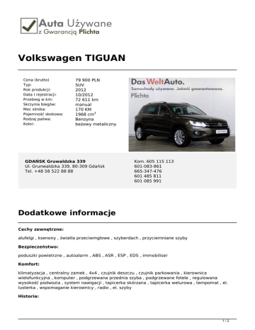 Volkswagen TIGUAN Cena (brutto) Typ: Rok produkcji: Data I rejestracji: Przebieg w km: Skrzynia biegów: Moc silnika: Pojemność skokowa: Rodzaj paliwa: Kolor: 79 900 PLN SUV 2012 10/2012 72 611 km manual 170 KM 1968 cm3 Benzyna beżowy metaliczny GDAŃSK Gruwaldzka 339 Ul. Grunwaldzka 339, 80-309 Gdańsk Tel. +48 58 522 88 88 Kom. 605 115 113 601-083-861 665-347-476 601 485 811 601 085 991 Dodatkowe informacje Cechy zewnętrzne: alufelgi , ksenony , światła przeciwmgłowe , szyberdach , przyciemniane szyby Bezpieczeństwo: poduszki powietrzne , autoalarm , ABS , ASR , ESP , EDS , immobiliser Komfort: klimatyzacja , centralny zamek , 4x4 , czujnik deszczu , czujnik parkowania , kierownica wielofunkcyjna , komputer , podgrzewana przednia szyba , podgrzewane fotele , regulowana wysokość podwozia , system nawigacji , tapicerka skórzana , tapicerka welurowa , tempomat , el. lusterka , wspomaganie kierownicy , radio , el. szyby Historia: 1/2 pierwszy właściciel , bezwypadkowy , serwisowany w ASO , garażowany Gwarancja Szanowni Państwo, Pragniemy Państwa poinformować, iż firma Plichta – Autoryzowany Dealer Škoda Auto prowadzi skup oraz sprzedaż samochodów używanych wszystkich marek, oferując także samochody używane z gwarancją objęte programem „Auta używane z Gwarancją Plichta”. W ramach programu „Auta Używane z Gwarancją Plichta ” każdy Klient otrzymuje atrakcyjny pakiet zniżek pozwalający zoptymalizować koszty eksploatacji samochodu: -50% na serwis klimatyzacji -50% na ustawienie zbieżności -50% na kosmetykę auta -50% na ścieżkę diagnostyczną -25% na wymiany oleju -25% na zakup opon + 5zł na sezon za hotelowanie opon -15% na części i akcesoria Oferujemy również kompleksową obsługę w zakresie finansowania i ubezpieczenia: - kredyty już od 4,99% - leasingi i kredyty bez zaświadczeń - uproszczone procedury – decyzja już od 30 min. - atrakcyjne pakiety AC/OC/NW/ASS wiodących firm ubezpieczeniowych Możliwość pozostawienia dotychczas użytkowanego auta w rozliczeniu – BEZPŁATNA WYCENA!!! Zapraszamy wszystkich Klientów na jazdę próbną wybranym autem. Numer oferty: C989 Informacja nie stanowi oferty w rozumieniu art. 66 KC. Podane dane mają charakter wyłącznie informacyjny. 2/2 Powered by TCPDF (www.tcpdf.org)