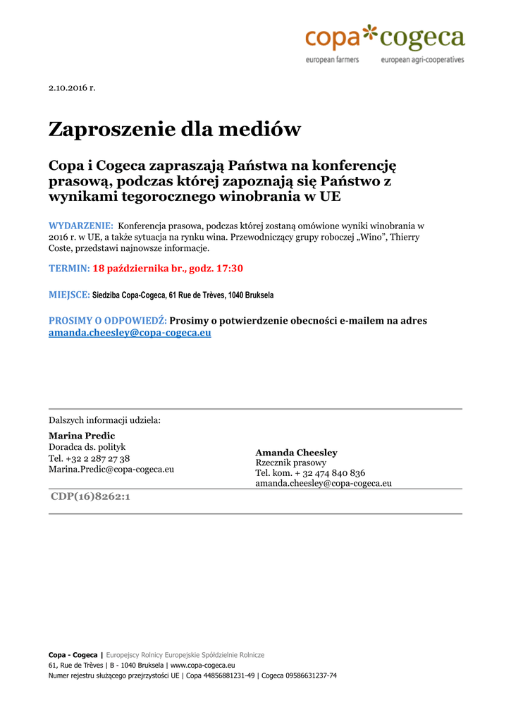 2.10.2016 r. Zaproszenie dla mediów Copa i Cogeca zapraszają Państwa na konferencję prasową, podczas której zapoznają się Państwo z wynikami tegorocznego winobrania w UE WYDARZENIE: Konferencja prasowa, podczas której zostaną omówione wyniki winobrania w 2016 r. w UE, a także sytuacja na rynku wina. Przewodniczący grupy roboczej „Wino”, Thierry Coste, przedstawi najnowsze informacje. TERMIN: 18 października br., godz. 17:30 MIEJSCE: Siedziba Copa-Cogeca, 61 Rue de Trèves, 1040 Bruksela PROSIMY O ODPOWIEDŹ: Prosimy o potwierdzenie obecności e-mailem na adres amanda.cheesley@copa‐cogeca.eu Dalszych informacji udziela: Marina Predic Doradca ds. polityk Tel. +32 2 287 27 38 [email protected] Amanda Cheesley Rzecznik prasowy Tel. kom. + 32 474 840 836 [email protected] CDP(16)8262:1 Copa - Cogeca | Europejscy Rolnicy Europejskie Spółdzielnie Rolnicze 61, Rue de Trèves | B - 1040 Bruksela | www.copa-cogeca.eu Numer rejestru służącego przejrzystości UE | Copa 44856881231-49 | Cogeca 09586631237-74