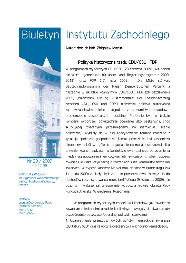 Autor: doc. dr hab. Zbigniew Mazur Polityka historyczna rządu CDU/CSU i FDP W programach wyborczych CDU/CSU (28 czerwca 2009: „Wir haben die Kraft ‟ gemeinsam für unser Land. Regierungsprogramm 20092013“) oraz FDP (17 Deutschlandprogramm maja der 2009: Freien „Die Mitte Demokratischen stärken. Partei”), a następnie w układzie koalicyjnym CDU/CSU i FDP (26 października 2009, „Wachstum. Bildung. Zusammenhalt. Der Koalitionsvertrag zwischen CDU, CSU und FDP”) niemiecka polityka historyczna zajmowała niewiele miejsca, ustępując - ze zrozumiałych powodów problematyce gospodarczej i socjalnej. Podobnie było w trakcie kampanii wyborczej, powszechnie ocenianej jako bezbarwna, choć skutkującej znacznymi przesunięciami na niemieckiej scenie politycznej. Wybijały się w niej zdecydowanie tematy związane z sytuacją społeczno-gospodarczą. Temat przeszłości był zasadniczo nieobecny, a jeśli w ogóle, to pojawiał się na marginesie spekulacji o przyszłej koalicji rządzącej, w kontekście ewentualnego porozumienia między ugrupowaniami lewicowymi lub lewicującymi, obejmującego Nr 29 / 2009 09„12„09 INSTYTUT ZACHODNI im. Zygmunta Wojciechowskiego Instytut Naukowo-Badawczy, Poznań również Die Linke, czyli partię o korzeniach silnie komunistycznych lub lewackich. W exposé kanclerz Merkel oraz debacie w Bundestagu (10 listopada 2009) znalazły się liczne, ale powierzchowne nawiązania do obchodów rocznicy otwarcia muru berlińskiego (9 listopada 2009), ale poza tym większe zainteresowanie wzbudziła jedynie obsada Rady Fundacji Ucieczka, Wypędzenie, Pojednanie. Redakcja: Joanna Dobrowolska-Polak (redaktor naczelny), Marta Götz, Piotr Cichocki W programach wyborczych chadeków i liberałów, jak również w zawartym między nimi układzie koalicyjnym, wybijały się dwa tematy bezpośrednio dotyczące federalnej polityki historycznej: 1. Upamiętnienie przeszłości dwóch państw niemieckich, zwłaszcza „dyktatury SED” oraz rewolty społeczeństwa wschodnioniemieckiego, 2. Upamiętnienie „ofiar” niemieckich, czyli przede wszystkim „wypędzenia” ludności niemieckiej ze wschodu. „Antytotalitarny konsens” Partie koalicji chadecko-liberalnej zapowiedziały kontynuowanie polityki historycznej opracowanej przez koalicję chadecko- socjaldemokratyczną i wyłożonej w dokumencie zaakceptowanym przez poprzedni Aufarbeitung Bundestag verstärken, („Verantwortung Gedenken vertiefen”). wahrnehmen, Ten obszerny materiał, przygotowany w Urzędzie Pełnomocnika ds. Kultury i Mediów (Bernd Neumann, CDU), wnikliwie przedyskutowany w komisjach parlamentarnych, kilkakrotnie poprawiany i uzupełniany, obejmował komemorację nieprawości zarówno nazizmu, jak i komunizmu. W programie chadeckim uwzględniono obydwa kierunki upamiętniania. Najpierw podniesiono pielęgnowanie pamięci o „narodowym socjalizmie i jego straszliwych zbrodniach”, które pociągnęły za sobą śmierć milionów ludzi i rozliczne cierpienia, zwłaszcza „wymordowanie sześciu milionów Żydów w Europie”, i zaraz po tym zapowiedziano wprowadzenie „historii niemieckiego podziału i dyktatury SED” do nauczania szkolnego w całych Niemczech. W programie wyborczym FDP uczyniono podobnie, najpierw akcentując zachowanie pamięci o „zbrodniach narodowego socjalizmu“ i następnie, w tym samym akapicie, stwierdzając: „Wspominanie zamordowanych przeciwników reżimu komunistycznego musi być włączone do politycznego kształcenia [Politische Bildung]. Autentyczne miejsca bezprawia SED muszą być udostępnione i utrzymane”. Chadecy i liberałowie wychodzą z „antytotalitarnego konsensu” jako podstawy demokratycznej tożsamości narodu i państwa niemieckiego, co w praktyce narzuca krytyczne podejście do przeszłości zarówno nazistowskiej, jak i enerdowskiej. Obydwie partie mocno obstają przy teorii totalitaryzmu, w mniejszym lub większym stopniu zrównującej obydwie „dyktatury”, co przez środowiska lewicowe odbierane jest z podejrzliwością jako próba relatywizowania zbrodniczej polityki Trzeciej Rzeszy i pośrednio również próba Biuletyn Instytutu Zachodniego • www.iz.poznan.pl 2 osłabienia pozycji lewicy w niemieckim życiu politycznym. W związku z pewną drażliwością określenia „konsens antytotalitarny” nie pojawiło się ono w programach wyborczych liberałów i chadeków, nie wystąpiło także w układzie koalicyjnym, a tym bardziej w exposé kanclerz Merkel (10 listopada 2009). Nie powoływano się na nie również w debacie parlamentarnej po exposé rządowym. Ale nie oznacza to, że koncepcja ta została zarzucona i przestała funkcjonować w sensie merytorycznym. Liberałowie i chadecy chętnie posługują się nią m.in. jako ideologiczną bronią w zwalczaniu wpływów lewicowych, z góry dyskredytując wszelkie pomysły jakiekolwiek porozumienia między SPD a Die Linke. W układzie koalicyjnym krótko i zwięźle obiecano kontynuowanie dotychczasowego upamiętniania obu dyktatur, nazistowskiej i komunistycznej: „Przepracowanie terroru nazistowskiego i dyktatury SED będzie kontynuowane i wzmocnione zgodnie z federalną koncepcją miejsc pamięci”. Stwierdzenie to można uznać za merytorycznie wystarczające, ponieważ we wspomnianej federalnej koncepcji upamiętniania wyłożono dokładnie i szczegółowo założenia niemieckiej polityki historycznej. Tym niemniej lakoniczność cytowanego sformułowania może trochę zastanawiać. W każdym razie nie poświęcono więcej uwagi pamięci o zbrodniach hitlerowskich i nie wspomniano nawet o mordzie na ludności żydowskiej, co w enuncjacjach na temat przeszłości należy zazwyczaj do codziennego rytuału. Natomiast osobny nacisk położono na „dyktaturę SED”, podkreślając, że jej „przepracowanie” stanowi „społeczno-polityczne wyzwanie o nadal wielkim znaczeniu”.(„Um der Verklärung der SEDDiktatur entgegenzuwirken, Maßnahmen zur wird geschich