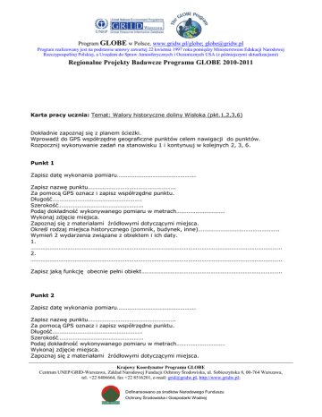 Program GLOBE w Polsce, www.gridw.pl/globe; [email protected] Program realizowany jest na podstawie umowy zawartej 22 kwietnia 1997 roku pomiędzy Ministerstwem Edukacji Narodowej Rzeczypospolitej Polskiej, a Urzędem do Spraw Atmosferycznych i Oceanicznych USA (z późniejszymi aktualizacjami) Regionalne Projekty Badawcze Programu GLOBE 2010-2011 Karta pracy ucznia: Temat: Walory historyczne doliny Wisłoka (pkt.1,2,3,6) Dokładnie zapoznaj się z planem ścieżki. Wprowadź do GPS współrzędne geograficzne punktów celem nawigacji do punktów. Rozpocznij wykonywanie zadań na stanowisku 1 i kontynuuj w kolejnych 2, 3, 6. Punkt 1 Zapisz datę wykonania pomiaru…………………………………………….. Zapisz nazwę punktu………………………………………………….. Za pomocą GPS oznacz i zapisz współrzędne punktu. Długość……………………………………………………. Szerokość………………………….…………………….. Podaj dokładność wykonywanego pomiaru w metrach…………………………… Wykonaj zdjęcie miejsca. Zapoznaj się z materiałami źródłowymi dotyczącymi miejsca. Określ rodzaj miejsca historycznego (pomnik, budynek, inne)………………………………………………. Wymień 2 wydarzenia związane z obiektem i ich daty. 1. …………………………………………………………………………………………………………………………………………………….. 2. …………………………………………………………………………………………………………………………………………………….. Zapisz jaką funkcję obecnie pełni obiekt………………………………………………………………………………….. Punkt 2 Zapisz datę wykonania pomiaru…………………………………………….. Zapisz nazwę punktu………………………………………………….. Za pomocą GPS oznacz i zapisz współrzędne punktu. Długość……………………………………………………. Szerokość………………………….…………………….. Podaj dokładność wykonywanego pomiaru w metrach…………………………… Wykonaj zdjęcie miejsca. Zapoznaj się z materiałami źródłowymi dotyczącymi miejsca. Krajowy Koordynator Programu GLOBE Centrum UNEP/GRID-Warszawa, Zakład Narodowej Fundacji Ochrony Środowiska, ul. Sobieszyńska 8, 00-764 Warszawa, tel. +22 8406664, fax +22 8516201, e-mail: [email protected], http://www.gridw.pl; Dofinansowano ze środków Narodowego Funduszu Ochrony Środowiska i Gospodarki Wodnej Program GLOBE w Polsce, www.gridw.pl/globe; [email protected] Program realizowany jest na podstawie umowy zawartej 22 kwietnia 1997 roku pomiędzy Ministerstwem Edukacji Narodowej Rzeczypospolitej Polskiej, a Urzędem do Spraw Atmosferycznych i Oceanicznych USA (z późniejszymi aktualizacjami) Regionalne Projekty Badawcze Programu GLOBE 2010-2011 Określ rodzaj miejsca historycznego (pomnik, budynek, inne)………………………………………………. Wymień 2 wydarzenia związane z obiektem i ich daty. 1. …………………………………………………………………………………………………………………………………………………….. 2. …………………………………………………………………………………………………………………………………………………….. Zapisz jaką funkcję obecnie pełni obiekt………………………………………………………………………………….. Punkt 3 Zapisz datę wykonania pomiaru…………………………………………….. Zapisz nazwę punktu………………………………………………….. Za pomocą GPS oznacz i zapisz współrzędne punktu. Długość……………………………………………………. Szerokość………………………….…………………….. Podaj dokładność wykonywanego pomiaru w metrach…………………………… Wykonaj zdjęcie miejsca. Zapoznaj się z materiałami źródłowymi dotyczącymi miejsca. Określ rodzaj miejsca historycznego (pomnik, budynek, inne)………………………………………………. Wymień 2 wydarzenia związane z obiektem i ich daty. 1. …………………………………………………………………………………………………………………………………………………….. 2. …………………………………………………………………………………………………………………………………………………….. Zapisz jaką funkcję obecnie pełni obiekt………………………………………………………………………………….. Punkt 6 Zapisz datę wykonania pomiaru…………………………………………….. Zapisz nazwę punktu………………………………………………….. Za pomocą GPS oznacz i zapisz współrzędne punktu. Długość……………………………………………………. Szerokość………………………….…………………….. Podaj dokładność wykonywanego pomiaru w metrach…………………………… Wykonaj zdjęcie miejsca. Zapoznaj się z materiałami źródłowymi dotyczącymi miejsca. Określ rodzaj miejsca historycznego (pomnik, budynek, inne)………………………………………………. Wymień 2 wydarzenia związane z obiektem i ich daty. 1. …………………………………………………………………………………………………………………………………………………….. 2. …………………………………………………………………………………………………………………………………………………….. Krajowy Koordynator Programu GLOBE Centru