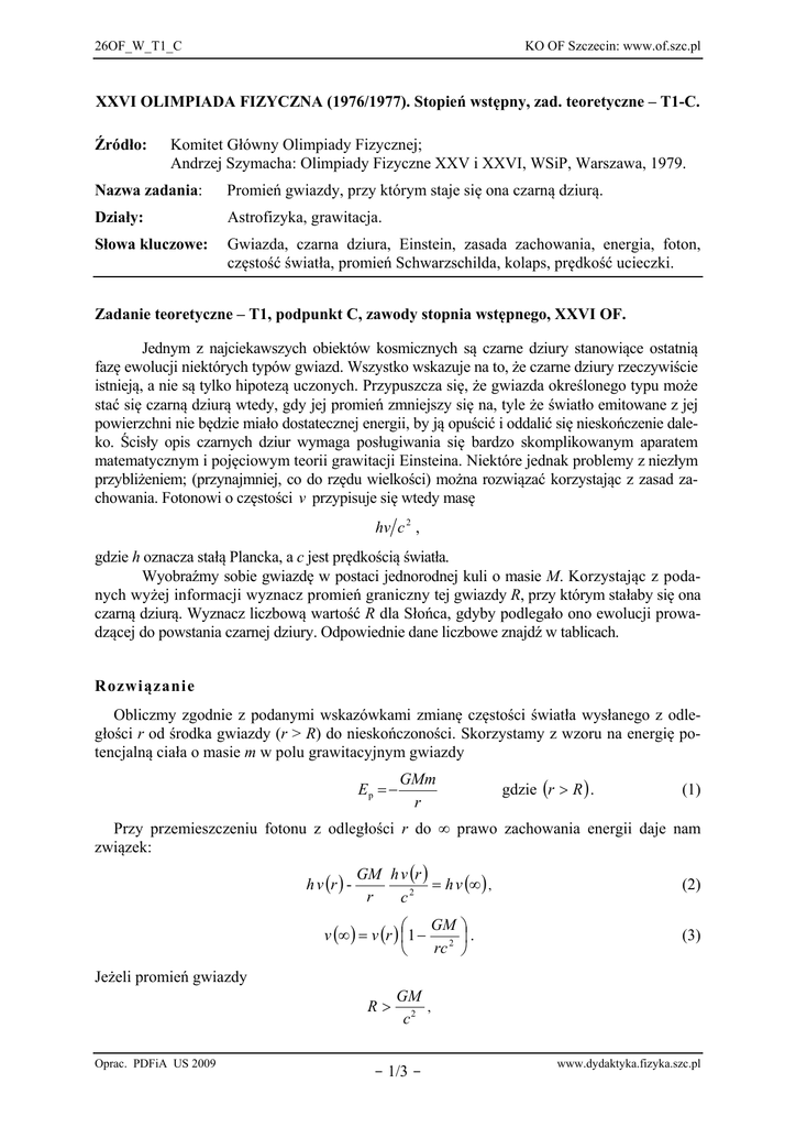 26OF_W_T1_C KO OF Szczecin: www.of.szc.pl XXVI OLIMPIADA FIZYCZNA (1976/1977). Stopień wstępny, zad. teoretyczne – T1-C. Źródło: Komitet Główny Olimpiady Fizycznej; Andrzej Szymacha: Olimpiady Fizyczne XXV i XXVI, WSiP, Warszawa, 1979. Nazwa zadania: Promień gwiazdy, przy którym staje się ona czarną dziurą. Działy: Astrofizyka, grawitacja. Słowa kluczowe: Gwiazda, czarna dziura, Einstein, zasada zachowania, energia, foton, częstość światła, promień Schwarzschilda, kolaps, prędkość ucieczki. Zadanie teoretyczne – T1, podpunkt C, zawody stopnia wstępnego, XXVI OF. Jednym z najciekawszych obiektów kosmicznych są czarne dziury stanowiące ostatnią fazę ewolucji niektórych typów gwiazd. Wszystko wskazuje na to, że czarne dziury rzeczywiście istnieją, a nie są tylko hipotezą uczonych. Przypuszcza się, że gwiazda określonego typu może stać się czarną dziurą wtedy, gdy jej promień zmniejszy się na, tyle że światło emitowane z jej powierzchni nie będzie miało dostatecznej energii, by ją opuścić i oddalić się nieskończenie daleko. Ścisły opis czarnych dziur wymaga posługiwania się bardzo skomplikowanym aparatem matematycznym i pojęciowym teorii grawitacji Einsteina. Niektóre jednak problemy z niezłym przybliżeniem; (przynajmniej, co do rzędu wielkości) można rozwiązać korzystając z zasad zachowania. Fotonowi o częstości v przypisuje się wtedy masę hv c 2 , gdzie h oznacza stałą Plancka, a c jest prędkością światła. Wyobraźmy sobie gwiazdę w postaci jednorodnej kuli o masie M. Korzystając z podanych wyżej informacji wyznacz promień graniczny tej gwiazdy R, przy którym stałaby się ona czarną dziurą. Wyznacz liczbową wartość R dla Słońca, gdyby podlegało ono ewolucji prowadzącej do powstania czarnej dziury. Odpowiednie dane liczbowe znajdź w tablicach. Rozwiązanie Obliczmy zgodnie z podanymi wskazówkami zmianę częstości światła wysłanego z odległości r od środka gwiazdy (r > R) do nieskończoności. Skorzystamy z wzoru na energię potencjalną ciała o masie m w polu grawitacyjnym gwiazdy Ep = − GMm r gdzie (r > R ) . (1) Przy przemieszczeniu fotonu z odległości r do ∞ prawo zachowania energii daje nam związek: h v (r ) - GM h v (r ) = h v (∞ ) , r c2 ⎛ GM ⎞ v (∞ ) = v (r ) ⎜1 − 2 ⎟ . rc ⎠ ⎝ (2) (3) Jeżeli promień gwiazdy R> Oprac. PDFiA US 2009 GM , c2 - 1/3 - www.dydaktyka.fizyka.szc.pl 26OF_W_T1_C KO OF Szczecin: www.of.szc.pl to foton wysłany nawet z samej powierzchni osiągnie nieskończoność z jakąś częścią ν (∞) > 0. Jeżeli GM R< 2 , c to dla promienia wysłanego z odległości początkowej R≤r< GM , c2 wzór (3) traci sens (częstość nie może być ujemna) – foton „spadnie” z powrotem na gwiazdę, tak jak piłka wyrzucona do góry ręką dziecka. Ostatecznie warunkiem na czarną dziurę jest nierówność R≤ GM . c2 (4) Podobny warunek otrzymujemy, że znacznie prostszych rozważań. Nad problemem tym zastanawiał się już Laplace. Stosując mianowicie prawo zachowania energii do ciała o stałej masie łatwo otrzymamy wzór na II prędkość kosmiczną, zwaną inaczej prędkością ucieczki z danego ciała niebieskiego mυ ∞2 mυ 2 GMm = = , 2 2 R υ ∞2 =υ 2 − 2GM . R (5) Warunkiem ucieczki jest oczywiście żądanie, by υ∞2 > 0 . (W przeciwnym wypadku ciało zatrzyma się w skończonej odległości od "centrum" siły i zacznie spadać): υ2 − υ> 2GM ≥ 0, R 2GM =υ II . R (6) Najniższa możliwa prędkość, jaką należy ciału nadać na powierzchni gwiazdy, by uleciało ono do nieskończoności, to właśnie owa druga prędkość kosmiczna. Jeżeli druga prędkość kosmiczna jest większa od prędkości światła, to gdyby światło składało się ze zwykłych cząstek podlegających prawom mechaniki klasycznej, nie mogłoby ono opuścić jej powierzchni. Gwiazda, nawet bardzo gorąca obserwowana z dużej odległości byłaby czarna. Warunkiem na istnienie czarnej dziury, jaki otrzymuje się w ten sposób, jest 2GM > c, R (7) czyli R≤ 2GM . c2 (8) Dostajemy wynik podobny do nierówności (4), ale z dodatkowym czynnikiem 2. Wynika to stąd, że oba przytoczone rozumowania są bardzo przybliżone korzystamy, bowiem w nich z klasycznych wyobrażeń, iż pole grawitacyjne może być poprawnie opisane z pomocą pojęOprac. PDFiA US 2009 - 2/3 - www.dydaktyka.fizyka.szc.pl 26OF_W_T1_C KO OF Szczecin: www.of.szc.pl cia potencjału nawet, jeśli jego natężenie jest bardzo duże. W rzeczywistości w teorii grawitacji Einsteina pojęcie potencjału w ogóle nie występuje. Pole grawitacyjne jest tam przypisane krzywiźnie czasoprzestrzeni, jednak i tam gęstość materii odpowiadająca upakowaniu masy M wewnątrz kuli o promieniu danym wzorem (8) prowadzi do tak dużej krzywizny, że zmieniają się zasadniczo topologiczne własności czasoprzestrzeni. Dzieli się ona na dwie części, przy czym cząstka materii, która znalazła się „we wnętrzu" − nawet światło − nie może żadną miarą wydostać się „na zewnątrz". Do obliczeń wartości numerycznej wynikającej z wzoru (4) najwygodniej jest wyrazić iloczyn GM przez charakterystyki orbity Ziemi (w przybliżeniu orbity kołowej) m Zυ 2 GMm = 2 , rZ rZ (9) stąd ⎛ 2π rZ GM =υ rZ = ⎜⎜ ⎝ T 2 2 ⎞ 4π 2 rZ3 ⎟⎟ rZ = , 2 T ⎠ gdzie rz – odległość Ziemi od Słońca = 150000000 km, T = 1 rok. Ostatecznie 4π 2 rZ3 R≤ 2 2 . T c Czas 1 roku wyrażony w sekundach wynosi w przybliżeniu π ּ◌107 sekund, stąd ( ) 3 4⋅ 15⋅10 7 Rgr = 14 km = 1,5 km . 10 ⋅9⋅1010 Słońce stałoby się, zatem czarną dziurą, gdyby zostało ściśnięte do objętości kuli o fantastycznie małym (jak na warunki astronomiczne) promieniu 1,5 km. Ponieważ faktyczny promień słońca wynosi ~700000 km, jego gęstość przy takim ściskaniu musiałaby wzrosnąć około 1017 razy! Zauważmy, że w normalnych warunkach na Ziemi (a średnia gęstość mat