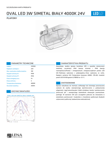 SZCZEGÓŁOWA KARTA PRODUKTU OVAL LED 3W SIMETAL BIAŁY 4000K 24V PLAFONY PARAMETRY TECHNICZNE CHARAKTERYSTYKA PRODUKTU indeks : 233302 Natynkowa, owalna oprawa kanałowa LED o wysokiej skuteczności Napięcie zasilajace : 24V świetlnej, Moc nominalna źródła światła : 3W nastropowa/sufitowa) i zintegrowanym, energooszczędnym panelu LED Stopień ochrony IK : IK06 GO!. Podstawa wykonana z polipropylenu. Klosz wykonany ze szkła. Stopień ochrony IP : IP44 Klasa energetyczna : A+ Klasa ochrony : II Temperatura barwowa : 4000K Strumień świetlny : 250lm szczelności IP44 (wersja ścienna) i IP40 (wersja Napięcie zasilania 24V. Temperatura barwowa 4000K, CRI>80, trwałość paneli LED 50 000 godzin (L70B50) ta= 25 ºC. ZASTOSOWANIE Oprawa natynkowa do montażu sufitowego lub ściennego przeznaczona zarówno do użytku wewnętrznego (pomieszczenia o podwyższonej KRZYWE ŚWIATŁOŚCI OVAL LED 3W SIMETAL BIAŁY 4000K 24V wilgotności, ciągi komunikacyjne i klatki schodowe, kanały i pomieszczenia piwniczne) jak i zewnętrznego (oświetlenie elewacyjne przemysłowe, parkingi). W wariancie 24V jest szczególnie polecana do stosowania w oświetlaniu pomieszczeń i budynków o charakterze publicznym (budynki użyteczności publicznej, budownictwo wielorodzinne). SZCZEGÓŁOWA KARTA PRODUKTU OVAL LED 3W SIMETAL BIAŁY 4000K 24V PLAFONY TABELA PARAMETRÓW TECHNICZNYCH indeks: 233302 Napięcie zasilajace: 24V Moc nominalna źródła światła: 3W Stopień ochrony IK: IK06 Stopień ochrony IP: IP44 Skuteczność świetlna: 83lm/W Klasa energetyczna: A+ Klasa ochrony: II Wymiary: 125/170/105mm Waga: 0,43kg Materiał korpusu: PP Temperatura barwowa: 4000K Kolor: Biały Strumień świetlny: 250lm Moc znamionowa oprawy: 3W Kod EAN: 5905963OVAL L Materiał klosza: Szkło Rodzaj klosza: PRM Źródło światła: LED GO! Kolor światła: Biały Data aktualizacji karty: 2016-05-23 30/2012 www.lenalighting.pl | Strona 2