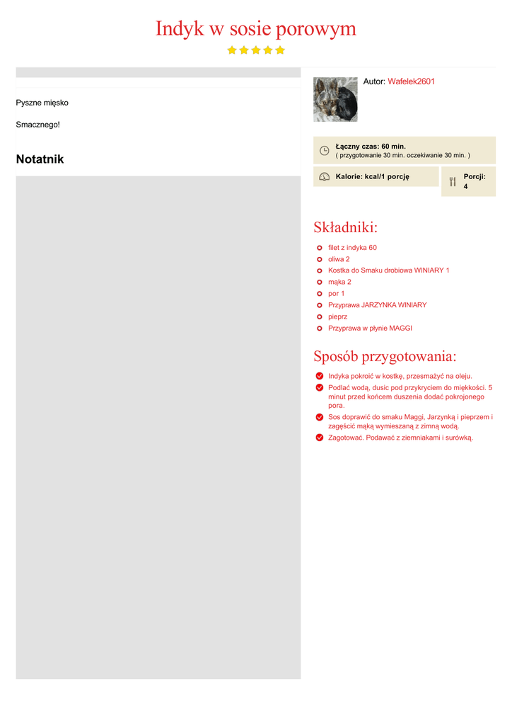 Indyk w sosie porowym Autor: Wafelek2601 Pyszne mięsko Smacznego! Łączny czas: 60 min. Notatnik ( przygotowanie 30 min. oczekiwanie 30 min. ) Kalorie: kcal/1 porcję Porcji: 4 Składniki: filet z indyka 60 oliwa 2 Kostka do Smaku drobiowa WINIARY 1 mąka 2 por 1 Przyprawa JARZYNKA WINIARY pieprz Przyprawa w płynie MAGGI Sposób przygotowania: Indyka pokroić w kostkę, przesmażyć na oleju. Podlać wodą, dusic pod przykryciem do miękkości. 5 minut przed końcem duszenia dodać pokrojonego pora. Sos doprawić do smaku Maggi, Jarzynką i pieprzem i zagęścić mąką wymieszaną z zimną wodą. Zagotować. Podawać z ziemniakami i surówką.