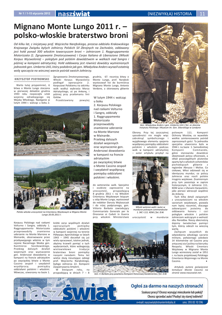 Nr 1 / 1-15 stycznia 2012 naszświat NIEZWYKŁA HISTORIA 11 Mignano Monte Lungo 2011 r. – polsko-włoskie braterstwo broni Od kilku lat, z inicjatywy prof. Wojciecha Narębskiego, prezesa oddziału Krakowskiego Krajowego Związku byłych żołnierzy Polskich Sił Zbrojnych na Zachodzie, oddawany jest hołd ponad 300 włoskim towarzyszom broni – żołnierzom 1. Raggruppamento Motorizzato (1. Zgrupowanie Zmotoryzowane) i Corpo Italiano di Liberazione (Włoski Korpus Wyzwolenia) – poległym pod polskim dowództwem w walkach nad Sangro i później w kampanii adriatyckiej. Hołd oddawany jest również dowódcy wymienionych jednostek gen. Umberto Utili, który podobnie jak gen. Władysław Anders wyraził ostatnią wolę spoczęcia na wiecznej warcie pośród swoich żołnierzy. krzysztof piotrowski Warto tutaj przypomnieć, iż bitwa o Monte Lungo stoczona w pierwszej dekadzie grudnia 1943 roku rozpoczęła szlak wojenny odradzającego się Wojska Włoskiego. Następnie w lutym 1944 r. walcząc u boku 2. Zgrupowania Zmotoryzowanego, Włoski Korpus Wyzwolenia podlegał operacyjnie 2. Korpusowi Polskiemu na odcinku walk wzdłuż wybrzeża Morza Adriatyckiego, aż po Ankonę, i później przy przełamaniu linii Gotów. Przedstawiony powyżej Polsko-włoska uroczystość na Cmentarzu Wojskowym w Migano Monte Lungo 20.05.2011 r. Korpusu Polskiego nad rzekami Volturno i Sangro, oddziały 1. Raggruppamento Motorizzato przeprowadziły znamienne uderzenie na Monte Marrone w Mainarde, obserwowane przez przebywającego właśnie w tym rejonie Naczelnego Wodza gen. Kazimierza Sosnkowskiego. Przebieg dalszych działań wojennych oraz wyznaczenie gen. Andersowi dowodzenia w kampanii na froncie adriatyckim po zwycięskiej bitwie o Monte Cassino zespoił i uwydatnił współpracę pomi ędzy oddziałami polskimi i włoskimi. Wówczas, utworzony na bazie 1. krótki zarys wspólnych działań operacyjnych pomiędzy oddziałami polskimi i włoskimi w kampanii wojennej na terenie Półwyspu Apenińskiego w latach 1943 – 1945 doczekał się już wielu opracowań, istotne jednak, abyśmy krzewili pamięć o tych wydarzeniach, które wzbogacają wielowiekowe tradycje braterstwa broni pomiędzy naszymi narodami. Temu też wielce służą nieustające zabiegi prof. Wojciecha Narębskiego, byłego żołnierza 22. Kompanii Zaopatrywania Artylerii. W bieżącym roku, na przypadającą w dniach 7 – 8 grudnia, 67. rocznicę bitwy o Monte Lungo, prof. Narębski wystosował list do burmistrza Mignano Monte Lungo, Antonio Verdone, a skierowany głównie W lutym 1944 r. walcząc u boku 2. Korpusu Polskiego nad rzekami Volturno i Sangro, oddziały 1. Raggruppamento Motorizzato przeprowadziły znamienne uderzenie na Monte Marrone w Mainarde. Przebieg dalszych działań wojennych oraz wyznaczenie gen. Andersowi dowodzenia w kampanii na froncie adriatyckim po zwycięskiej bitwie o Monte Cassino zespoił i uwydatnił współpracę pomiędzy oddziałami polskimi i włoskimi. do weteranów walk. Specjalne i osobiste zaproszenie na uroczystość, przypadającą 8 grudnia 2011 r. na Włoskim Cmentarzu Wojskowym leżącym u stóp Monte Lungo, wystosował do redaktor Danuty Wojtaszczyk i do niżej podpisanego, gen. Vittorio Barbato zawiadujący Commisariato Generale per le Onoranze ai Caduti in Guerra przy włoskim Ministerstwie Gen. Władysław Anders i gen. Umberto Utili / fot. ze zbiorów Instytutu Polskiego i Muzeum im. Gen. Sikorskiego w Londynie Obrony. Przy tej zaszczytnej sposobności nie mogło więc zabraknąć symbolicznego i wyjątkowego elementu spojenia współpracy pomiędzy oddziałami polskimi i włoskimi podczas walk w kampanii adriatyckiej – autor artykułu przybył na Włoski weteran walk i autor w mundurze polowym commandosów 1. SKC i 111. KOM / fot. D.W. uroczystość w mundurze Gen. V. Barbato przy powitaniu Kompanii Honorowej Karabinierów / fot. D.W. polowym 111. Kompanii Ochrony Mostów, co wywołało wielkie zainteresowanie pośród zaproszonych gości. Ta jednostka specjalna utworzona była w 1944 r. na bazie 1. Samodzielnej Kompanii Commando, gdzie stanowiska dowódcze obejmowali polscy oficerowie, a skład poszczególnych plutonów oparty był o włoskich ochotników pochodzących głównie z regionów Abruzzo i Molise. Co ciekawe, Włosi odziewali się w identyczny mundur, co polscy żołnierze oraz nosili polskie insygnia wojskowe. Znamiennym przy tym pozostaje w zapisie historycznym, iż żołnierze 111. KOM wraz z Ułanami Karpackimi, jako pierwsi wkroczyli wspólnie do Ankony. Tych kilka detali związanych z uroczystościami na włoskim sacrarium wojskowym, pozwala nam lepiej rozumieć, dlaczego zobowiązani jesteśmy do oddawania honoru i czci poległym włoskim i polskim żołnierzom walczącym o wolność obu Narodów. Naszą obecnością dajemy świadectwo pamięci tym, którzy odeszli na wieczną wartę. Zachęcam wszystkich do odwiedzenia włoskiego sacrario militare, położonego zaledwie 14 kilometrów od Cassino przy antycznej via Casilina na kierunku Neapolu. Włoski Cmentarz Wojskowy w Mignano Monte Lungo wzniesiony został w 1951 r. na bazie projektowej Polskiego Cmentarza Wojennego na Monte Cassino. ▪ Artykuły autora poświęcone tematyce Monte Cassino na stronie www.naszswiat.net.