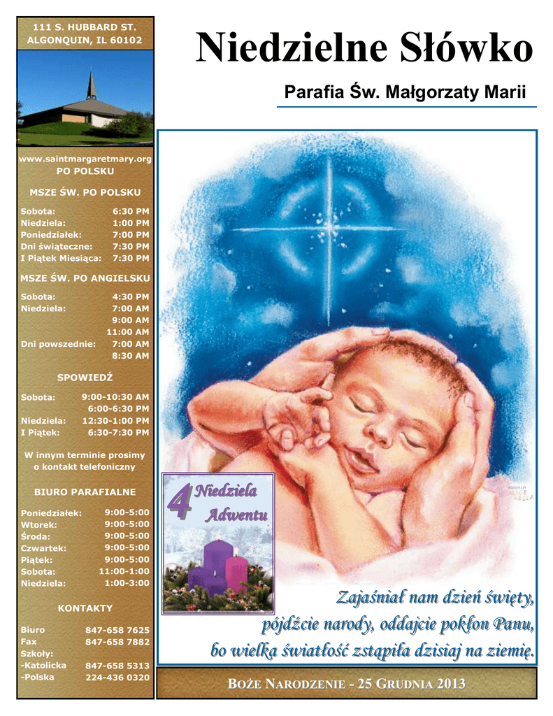 111 S. HUBBARD ST. ALGONQUIN, IL 60102 Niedzielne Słówko Parafia Św. Małgorzaty Marii www.saintmargaretmary.org PO POLSKU MSZE ŚW. PO POLSKU Sobota: Niedziela: Poniedziałek: Dni świąteczne: I Piątek Miesiąca: 6:30 1:00 7:00 7:30 7:30 PM PM PM PM PM MSZE ŚW. PO ANGIELSKU Sobota: Niedziela: Dni powszednie: 4:30 7:00 9:00 11:00 7:00 8:30 PM AM AM AM AM AM SPOWIEDŹ Sobota: Niedziela: I Piątek: 9:00-10:30 AM 6:00-6:30 PM 12:30-1:00 PM 6:30-7:30 PM W innym terminie prosimy o kontakt telefoniczny BIURO PARAFIALNE Poniedziałek: Wtorek: Środa: Czwartek: Piątek: Sobota: Niedziela: 9:00-5:00 9:00-5:00 9:00-5:00 9:00-5:00 9:00-5:00 11:00-1:00 1:00-3:00 KONTAKTY Biuro Fax Szkoły: -Katolicka -Polska 847-658 7625 847-658 7882 847-658 5313 224-436 0320 4 Niedziela Adwentu Zajaśniał nam dzień święty, pójdźcie narody, oddajcie pokłon Panu, bo wielka światłość zstąpiła dzisiaj na ziemię. BOŻE NARODZENIE - 25 GRUDNIA 2013 Niedzielne Słówko Od Proboszcza „Słowo stało się ciałem i zamieszkało między nami.” Drodzy Przyjaciele! Dawno temu w Persji rządził mądry i dobry król. Kochał swój lud. Chciał również zobaczyć jak żyją i jakie mają trudności i kłopoty jego poddani. Dlatego bardzo często przebierał się w ubrania zwykłego ciężko pracującego człowieka, albo żebraka i odwiedzał domy biednych ludzi. Nikt z ludzi, których odwiedzał nie rozpoznał w nim nigdy swojego władcy. Pewnego razu król odwiedził bardzo biednego mężczyznę, który mieszkał w ciemnej suterenie. Razem z nim spożył bardzo prosty i skromny posiłek. Podczas posiłku, król rozmawiał z biednym człowiekiem używając słów bardzo życzliwych i dodających otuchy. Potem oddalił się. Po kilku tygodniach, król odwiedził biednego człowieka ponownie i przyznał się kim jest naprawdę: „ Jestem twoim królem” powiedział. Król spodziewał się, że ubogi człowiek poprosi go o jakieś dary lub inną pomoc, ale biedny mężczyzna tego nie zrobił. Zamiast tego powiedział: „Opuściłeś swój pałac i zaszczyty, aby mnie odwiedzić w tym ciemnym i biednym miejscu. Spożywałeś razem ze mną mój skromny i ubogi posiłek. W ten sposób przyniosłeś do mojego domu i serca radość oraz nadzieję. Innym rozdajesz swoje bogate dary. Ale mnie podarowałeś samego siebie.” Zazwyczaj, kiedy obchodzimy czyjeś urodziny, wtedy wysyłamy tej osobie życzenia i dajemy prezenty. Staramy się to robić z miłością i ze szczerego serca. Ale w Boże Narodzenie sytuacja jest trochę inna. Chrystus, który obchodzi swoje urodziny, daje nam samego siebie. Przychodzi do nas jako małe dziecko, abyśmy byli w stanie Go przyjąć i zaakceptować. Chrystus robi to z miłości do nas. Boże Narodzenie jest więc dniem radości i wdzięczności za piękny dar, którym jest sam Jezus. Otwórzmy więc nasze serca z radością i pokorą , aby przyjąć ten wspaniały Dar. Jezus chce zostać w naszych sercach, w naszych rodzinach i w świecie, w którym żyjemy. Jeśli Go przyjmiemy, wtedy nasze życie wypełni się Bożym Pokojem i Radością. W imieniu naszej franciszkańskiej wspólnoty służącej wam w Parafii Świętej Małgorzaty Marii, życzę Wam Bożego Narodzenia napełnionego Pokojem i Dobrem. Niech Nowonarodzony Król, Jezus Chrystus obdarzy Was swoim błogosławieństwem i łaskami, których potrzebujecie. Niech umocni naszą wiarę, nadzieję i miłość. Niech obdarzy nas odwagą, której potrzebujemy, aby dzielić się radością i nadzieją płynącą z Bożego Narodzenia z ludźmi, których spotykamy na naszej drodze. Błogosławionych i radosnych Świąt Bożego Narodzenia. O. Piotr Sarnicki OFM, Conv Niedzielne Słówko Ogłoszenia Słowa Ewangelii w g św. Łukasza 2,15 - 20 Gdy aniołowie odeszli od nich do nieba, pasterze mówili nawzajem do siebie: "Pójdźmy do Betlejem i zobaczmy, co tam się zdarzyło i o czym nam Pan oznajmił". Udali się też z pośpiechem i znaleźli Maryję, Józefa i Niemowlę, leżące w żłobie. Gdy Je ujrzeli, opowiedzieli o tym, co im zostało objawione o tym Dziecięciu. A wszyscy, którzy to słyszeli, dziwili się temu, co im pasterze powiadali. Lecz Maryja zachowywała wszystkie te sprawy i rozważała je w swoim sercu. A pasterze wrócili wielbiąc i wysławiając Boga za wszystko, co słyszeli i widzieli, jak im to było powiedziane. Służba Liturgiczna Ołtarza Ministranci Wtorek 24.Xll.2013 Pasterka R. Zalewski Służba dla Wszystkich Boże J. Wierzba Służba dla Wszystkich 26.Xll.2013 7:00 Pm Sobota 28.Xll.2013 M. Serafin Służba dla Wszystkich P. Ciężobka G. Ciężobka K. Zięba M. Wojtulewicz Bohater Pachnidła obdarzony jest absolutnym węchem, bezbłędnie rozróżnia zapachy, bo jego ciało jest bezwonne. Przesiąknięci świąteczną tandetą i kiczem, nie jesteśmy w stanie odczuć pierwotnego zapachu Bożego Narodzenia. „Na wigilię jadło się chleb i piło kawę zbożową, siedząc w domku o. Joachim Badeni. pustelniczym” - wspomina T. Młynek E. Bartosz J. Borucki MYŚLI DNIA M. Wojtulewicz J. Kawecki Narodzenie Czwartek K. Talaska G. Dobek Środa 25.Xll.2013 Lektorzy Niedziela M. Wojtulewicz 29.Xll.2013 D. Siwiec A. Klocke A. Talaska Ministrowie Eucharystii G. Dobek M. Wojtulewicz I. Hess J. Adamczyk A. Bednarski Z.Waz G. Rolkowska T. Leszewicz A. Przybylski J. Bednarski I. Szyda T. Leszewicz G. Dobek J. Adamczyk I. Hess G. Rolkowska M. Wojtulewicz B. Rzadkowska D. Rzadkowski T. Leszewicz G. Rolkowska J. Kawecki T. Leszewicz R. Galka I. Hess R. Zalewski J. Wierzba W. Stec M. Wojtulewicz I. Szyda G. Dobek J. Adamczyk Niedzielne Słówko Ogłoszenia Wieczerza Wigilijna W owym czasie wyszło rozporządzenie Cezara Augusta, żeby przeprowadzić spis ludności w całym państwie. Pierwszy ten spis odbył się wówczas, gdy wielkorządcą Syrii był Kwiryniusz. Wybierali się więc wszyscy, aby się dać zapisać, każdy do swego miasta. Udał się także Józef z Galilei, z miasta Nazaret, do Judei, d
