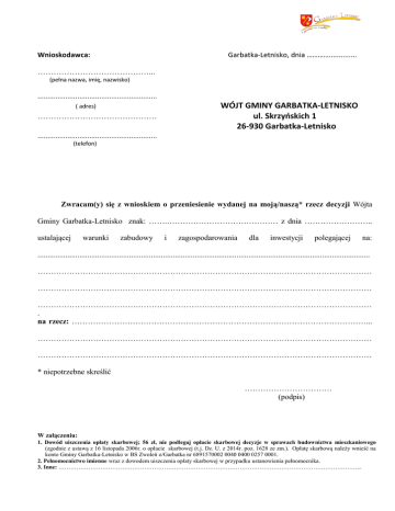 Wnioskodawca: Garbatka-Letnisko, dnia ………….............. ……………………………………... (pełna nazwa, imię, nazwisko) ............................................................ WÓJT GMINY GARBATKA-LETNISKO ul. Skrzyńskich 1 26-930 Garbatka-Letnisko ( adres) ……………………………………… ............................................................ (telefon) Zwracam(y) się z wnioskiem o przeniesienie wydanej na moją/naszą* rzecz decyzji Wójta Gminy Garbatka-Letnisko znak: …….…………………………………… z dnia …………………….. ustalającej warunki zabudowy i zagospodarowania dla inwestycji polegającej na: ....................................................................................................................................................................... ……………………………………………………………………………………………………………… ……………………………………………………………………………………………………………… ……………………………………………………………………………………………………………… . na rzecz: …………………………………………………………………………………………………... ……………………………………………………………………………………………………………… ……………………………………………………………………………………………………………… * niepotrzebne skreślić …………………………… (podpis) W załączeniu: 1. Dowód uiszczenia opłaty skarbowej; 56 zł, nie podlegaj opłacie skarbowej decyzje w sprawach budownictwa mieszkaniowego (zgodnie z ustawą z 16 listopada 2006r. o opłacie skarbowej (t.j. Dz. U. z 2014r. poz. 1628 ze zm.). Opłatę skarbową należy wnieść na konto Gminy Garbatka-Letnisko w BS Zwoleń o/Garbatka nr 6891570002 0040 0400 0257 0001. 2. Pełnomocnictwo imienne wraz z dowodem uiszczenia opłaty skarbowej w przypadku ustanowienia pełnomocnika. 3. Inne: ……………………………………………………………………………………………………………………………………... Garbatka-Letnisko, dnia ………….............. ……………………………………... (pełna nazwa, imię, nazwisko) ............................................................ ( adres) ……………………………………… WÓJT GMINY GARBATKA-LETNISKO ul. Skrzyńskich 1 26-930 Garbatka-Letnisko ............................................................ (telefon) OŚWIADCZENIE W związku ze złożonym przez P. …………….……………..…………………………………… zam. ………………………………………………………………….. wnioskiem o przeniesienie wydanej na jego/ich* rzecz decyzji Wójta Gminy Garbatka-Letnisko z dnia …………………. znak: …….…………………………………… ustalającej warunki zabudowy i zagospodarowania dla inwestycji polegającej na: …………………………………………………………………………………. ....................................................................................................................................................................... …………………………………………………………………………………………………………….. ……………………………………………………………………………………………………………… na moją/naszą* rzecz, oświadczam(y), że przyjmujemy wszystkie warunki zawarte w tej decyzji. …………………………… (podpis)