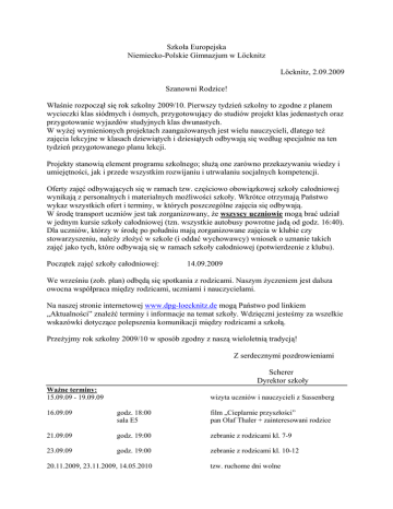 Szkoła Europejska Niemiecko-Polskie Gimnazjum w Löcknitz Löcknitz, 2.09.2009 Szanowni Rodzice! Właśnie rozpoczął się rok szkolny 2009/10. Pierwszy tydzień szkolny to zgodne z planem wycieczki klas siódmych i ósmych, przygotowujący do studiów projekt klas jedenastych oraz przygotowanie wyjazdów studyjnych klas dwunastych. W wyżej wymienionych projektach zaangażowanych jest wielu nauczycieli, dlatego też zajęcia lekcyjne w klasach dziewiątych i dziesiątych odbywają się według specjalnie na ten tydzień przygotowanego planu lekcji. Projekty stanowią element programu szkolnego; służą one zarówno przekazywaniu wiedzy i umiejętności, jak i przede wszystkim rozwijaniu i utrwalaniu socjalnych kompetencji. Oferty zajęć odbywających się w ramach tzw. częściowo obowiązkowej szkoły całodniowej wynikają z personalnych i materialnych możliwości szkoły. Wkrótce otrzymają Państwo wykaz wszystkich ofert i terminy, w których poszczególne zajęcia się odbywają. W środę transport uczniów jest tak zorganizowany, że wszyscy uczniowie mogą brać udział w jednym kursie szkoły całodniowej (tzn. wszystkie autobusy powrotne jadą od godz. 16:40). Dla uczniów, którzy w środę po południu mają zorganizowane zajęcia w klubie czy stowarzyszeniu, należy złożyć w szkole (i oddać wychowawcy) wniosek o uznanie takich zajęć jako tych, które odbywają się w ramach szkoły całodniowej (potwierdzenie z klubu). Początek zajęć szkoły całodniowej: 14.09.2009 We wrześniu (zob. plan) odbędą się spotkania z rodzicami. Naszym życzeniem jest dalsza owocna współpraca między rodzicami, uczniami i nauczycielami. Na naszej stronie internetowej www.dpg-loecknitz.de mogą Państwo pod linkiem „Aktualności” znaleźć terminy i informacje na temat szkoły. Wdzięczni jesteśmy za wszelkie wskazówki dotyczące polepszenia komunikacji między rodzicami a szkołą. Przeżyjmy rok szkolny 2009/10 w sposób zgodny z naszą wieloletnią tradycją! Z serdecznymi pozdrowieniami Scherer Dyrektor szkoły Ważne terminy: 15.09.09 - 19.09.09 wizyta uczniów i nauczycieli z Sassenberg 16.09.09 godz. 18:00 sala E5 film „Cieplarnie przyszłości” pan Olaf Thaler + zainteresowani rodzice 21.09.09 godz. 19:00 zebranie z rodzicami kl. 7-9 23.09.09 godz. 19:00 zebranie z rodzicami kl. 10-12 20.11.2009, 23.11.2009, 14.05.2010 tzw. ruchome dni wolne