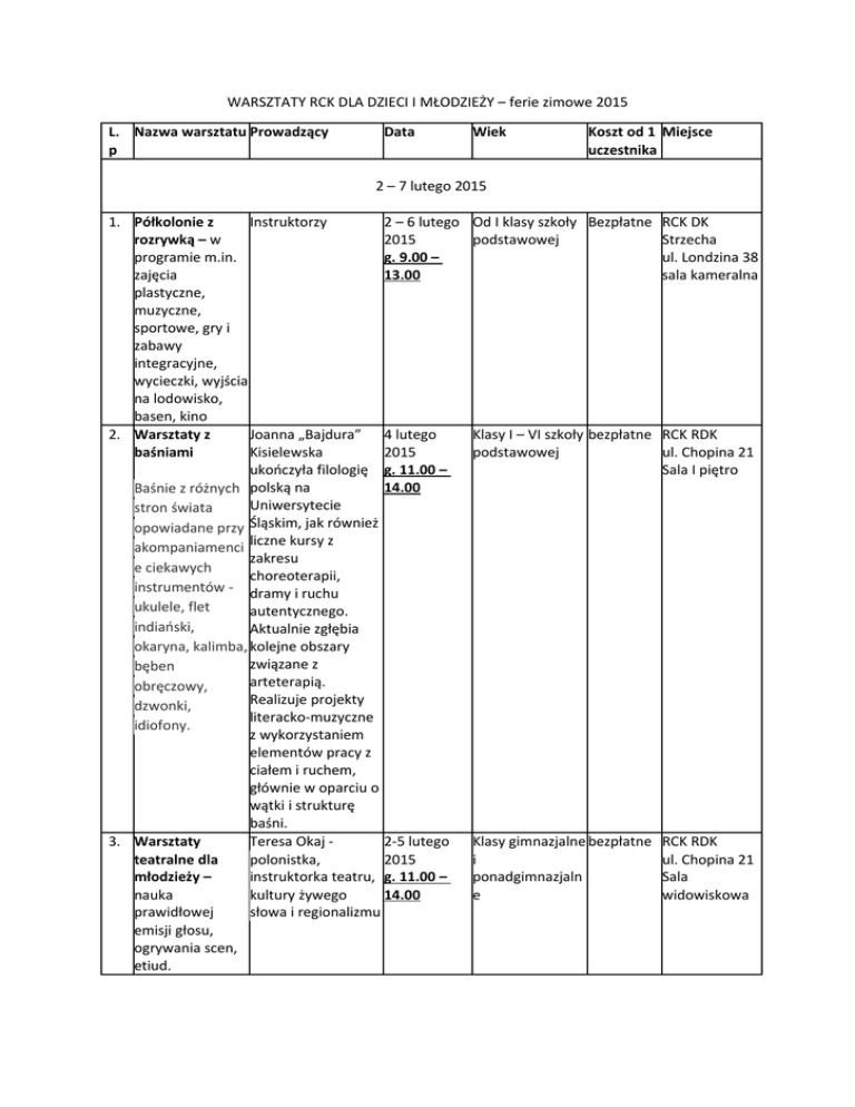 WARSZTATY RCK DLA DZIECI I MŁODZIEŻY – ferie zimowe 2015 L. Nazwa warsztatu Prowadzący p Data Wiek Koszt od 1 Miejsce uczestnika 2 – 7 lutego 2015 1. Półkolonie z Instruktorzy 2 – 6 lutego rozrywką – w 2015 programie m.in. g. 9.00 – zajęcia 13.00 plastyczne, muzyczne, sportowe, gry i zabawy integracyjne, wycieczki, wyjścia na lodowisko, basen, kino 2. Warsztaty z Joanna „Bajdura” 4 lutego baśniami Kisielewska 2015 ukończyła filologię g. 11.00 – 14.00 Baśnie z różnych polską na Uniwersytecie stron świata opowiadane przy Śląskim, jak również akompaniamenci liczne kursy z zakresu e ciekawych choreoterapii, instrumentów - dramy i ruchu ukulele, flet autentycznego. indiański, Aktualnie zgłębia okaryna, kalimba, kolejne obszary związane z bęben arteterapią. obręczowy, Realizuje projekty dzwonki, literacko-muzyczne idiofony. z wykorzystaniem elementów pracy z ciałem i ruchem, głównie w oparciu o wątki i strukturę baśni. 3. Warsztaty Teresa Okaj 2-5 lutego teatralne dla polonistka, 2015 młodzieży – instruktorka teatru, g. 11.00 – nauka kultury żywego 14.00 prawidłowej słowa i regionalizmu emisji głosu, ogrywania scen, etiud. Od I klasy szkoły Bezpłatne RCK DK podstawowej Strzecha ul. Londzina 38 sala kameralna Klasy I – VI szkoły bezpłatne RCK RDK podstawowej ul. Chopina 21 Sala I piętro Klasy gimnazjalne bezpłatne i ponadgimnazjaln e RCK RDK ul. Chopina 21 Sala widowiskowa 4. Warsztaty Manuela Krzykała – taneczne dla instruktor tańca i dzieci i młodzieży choreograf, (w programie prowadzi zespół m.in. układy taneczny „SKAZA” taneczne do muzyki z bajek i filmów animowanych) klasy I-III szkoły podstawowej 5. 9 – 14 lat bezpłatne RCK RDK ul. Chopina 21 Sala 105 Od 15 lat bezpłatne RCK RDK ul. Chopina 21 galeria sztuki/ plener/Instytut Sztuki PWSZ b/o bezpłatne RCK DK Strzecha ul. Londzina 38 b/o Wstęp wolny RCK RDK ul. Chopina 21 Sala widowiskowa b/o Wstęp wolny RCK RDK ul. Chopina 21 Sala widowiskowa 6. 7. 8. 9. 2-6 lutego 2015 g. 10.00 – 11.30 2-6 lutego 2015 g. 11.30 – 13.00 2-6 lutego 2015 g. 13.00 – 14.30 Warsztaty Alicja Ploch-Burda - 3-5 lutego wokalne dla instruktor zajęć 2015 dzieci i młodzieży wokalnych w RCK, g. 10.00 – (w programie prowadzi zespół 12.00 m.in. piosenki z wokalny bajek) PERSPEKTYWA Warsztaty Gabriela Habrom- 5-6 lutego fotograficzne Rokosz 2015 „Powiększenie” – wykładowca g.9.00-13.00 techniki fotografii Państwowej klasycznej Wyższej Szkoły Zawodowej w Raciborzu, która od lat zajmuje się fotografią dokumentalną i artystyczną, preferując techniki fotografii klasycznej. Bajkowe Andrzej Śliwicki – 9-13 lutego warsztaty specjalista do spraw 2015 plastyczne dla kina i plastyki, g. 13.00 – dzieci i młodzieży prowadzi zajęcia 14.30 (m.in. tworzenie plastyczne w RCK kostiumów znanych postaci bajkowych) Pokaz grup Manuela Krzykała, 6 lutego tanecznych i Alicja Ploch-Burda 2015 wokalnych Godz. 18.00 podsumowujący bajkowy tydzień warsztatów z RCK Koncert Koncert zespołów 7 lutego lokalnych The Trast, The 2015 zespołów Messis, Corpus g. 18.00 młodzieżowych bezpłatne RCK RDK ul. Chopina 21 Sala kameralna klasy IV-VI szkoły podstawowej klasy gimnazjalne i ponadgimn. 9 – 13 lutego 10 Warsztaty z . folklorem – w programie nauka regionalnych tańców i pieśni, pogadanki na temat folkloru 11 Warsztaty Break . Dance dla młodzieży Gabriela Horny – choreograf Zespołu Pieśni i Tańca „Mała Strzecha”. Wiele lat związana była z ZPiT Strzecha oraz z DFK w Rudniku. Bartosz Ciuruś – bboy, instruktor tańca break dance 10 lutego 2015 g. 10.00 – 13.00 9 – 11 lutego 2015 g. 10.00 – 12.00 Od 6 lat bezpłatne RCK DK Strzecha ul. Londzina 38 Sala baletowa Młodzież bezpłatne RCK DK gimnazjalna Strzecha i ul. Londzina 38 ponadgimnazjaln Sala a kameralna/sal a baletowa 12 Przygoda z Małgorzata Dziedzic 9 – 10 lutego Młodzież bezpłatne RCK RDK . Tańcem – instruktor tańców 2015 gimnazjalna ul. Chopina 21 Towarzyskim dla standardowych oraz g. 10.00 – i sala I piętro młodzieży latynoamerykańskic 13.00 ponadgimnazjaln (mile widziane h, prowadzi kursy (przybliżony a pary) tańca towarzyskiego czas – oraz Klub Tańca godziny Towarzyskiego trwania MAG-DANCE w RCK. warsztatów dostosowane będą do możliwości uczestników) 13 Warsztaty Izabela Karwot 9-13 lutego 5 – 7 lat bezpłatne RCK RDK . teatralne dla reżyserka teatralna, 2015 ul. Chopina 21 dzieci absolwentka g. 10.00 – Sala kameralna animacji społeczno- 13.00 i widowiskowa kulturalnej 9-13 lutego Klasy II-VI szkoły (specjalność: teatr) 2015 podstawowej w cieszyńskiej filii g. 10.00 – oraz młodzież Uniwersytetu 15.00 gimnazjalna Śląskiego. Prowadzi kilka grup teatralnych w Rybniku i w Raciborzu. Razem ze swoimi aktorami zdobyła i wciąż zdobywa wiele prestiżowych nagród na krajowych i międzynarodowych konkursach, festiwalach i przeglądach teatralnych. 14 Warsztaty . ekologiczne 3 instruktorów 15 Warsztaty . budowy EKOMASZYNY, czyli Mechanizmu Goldberga 16 Warsztaty . wokalne dla młodzieży 3 instruktorów 11-12 lutego 2015 g. 10.00-14.30 (z przerwami) 13 lutego 2015 g. 10.00-12.00 Adam Kosewski 11-13 lutego aranżer, 2015 kompozytor, g. 10.00 – pianista, wokalista, 17.00 pedagog. Doktorant Akademii Muzycznej w Katowicach w zakresie kompozycji. Od października 2009 wykłada na studiach w Instytucie Jazzu prowadząc zajęcia m.in z aranżacji komputerowej, dyrygowania i zespołów wokalnych, a także w Studiu Wokalistyki Estradowej w Katowicach. 17 Koncert Adam Kosewski 13 lutego . powarsztatowy 2015 g. 18.00 18 Powarsztatowy Izabela Karwot . pokaz grup teatralnych 7-12 lat bezpłatne RCK RDK ul. Chopina 21 sala I piętro klasy IV-VI szkoły bezpłatne RCK RDK podst. ul. Chopina 21 i gimnazjum Sala I piętro Młodzież 20 zł gimnazjalna i ponadgimnazjaln a RCK DK Strzecha ul. Londzina 38 Sala kameralna b/o RCK RDK ul. Chopina 21 Sala widowisk