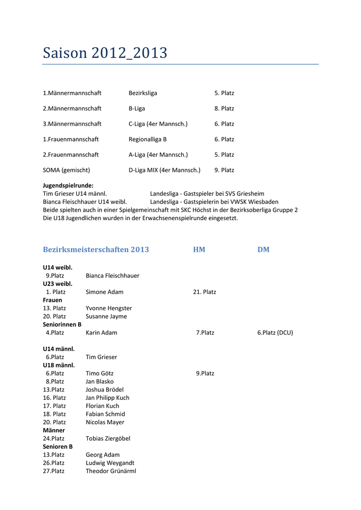 Saison 2012_2013 1.Männermannschaft Bezirksliga 5. Platz 2.Männermannschaft B-Liga 8. Platz 3.Männermannschaft C-Liga (4er Mannsch.) 6. Platz 1.Frauenmannschaft Regionalliga B 6. Platz 2.Frauenmannschaft A-Liga (4er Mannsch.) 5. Platz SOMA (gemischt) D-Liga MIX (4er Mannsch.) 9. Platz Jugendspielrunde: Tim Grieser U14 männl. Landesliga - Gastspieler bei SVS Griesheim Bianca Fleischhauer U14 weibl. Landesliga - Gastspielerin bei VWSK Wiesbaden Beide spielten auch in einer Spielgemeinschaft mit SKC Höchst in der Bezirksoberliga Gruppe 2 Die U18 Jugendlichen wurden in der Erwachsenenspielrunde eingesetzt. Bezirksmeisterschaften 2013 U14 weibl. 9.Platz U23 weibl. 1. Platz Frauen 13. Platz 20. Platz Seniorinnen B 4.Platz U14 männl. 6.Platz U18 männl. 6.Platz 8.Platz 13.Platz 16. Platz 17. Platz 18. Platz 20. Platz Männer 24.Platz Senioren B 13.Platz 26.Platz 27.Platz HM DM Bianca Fleischhauer Simone Adam 21. Platz Yvonne Hengster Susanne Jayme Karin Adam 7.Platz Tim Grieser Timo Götz Jan Blasko Joshua Brödel Jan Philipp Kuch Florian Kuch Fabian Schmid Nicolas Mayer Tobias Ziergöbel Georg Adam Ludwig Weygandt Theodor Grünärml 9.Platz 6.Platz (DCU) Vereinsmeisterschaften 2013 Jugend U10 weibl. 1.Platz U14 weibl. 1.Platz U18 weibl. 1.Platz U14 männl. 1.Platz U18 männl. 1.Platz 2.Platz 3.Platz Laura Gilch Bianca Fleischhauer Jenny Blasko Tim Grieser Joshua Brödel Timo Götz Patrick Hesselbach Vereinsmeisterschaften 2013 Erwachsene Wurden nicht durchgeführt. Schnittbeste Frauen 100 Kugeln: Yvonne Hengster 416 Kegel Schnittbester Männer 100 Kugeln: Jens Hartmann 407 Kegel Schnittbester Männer 200 Kugeln: Tobias Ziergöbel 871 Kegel Bestleistungspokal 200 Kugeln: Tobias Ziergöbel 930 Kegel Bestleistungspokal 100 Kugeln: Susanne Jayme 458 Kegel Aktive Mitglieder (Teilnahme am Spielbetrieb) Adam, Karin; Adam, Simone; Blasko, Jenny; Blasko, Sabine; Eisentraut, Manuela; Fleischhauer, Anja; Fleischhauer, Bianca; Gaab, Simone; Gilch, Melanie; Hengster, Yvonne; Jayme, Susanne; Kreisel, Ute; Reinheimer, Monika; Ruchelka, Hannelore; Steiger, Hannelore; Sternberg, Karin (16) Adam, Georg; Blasko, Jan; Brödel, Joshua; Fleischhauer, Thomas; Gaab, Dieter, Gaab, Rolf; Götz, Timo; Grieser, Tim; Grünärml, Theo; Hartmann, Jens; Hesselbach, Patrick; Ihring, Sören; Jung, Otto; Kuch, Florian; Kuch, Jan Philipp; Kuch, Uwe; Mayer, Nicolas; Schilling, Eric; Schmid, Fabian; Schmid, Thomas; Schmid, Tobias; Sturm, Sven; Weygandt, Ludwig; Ziergöbel, Tobias (24)