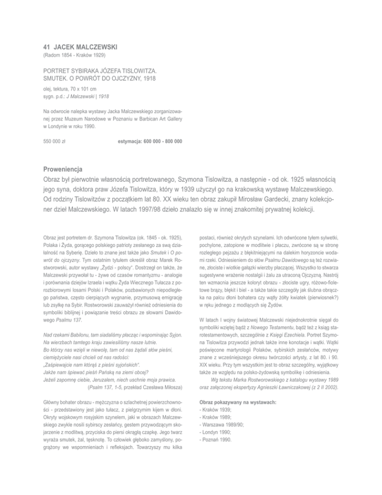 41 JACEK MALCZEWSKI (Radom 1854 - Kraków 1929) PORTRET SYBIRAKA JÓZEFA TISLOWITZA. SMUTEK. O POWRÓT DO OJCZYZNY, 1918 olej, tektura, 70 x 101 cm sygn. p.d.: J Malczewski | 1918 Na odwrocie nalepka wystawy Jacka Malczewskiego zorganizowanej przez Muzeum Narodowe w Poznaniu w Barbican Art Gallery w Londynie w roku 1990. 550 000 z³ estymacja: 600 000 - 800 000 Proweniencja Obraz by³ pierwotnie w³asnoœci¹ portretowanego, Szymona Tislowitza, a nastêpnie - od ok. 1925 w³asnoœci¹ jego syna, doktora praw Józefa Tislowitza, który w 1939 u¿yczy³ go na krakowsk¹ wystawê Malczewskiego. Od rodziny Tislowitzów z pocz¹tkiem lat 80. XX wieku ten obraz zakupi³ Miros³aw Gardecki, znany kolekcjoner dzie³ Malczewskiego. W latach 1997/98 dzie³o znalaz³o siê w innej znakomitej prywatnej kolekcji. Obraz jest portretem dr. Szymona Tislowitza (ok. 1845 - ok. 1925), Polaka i ¯yda, gor¹cego polskiego patrioty zes³anego za sw¹ dzia³alnoœæ na Syberiê. Dzie³o to znane jest tak¿e jako Smutek i O powrót do ojczyzny. Tym ostatnim tytu³em okreœli³ obraz Marek Rostworowski, autor wystawy „¯ydzi - polscy“. Dostrzeg³ on tak¿e, ¿e Malczewski przywo³a³ tu - ¿ywe od czasów romantyzmu - analogie i porównania dziejów Izraela i w¹tku ¯yda Wiecznego Tu³acza z porozbiorowymi losami Polski i Polaków, pozbawionych niepodleg³ego pañstwa, czêsto cierpi¹cych wygnanie, przymusow¹ emigracjê lub zsy³kê na Sybir. Rostworowski zauwa¿y³ równie¿ odniesienia do symboliki biblijnej i powi¹zanie treœci obrazu ze s³owami Dawidowego Psalmu 137. Nad rzekami Babilonu, tam siadaliœmy p³acz¹c i wspominaj¹c Syjon. Na wierzbach tamtego kraju zawiesiliœmy nasze lutnie. Bo którzy nas wziêli w niewolê, tam od nas ¿¹dali s³ów pieœni, ciemiê¿yciele nasi chcieli od nas radoœci: „Zaœpiewajcie nam któr¹œ z pieœni syjoñskich“. Jak¿e nam œpiewaæ pieœñ Pañsk¹ na ziemi obcej? Je¿eli zapomnê ciebie, Jeruzalem, niech uschnie moja prawica. (Psalm 137, 1-5, przek³ad Czes³awa Mi³osza) G³ówny bohater obrazu - mê¿czyzna o szlachetnej powierzchownoœci - przedstawiony jest jako tu³acz, z pielgrzymim kijem w d³oni. Okryty wojskowym rosyjskim szynelem, jaki w obrazach Malczewskiego zwykle nosili sybirscy zes³añcy, gestem przywodz¹cym skojarzenie z modlitw¹, przyciska do piersi okr¹g³¹ czapkê. Jego twarz wyra¿a smutek, ¿al, têsknotê. To cz³owiek g³êboko zamyœlony, pogr¹¿ony we wspomnieniach i refleksjach. Towarzyszy mu kilka postaci, równie¿ okrytych szynelami. Ich odwrócone ty³em sylwetki, pochylone, zatopione w modlitwie i p³aczu, zwrócone s¹ w stronê rozleg³ego pejza¿u z b³êkitniej¹cymi na dalekim horyzoncie wodami rzeki. Odniesieniem do s³ów Psalmu Dawidowego s¹ te¿ rozwiane, z³ociste i wiotkie ga³¹zki wierzby p³acz¹cej. Wszystko to stwarza sugestywne wra¿enie nostalgii i ¿alu za utracon¹ Ojczyzn¹. Nastrój ten wzmacnia jeszcze koloryt obrazu - z³ociste ugry, ró¿owo-fioletowe br¹zy, b³êkit i biel - a tak¿e takie szczegó³y jak œlubna obr¹czka na palcu d³oni bohatera czy w¹t³y ¿ó³ty kwiatek (pierwiosnek?) w rêku jednego z modl¹cych siê ¯ydów. W latach I wojny œwiatowej Malczewski niejednokrotnie siêga³ do symboliki wziêtej b¹dŸ z Nowego Testamentu, b¹dŸ te¿ z ksi¹g starotestamentowych, szczególnie z Ksiêgi Ezechiela. Portret Szymona Tislowitza przywodzi jednak tak¿e inne konotacje i w¹tki. W¹tki poœwiêcone martyrologii Polaków, sybirskich zes³añców, motywy znane z wczeœniejszego okresu twórczoœci artysty, z lat 80. i 90. XIX wieku. Przy tym wszystkim jest to obraz szczególny, wyj¹tkowy tak¿e ze wzglêdu na polsko-¿ydowsk¹ symbolikê i odniesienia. Wg tekstu Marka Rostworowskiego z katalogu wystawy 1989 oraz za³¹czonej ekspertyzy Agnieszki £awniczakowej (z 2 II 2002). Obraz pokazywany na wystawach: - Kraków 1939; - Kraków 1989; - Warszawa 1989/90; - Londyn 1990; - Poznañ 1990. Obraz opisany i reprodukowany: - Jacek Malczewski 1855-1929, [kat.] Towarzystwo Przyjació³ Sztuk Piêknych w Krakowie, lipiec-sierpieñ-wrzesieñ 1939, s. 17, nr kat. 157 (pt. Smutek; w³. dra Józefa Tislowitza); - ¯ydzi - polscy. Katalog; wstêp M. Rostworowski, J. Horn, J. Tomaszewski, Wystawê przygotowali D. Dec, K. Moczulska, M. Rostworowski (autor scenariusza), J. Wa³ek, Muzeum Narodowe w Krakowie, Kraków czerwiec - sierpieñ 1989, s. 21, 71, nr kat. 689, il. barwna V (jako: O powrót do ojczyzny, portret Józefa Tislowitza; w³. Miros³aw Gardecki); - Malczewski: A Vision of Poland [ katalog oprac. A. £awniczakowa], Barbican Art Gallery, National Museum, Poznañ, Londyn 1990, s. 111, nr kat. 86, il. (w³. Miros³aw Gardecki); - A. £awniczakowa, Jacek Malczewski. Wystawa dzie³ z lat 18901926, Muzeum Narodowe w Poznaniu, Poznañ 1990, s.114, nr kat. 86 (w³. Miros³aw Gardecki); - ¯ydzi w Polsce. Obraz i s³owo, Czêœæ I Obraz, pod redakcj¹ M. Rostworowskiego, Wyd. Interpress, Warszawa 1993; s. 185, nr kat. 228, il. barwna (w³. Miros³aw Gardecki); - T. Grzybkowska, Œwiat obrazów Jacka Malczewskiego, Warszawa 1996, s. 144, il. 15.