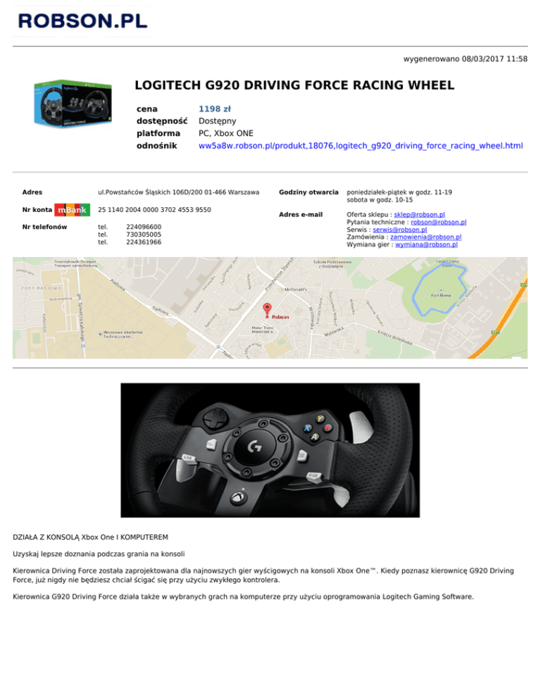 wygenerowano 08/03/2017 11:58 LOGITECH G920 DRIVING FORCE RACING WHEEL cena 1198 zł dostępność Dostępny platforma PC, Xbox ONE odnośnik ww5a8w.robson.pl/produkt,18076,logitech_g920_driving_force_racing_wheel.html Adres ul.Powstańców Śląskich 106D/200 01-466 Warszawa Nr konta 25 1140 2004 0000 3702 4553 9550 Nr telefonów tel. 224096600 tel. 730305005 tel. 224361966 Godziny otwarcia poniedziałek-piątek w godz. 11-19 sobota w godz. 10-15 Adres e-mail Oferta sklepu : [email protected] Pytania techniczne : [email protected] Serwis : [email protected] Zamówienia : [email protected] Wymiana gier : [email protected] DZIAŁA Z KONSOLĄ Xbox One I KOMPUTEREM Uzyskaj lepsze doznania podczas grania na konsoli Kierownica Driving Force została zaprojektowana dla najnowszych gier wyścigowych na konsoli Xbox One™. Kiedy poznasz kierownicę G920 Driving Force, już nigdy nie będziesz chciał ścigać się przy użyciu zwykłego kontrolera. Kierownica G920 Driving Force działa także w wybranych grach na komputerze przy użyciu oprogramowania Logitech Gaming Software. Mechanizm siłowego sprzężenia zwrotnego z napędem dwusilnikowym Poczuj każdą zmianę masy lub poślizg opony Poczuj zachowanie opon na każdym zakręcie i na różnych podłożach. Sprawia to, że odczujesz wszystkie efekty nadsterowności, podsterowności i poślizgu. Mechanizm siłowego sprzężenia zwrotnego o dwóch wydajnych silnikach symuluje działanie różnych sił, aby umożliwić precyzyjną reakcję. Zaprojektowana do pokonywania długich dystansów Materiały o wyścigowej jakości, które sprawdzą się w każdych warunkach Kierownica Driving Force została stworzona pod kątem wymagającego ścigania się i długoterminowej niezawodności. Łożyska kulowe z wytrzymałej stali w drążku kierowniczym oraz łopatkowe dźwignie zmiany biegów ze stali nierdzewnej i pedały sprawiają, że kierownica wyścigowa G920 pokona nawet najdłuższe dystanse. Kierownica jest pokryta ręcznie szytą skórą o wysokiej jakości, sprawiając wrażenie kierownicy szybkiego samochodu wyścigowego. Zapewnia to wygodniejsze użycie przez długi czas. Spiralne koła zębate zapobiegające zacięciom Precyzja sterowania Spiralne koła zębate zostały zaprojektowane na podstawie kół zębatych stosowanych w skrzyniach biegów, aby zredukować niepożądane hałasy i wibracje. Naciąg zapobiegający zacięciom zapewnia odpowiednie napięcie kierownicy i pedałów, maksymalizując kontrolę. Kierownica umożliwia wyjątkowo płynne i ciche sterowanie. Kierownicę wyścigową G920 Driving Force Racing Wheel wyposażono w długowieczny i niezawodny czujnik sterowania z efektem Halla, który używa pól magnetycznych do wykrywania pozycji kierownicy. Łatwo dostępne elementy sterujące grą Sterowanie pod ręką Uzyskaj jeszcze więcej kontroli nad konfiguracją samochodu. Kierownica G920 Racing Wheel ma wbudowaną konsolę D-Pad i przyciski konsoli, dzięki czemu są zawsze dostępne pod ręką. Półautomatyczne łopatkowe dźwignie zmiany biegów umożliwiają płynną i precyzyjną zmianę biegów podczas pokonywania ostrych zakrętów i długich prostych. Szybko reagujący moduł pedałów Możliwość regulacji w celu maksymalnej kontroli Zachowaj bardziej realistyczną pozycję podczas prowadzenia dzięki oddzielnemu modułowi pedałów ze zintegrowanymi pedałami gazu, hamulca i sprzęgła. Kierownica G920 Driving Force umożliwia wygodne przyspieszanie, hamowanie i zmianę biegów, zapewniając wrażenia prawdziwego samochodu. Nieliniowy pedał hamulca symuluje działanie układu hamulcowego reagującego na siłę nacisku, co zapewnia lepsze doznania i bardziej precyzyjne hamowanie. Aby uzyskać jeszcze większą kontrolę, można zmienić pozycję pedałów w celu łatwiejszego wykonywania manewrów palcami stopy i piętą. Gumowe stopki dla twardych powierzchni i opatentowany składany system zaczepów do dywanu sprawia, że pedały pozostają dokładnie na swoim miejscu. 900-stopniowy kąt obrotu Realistyczne wykonywanie zakrętów na torze Kąt obrotu kierownicy G920 Driving Force o 900 stopni między skrajnymi pozycjami oznacza, że możesz wykonać dwa i pół obrotu, przekładając ręce na szerokich zakrętach. Jest to identyczny kąt obrotu jak w prawdziwym samochodzie. Wymagania systemowe ● ● ● ● Xbox One™ Zasilany port USB LUB Windows® 10, Windows® 8.1, Windows 8 lub Windows 7 Zasilany port USB Połączenie internetowe i 150 MB wolnego miejsca na dysku twardym (do opcjonalnego pobrania oprogramowania) Gry obsługujące kierownicę wyścigową Logitech® ze sprzężeniem zwrotnym Zawartość opakowania ● ● ● Kierownica Pedały Zasilacz Dokumentacja Dane fizyczne Kierownica: Wysokość: 270 mm (10,63 cala) Szerokość: 260 mm (10,24 cala) Głębokość: 278 mm (10,94 cala) Waga bez kabli: 2,25 kg (4,96 funta) ❍ ❍ ❍ ❍ ● ● Pedały: Wysokość: 167 mm (6,57 cala) Szerokość: 428,5 mm (16,87 cala) Głębokość: 311 mm (12,24 cala) Waga bez kabli: 3,1 kg (6,83 funta) ❍ ❍ ❍ ❍ Dane techniczne ● ● ● ● ● ● ● Obsługa oprogramowania (w momencie wprowadzenia do sprzedaży): Logitech Gaming Software Typ połączenia: USB USB VID_PID: 046D_C262 Protokół USB: USB 2.0 Szybkość złącza USB: Full Speed Kierownica Obrót: 900 stopni między skrajnymi pozycjami Czujnik sterowania z efektem Halla Mechanizm siłowego sprzężenia zwrotnego z napędem dwusilnikowym Zabezpieczenie przed przegrzewaniem Pedały Nieliniowy pedał hamulca Opatentowany system zaczepów do dywanu Teksturowana podstawka pod stopy Automatyczna kalibracja Materiały Ramiona kierownicy: anodyzowane aluminium Pokrycie kierownicy: ręcznie szyta skóra Drążek kierowniczy: stal Łopatki do zmiany biegów: polerowana stal nierdzewna Zaciski mocujące: nylon wypełniony szkłem Ramy i podpórki pedałów: stal walcowana na zimno Powierzchnia pedałów: polerowana stal nierdzewna Tuleje tłoków peda