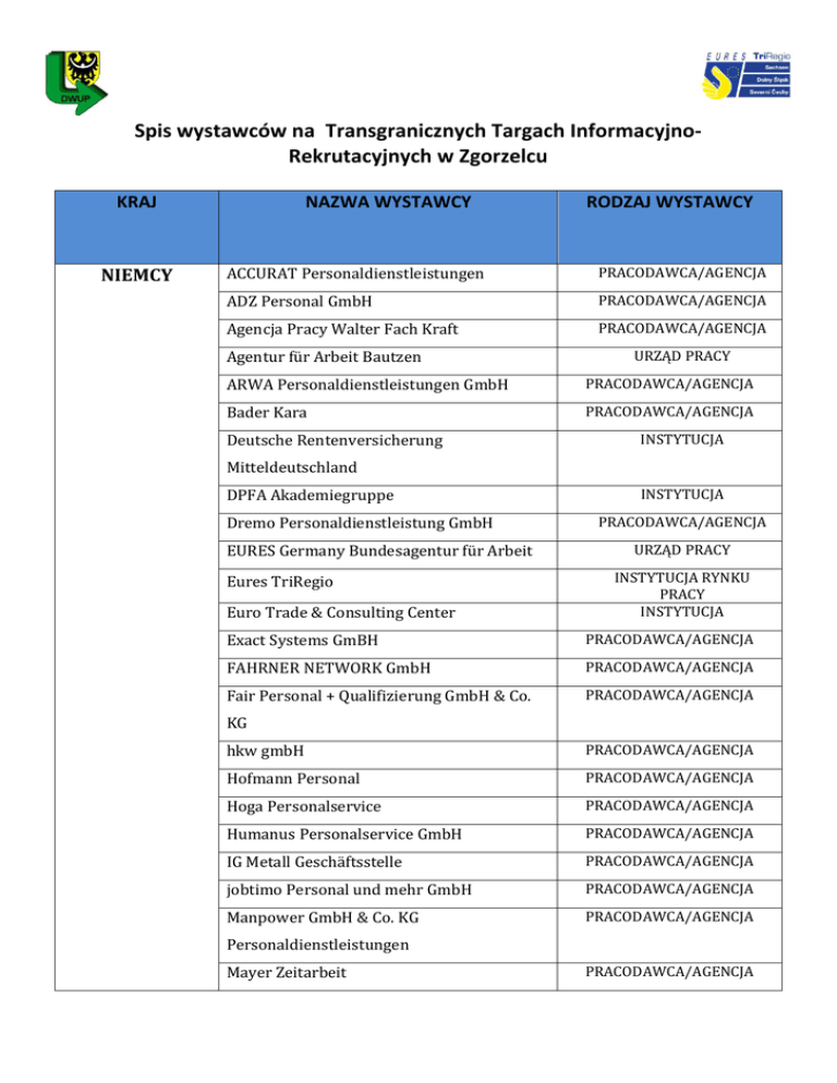Spis wystawców na Transgranicznych Targach InformacyjnoRekrutacyjnych w Zgorzelcu KRAJ NIEMCY NAZWA WYSTAWCY RODZAJ WYSTAWCY ACCURAT Personaldienstleistungen PRACODAWCA/AGENCJA ADZ Personal GmbH PRACODAWCA/AGENCJA Agencja Pracy Walter Fach Kraft PRACODAWCA/AGENCJA Agentur für Arbeit Bautzen URZĄD PRACY ARWA Personaldienstleistungen GmbH PRACODAWCA/AGENCJA Bader Kara PRACODAWCA/AGENCJA Deutsche Rentenversicherung INSTYTUCJA Mitteldeutschland DPFA Akademiegruppe Dremo Personaldienstleistung GmbH EURES Germany Bundesagentur für Arbeit Eures TriRegio Euro Trade & Consulting Center INSTYTUCJA PRACODAWCA/AGENCJA URZĄD PRACY INSTYTUCJA RYNKU PRACY INSTYTUCJA Exact Systems GmBH PRACODAWCA/AGENCJA FAHRNER NETWORK GmbH PRACODAWCA/AGENCJA Fair Personal + Qualifizierung GmbH & Co. PRACODAWCA/AGENCJA KG hkw gmbH PRACODAWCA/AGENCJA Hofmann Personal PRACODAWCA/AGENCJA Hoga Personalservice PRACODAWCA/AGENCJA Humanus Personalservice GmbH PRACODAWCA/AGENCJA IG Metall Geschäftsstelle PRACODAWCA/AGENCJA jobtimo Personal und mehr GmbH PRACODAWCA/AGENCJA Manpower GmbH & Co. KG PRACODAWCA/AGENCJA Personaldienstleistungen Mayer Zeitarbeit PRACODAWCA/AGENCJA Meyer Fachowcy PRACODAWCA/AGENCJA Multimon Montage GmbH PRACODAWCA/AGENCJA Olympia GmbH Riesa PRACODAWCA/AGENCJA Sport- & Freizeitzentrum Partner Personaldienste GmbH PRACODAWCA/AGENCJA Personal Konzept GmbH PRACODAWCA/AGENCJA Private Arbeitsver-mittlung Großenhain PRACODAWCA/AGENCJA Randstad Deutschland PRACODAWCA/AGENCJA Riele Personaldienstleistungen und PRACODAWCA/AGENCJA Büroservice GmbH SAQ PRACODAWCA/AGENCJA Sächsische Aufbau-und Qualifizierungsgesellschaft mbh Sepona GmbH Servicestelle für ausländische Fachkräfte im PRACODAWCA/AGENCJA INSTYTUCJA Landkreis Görlitz SQS Software Quality Systems AG PRACODAWCA/AGENCJA Stuck & Bau GRUPPE PRACODAWCA/AGENCJA teamkompetent GmbH PRACODAWCA/AGENCJA Teleperformance Germany S. à r. l. & Co. KG PRACODAWCA/AGENCJA TEMPTON Personaldienstleistungen GmbH PRACODAWCA/AGENCJA THOMAG GmbH PRACODAWCA/AGENCJA TLP GmbH PRACODAWCA/AGENCJA TREMONIA Dienstleistungsges. mbH PRACODAWCA/AGENCJA TS-Personaldienstleistung PRACODAWCA/AGENCJA Unique Personalservice GmbH PRACODAWCA/AGENCJA WS Montage- und Personalmanagement PRACODAWCA/AGENCJA GmbH Zimmermann Personalservice GmbH CZECHY EURES ČR PRACODAWCA/AGENCJA URZĄD PRACY Gall s.r.o. Liberec PRACODAWCA/AGENCJA Houfek a.s. PRACODAWCA/AGENCJA LUTO Automotive CZ, s.r.o. PRACODAWCA/AGENCJA Oblastní nemocnice Náchod a.s. PRACODAWCA/AGENCJA OSPRO MB, spol. s r.o. POLSKA Centrum Edukacji i Pracy Młodzieży OHP w Jeleniej Górze Centrum Informacji i Planowania Kariery PRACODAWCA/AGENCJA INSTYTUCJA RYNKU PRACY URZĄD PRACY Zawodowej Dolnośląscy Pracodawcy Eures INSTYTUCJA RYNKU PRACY URZĄD PRACY Komenda Powiatowa Policji w Zgorzelcu PRACODAWCA Koordynacja Systemów Zabezpieczenia URZĄD PRACY Społecznego Państwowa Wyższa Szkoła Zawodowa im. SZKOŁA Witelona w Legnicy Powiatowy Urząd Pracy w Zgorzelcu URZĄD PRACY Powiatowy Urząd Pracy w Nysie URZĄD PRACY